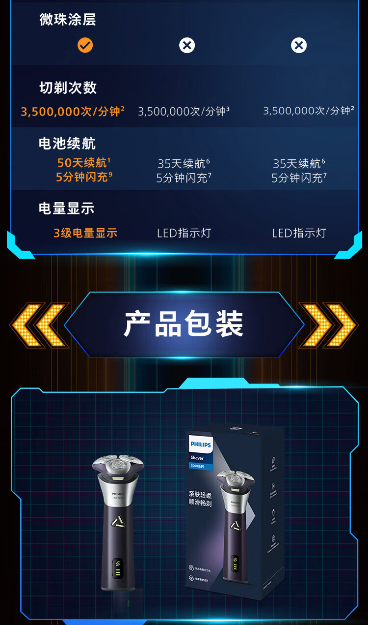 飞利浦(PHILIPS)电动剃须刀旋风3系PRO刮胡刀 风驰切剃6D浮动刀头 生日礼物送男生男友老公父亲