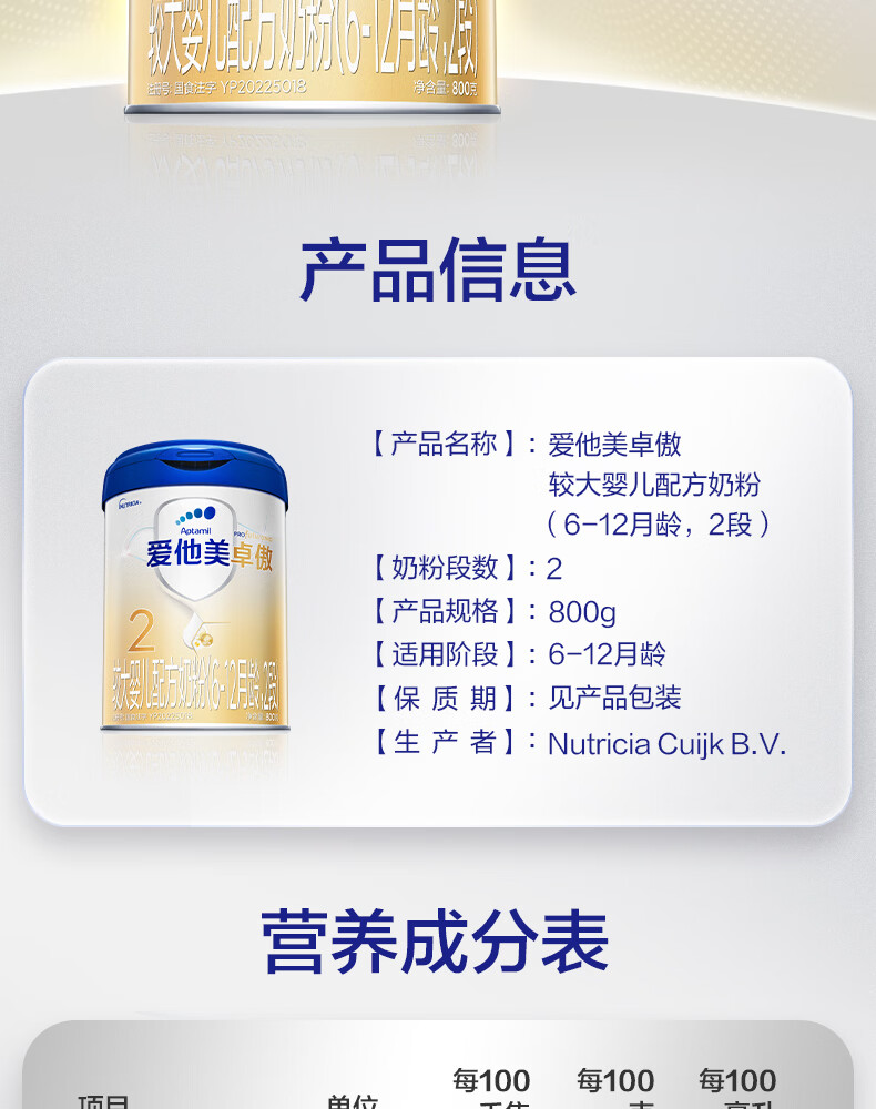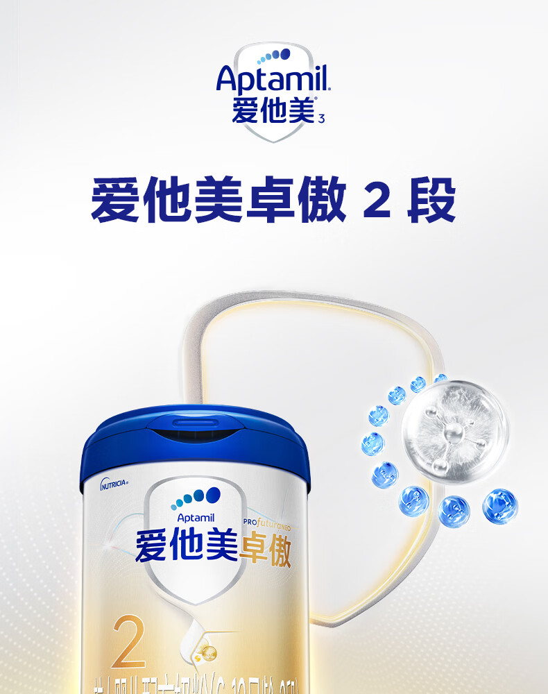 爱他美(Aptamil)卓傲2段较大婴儿配方奶粉(6—12月) 800克*6罐(0元入会)