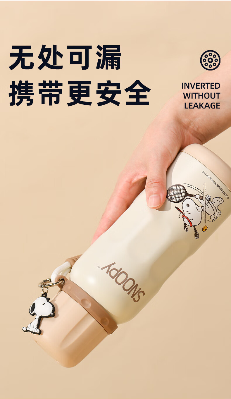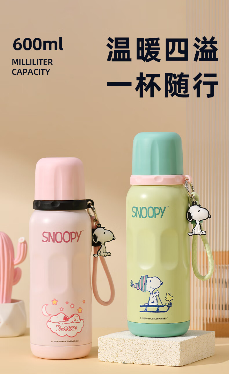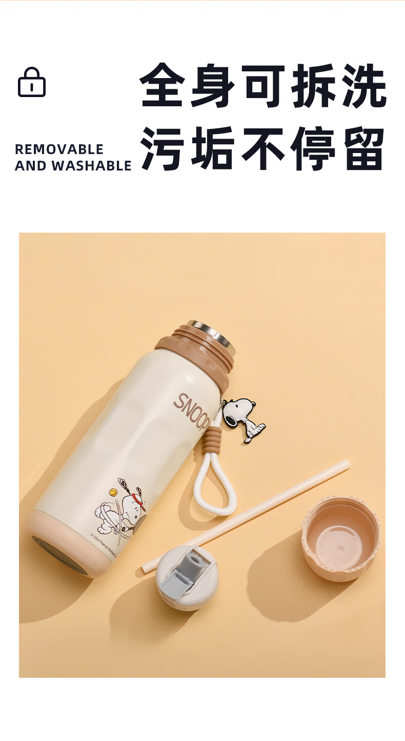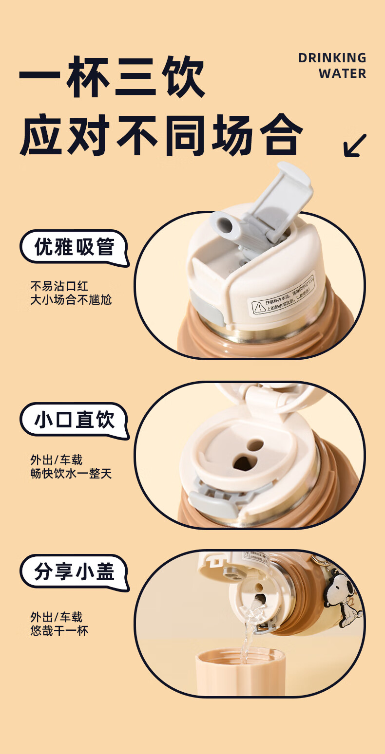 史努比保温杯儿童316不锈钢男女学生上学专用大容量耐摔便携吸管水杯子 浅咖色【一杯三饮+316内胆】600ml