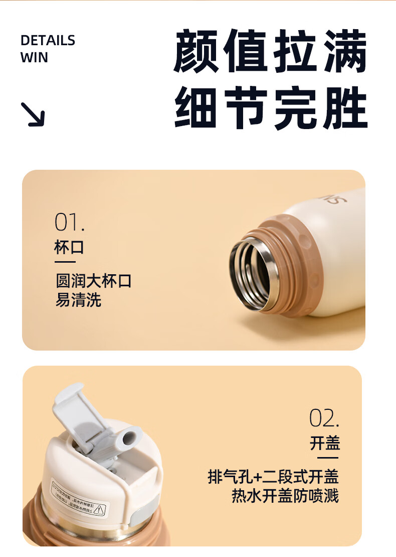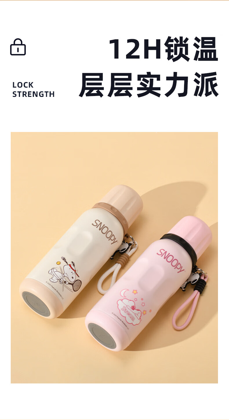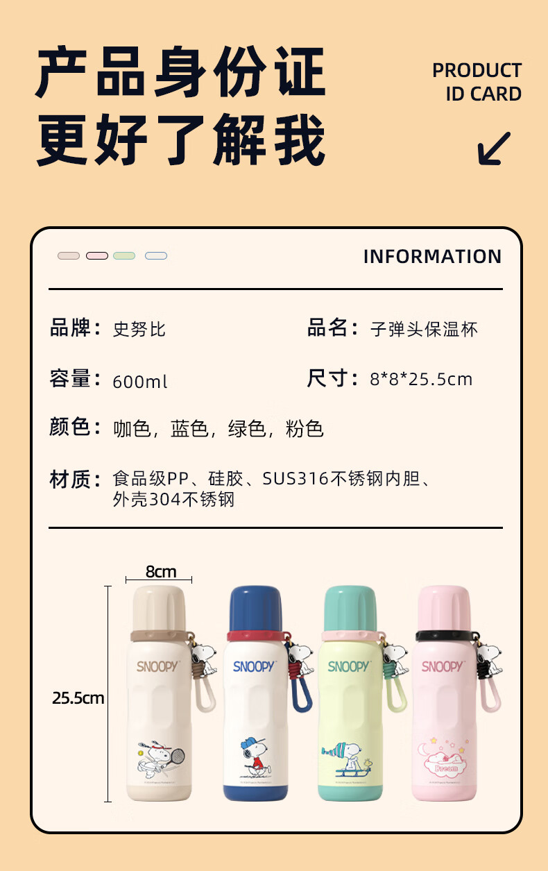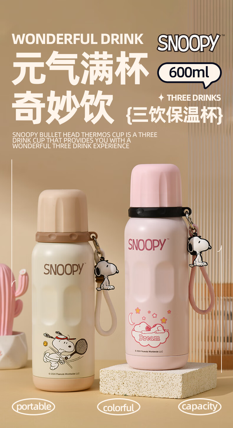 史努比保温杯儿童316不锈钢男女学生上学专用大容量耐摔便携吸管水杯子 浅咖色【一杯三饮+316内胆】600ml