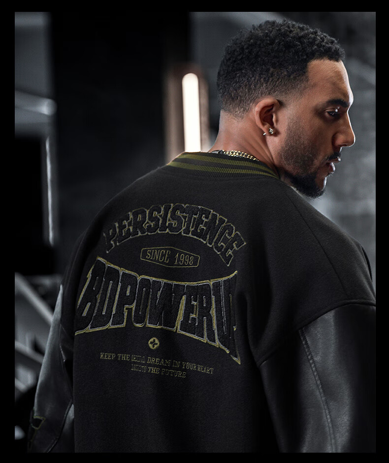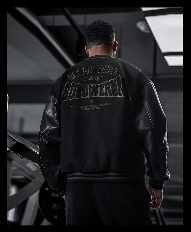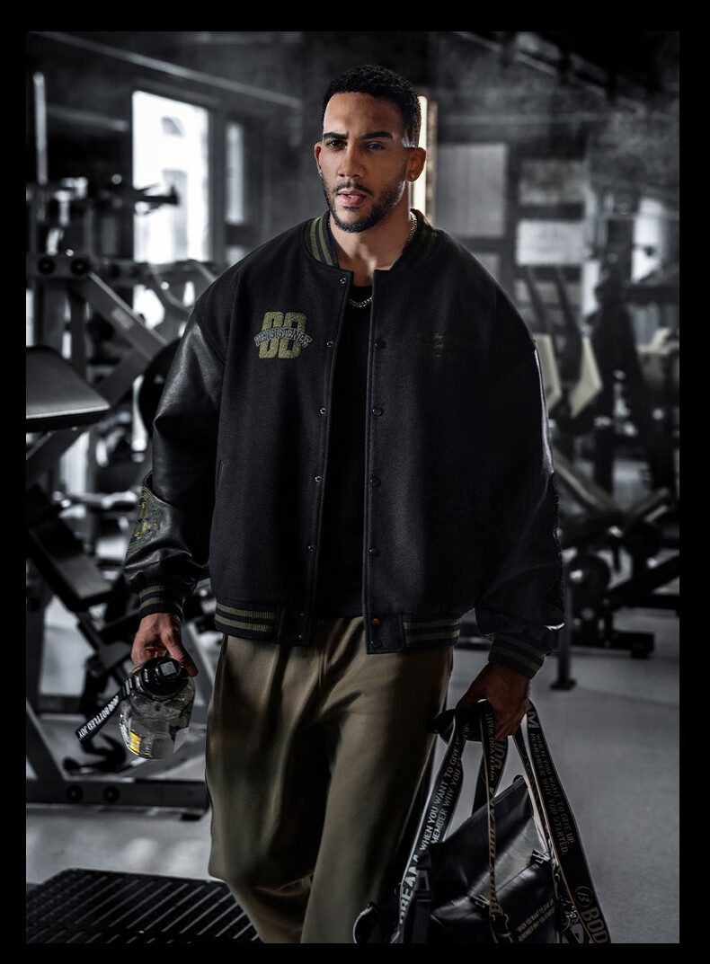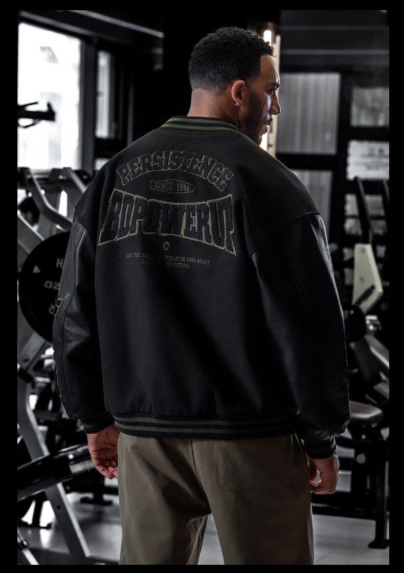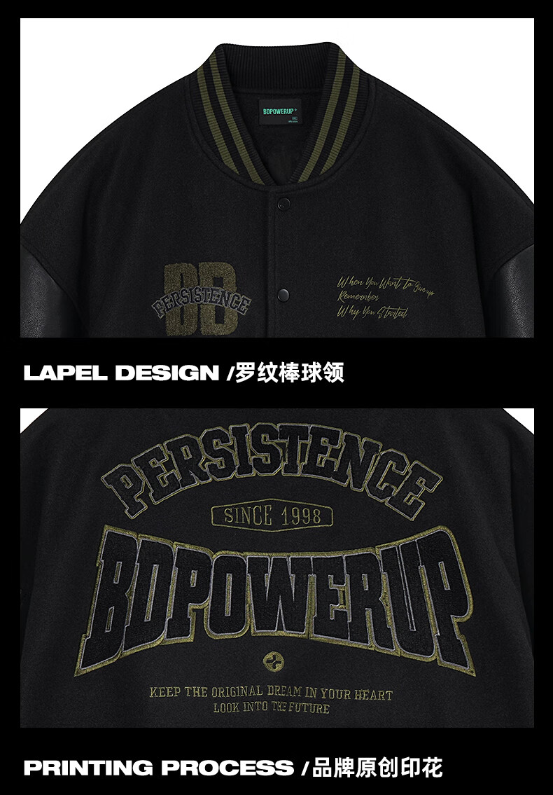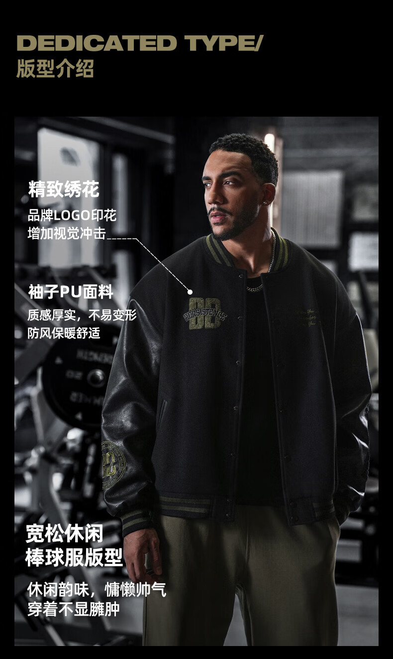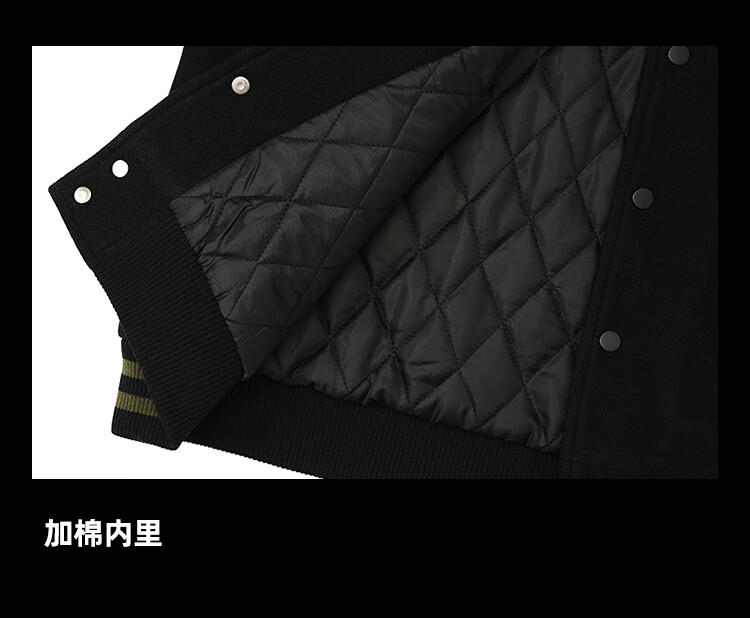 BD.POWER UP+美式夹棉加厚毛呢棒球服外套男冬季休闲宽松刺绣运动夹克棉服外套 黑色 XL 170-190斤