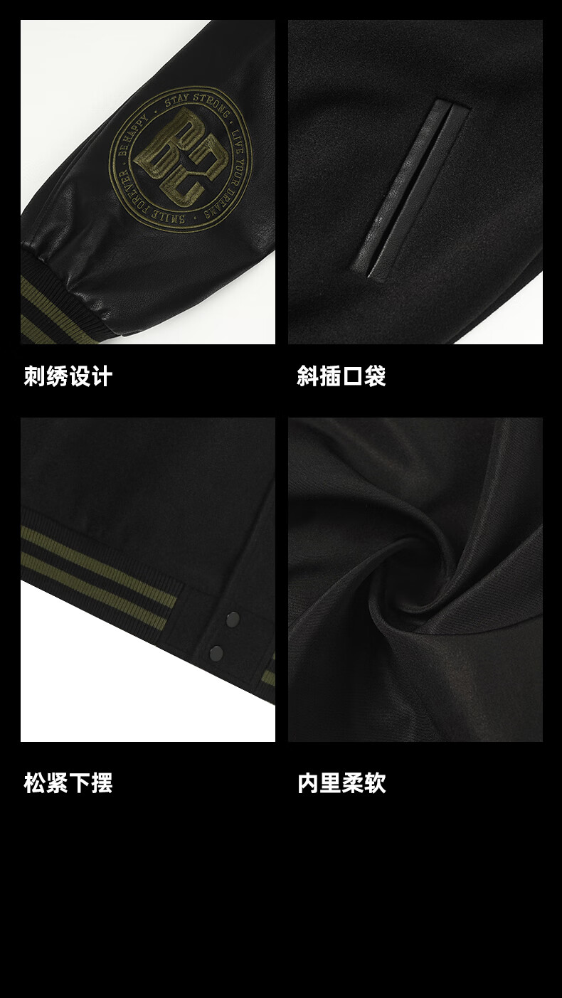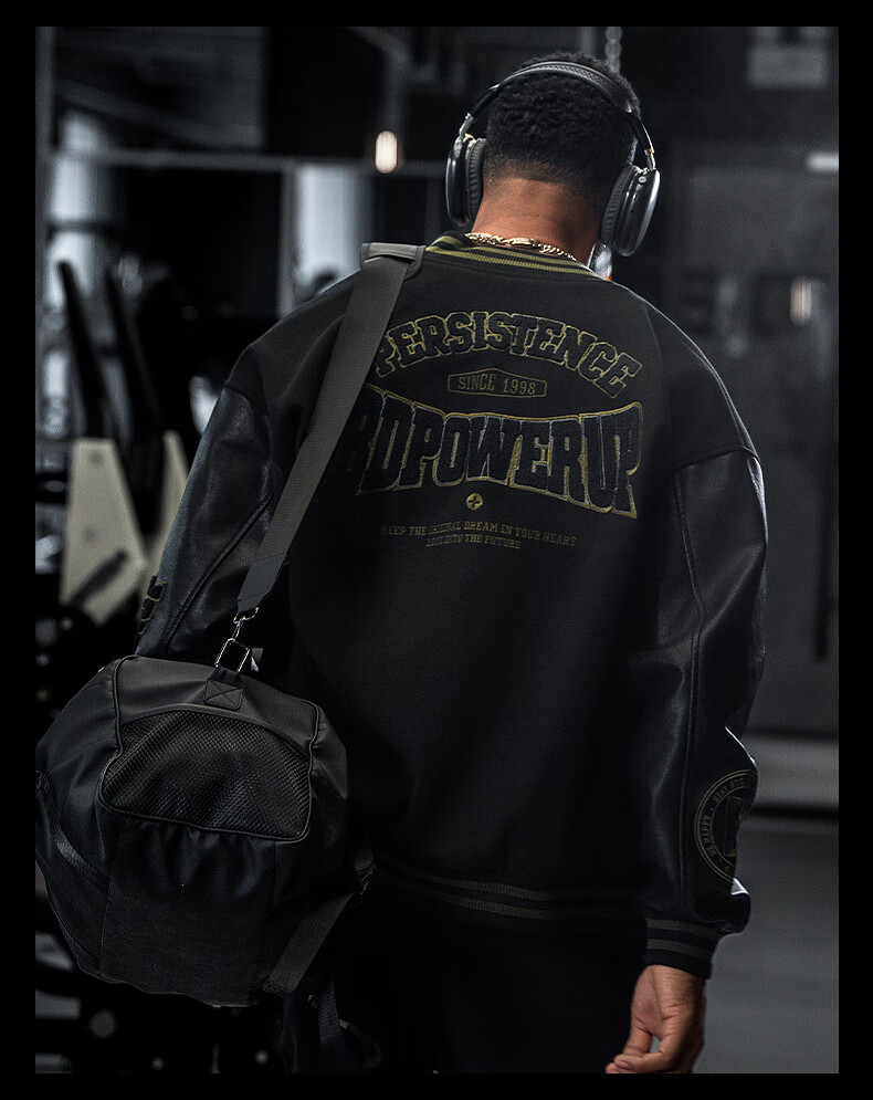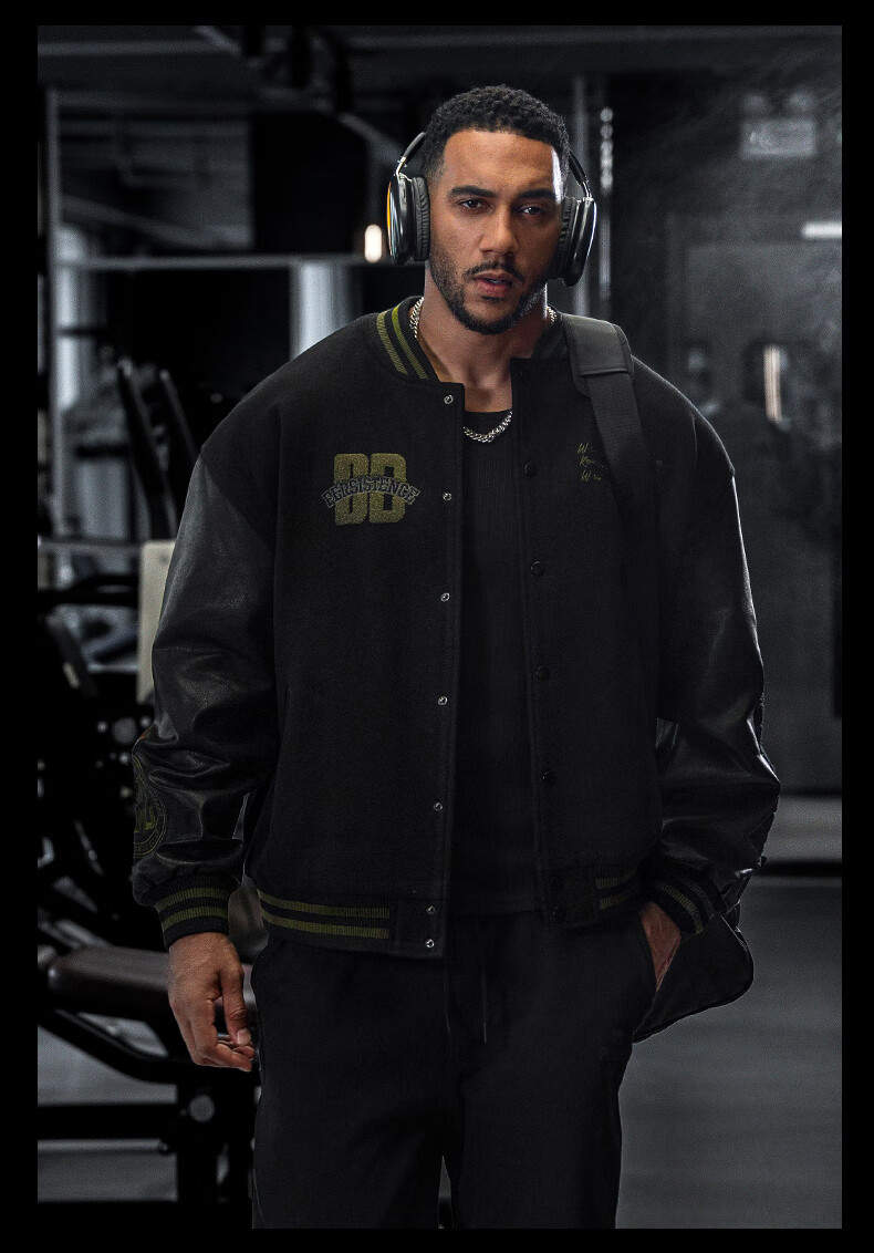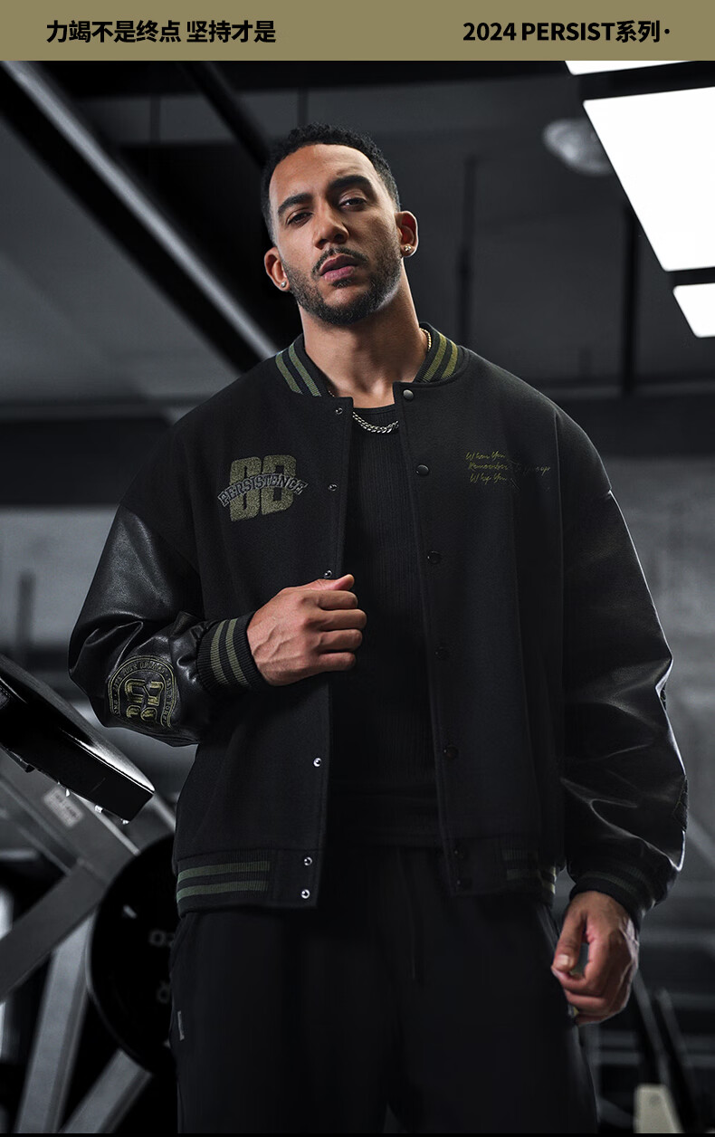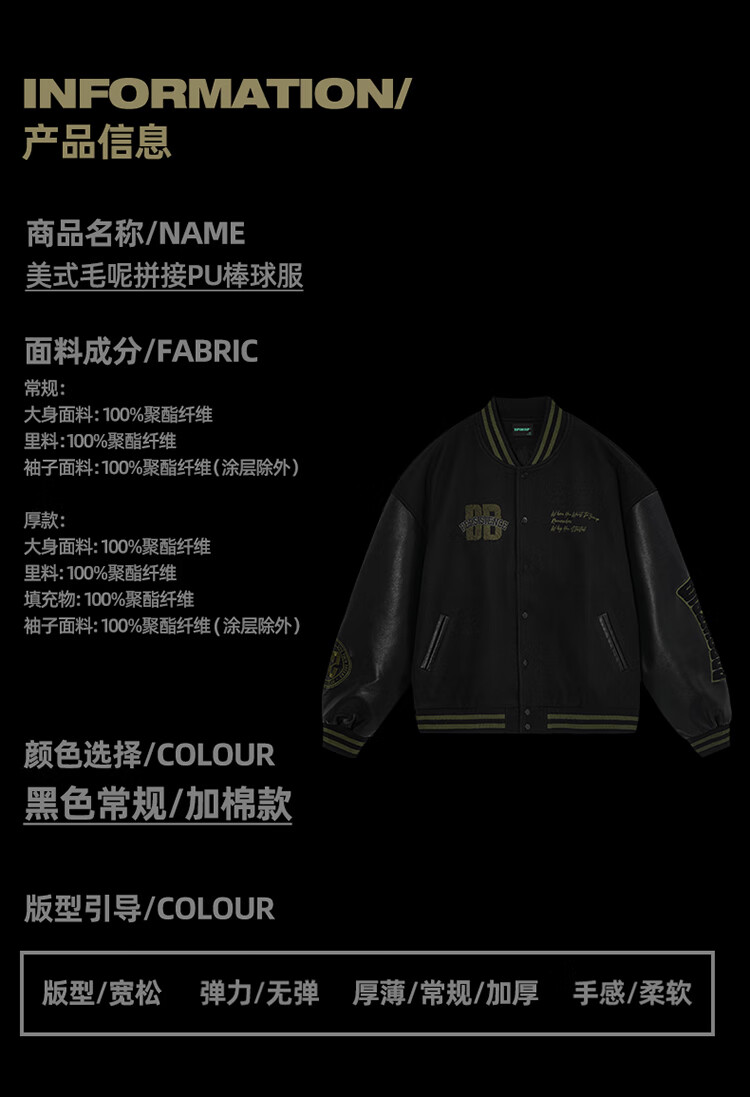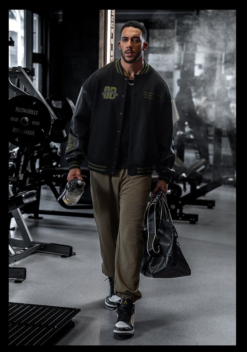 BD.POWER UP+美式夹棉加厚毛呢棒球服外套男冬季休闲宽松刺绣运动夹克棉服外套 黑色 XL 170-190斤