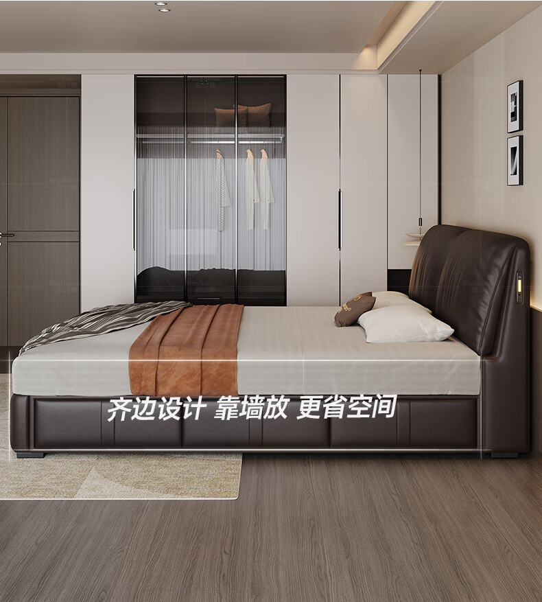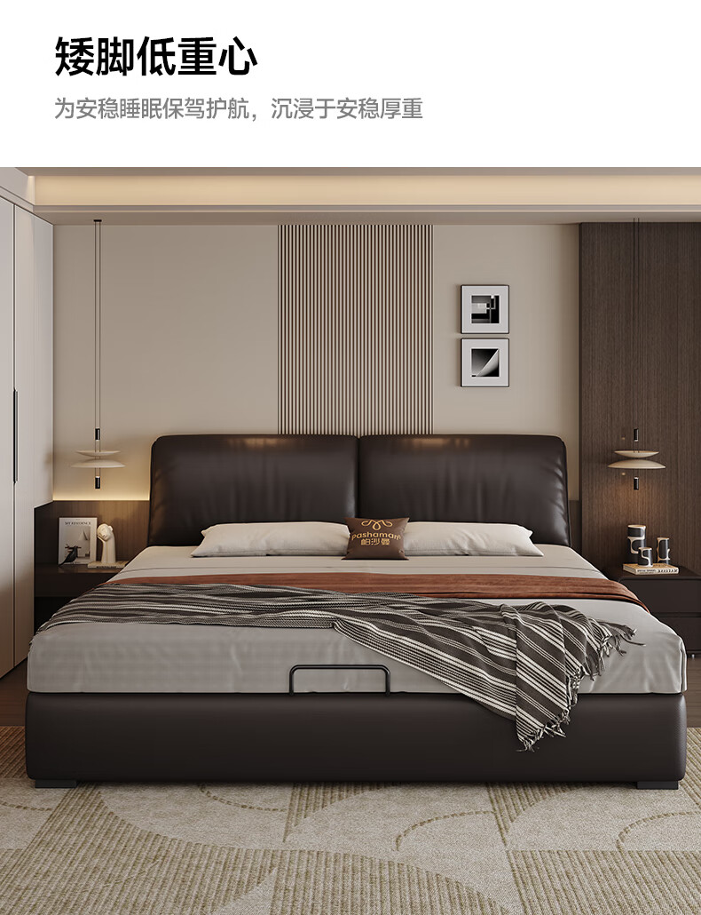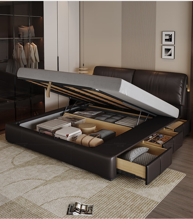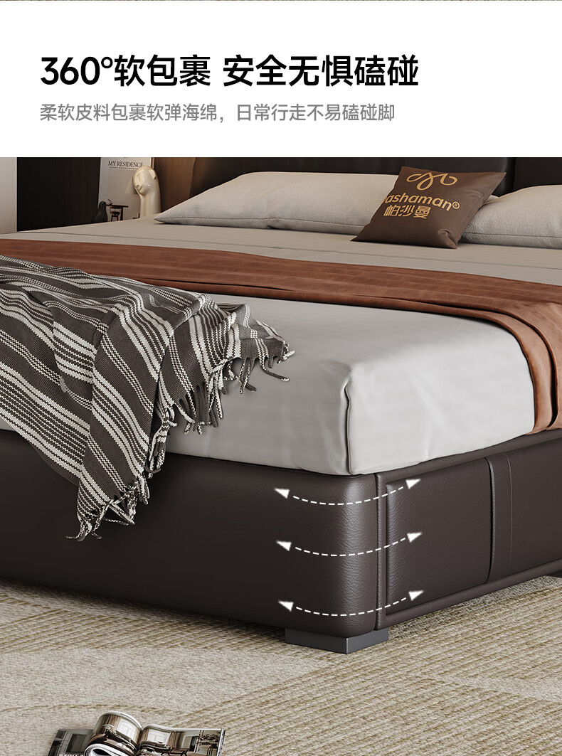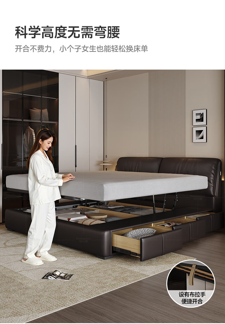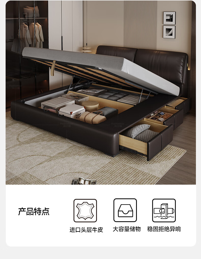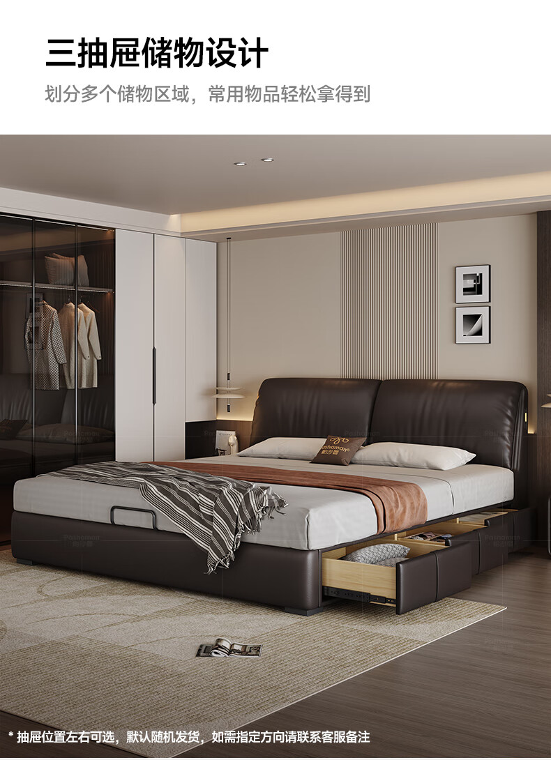 帕沙曼高箱床储物床大象耳朵真皮床现代简约主卧大床软包床双人床8066CP 【15CM钢木排骨架】单床 平移储物带三抽1800mm*2000mm
