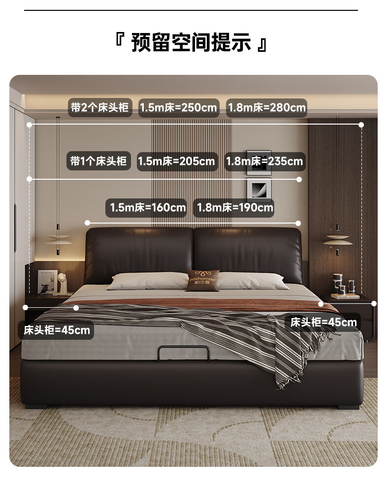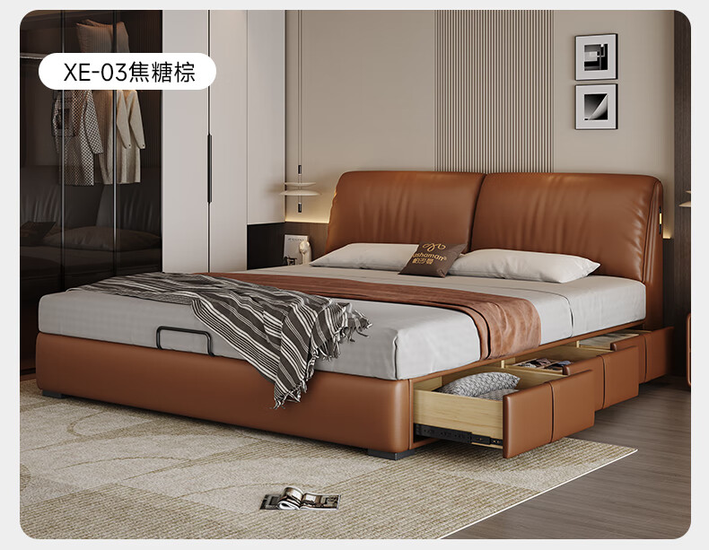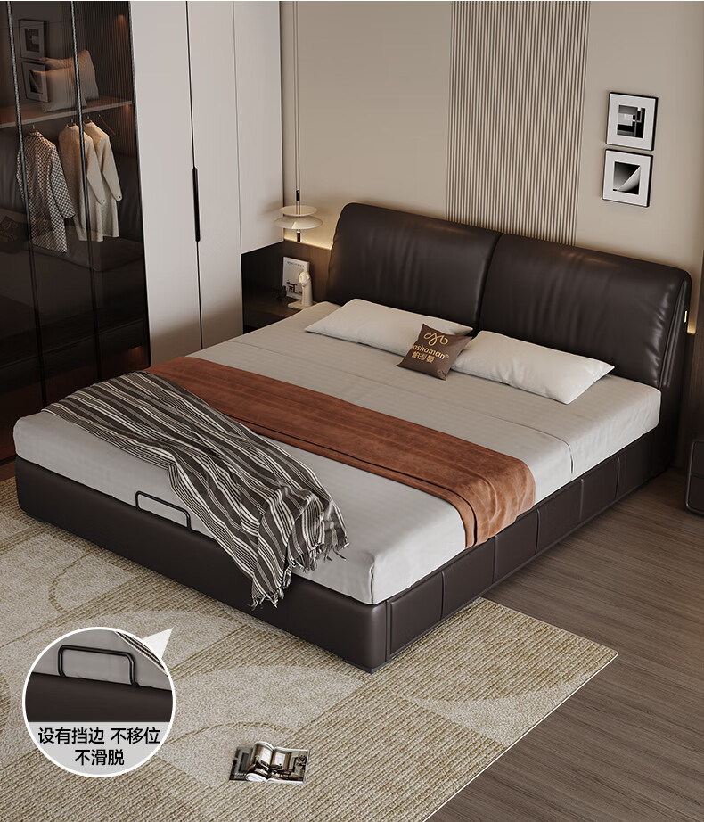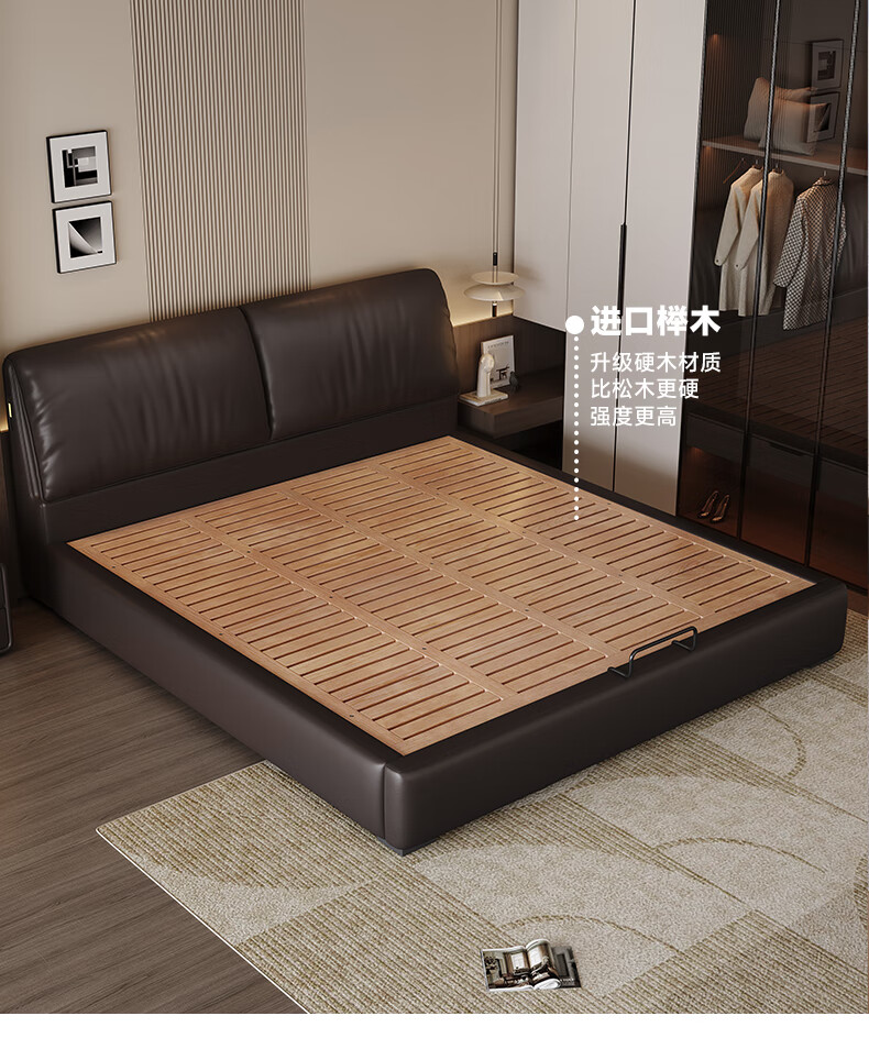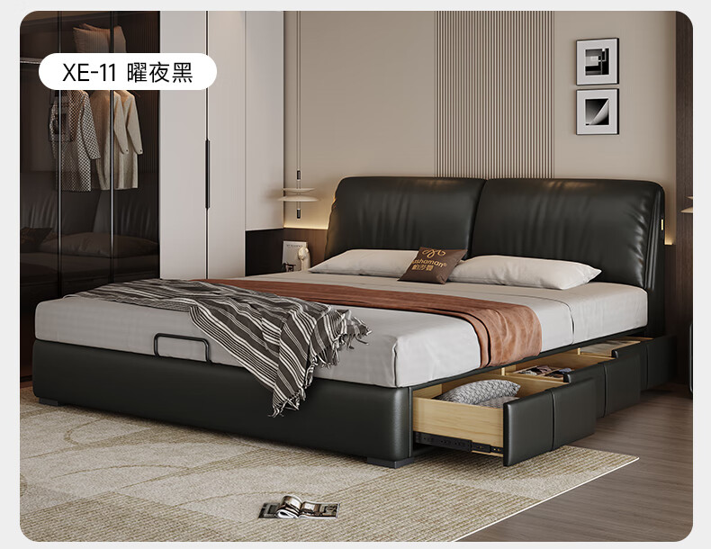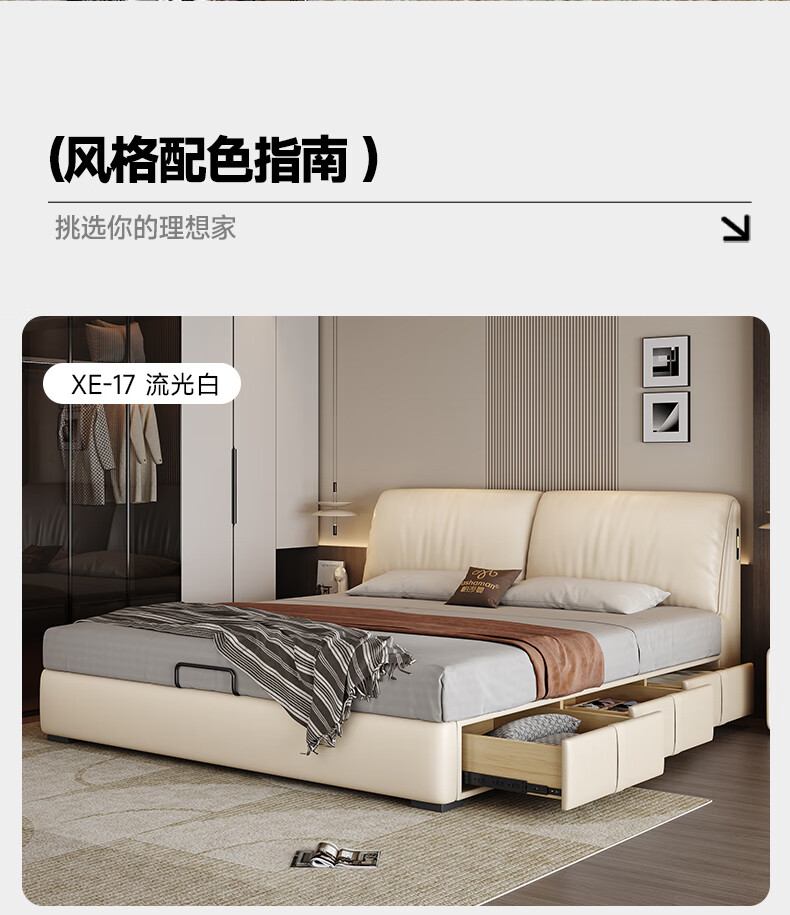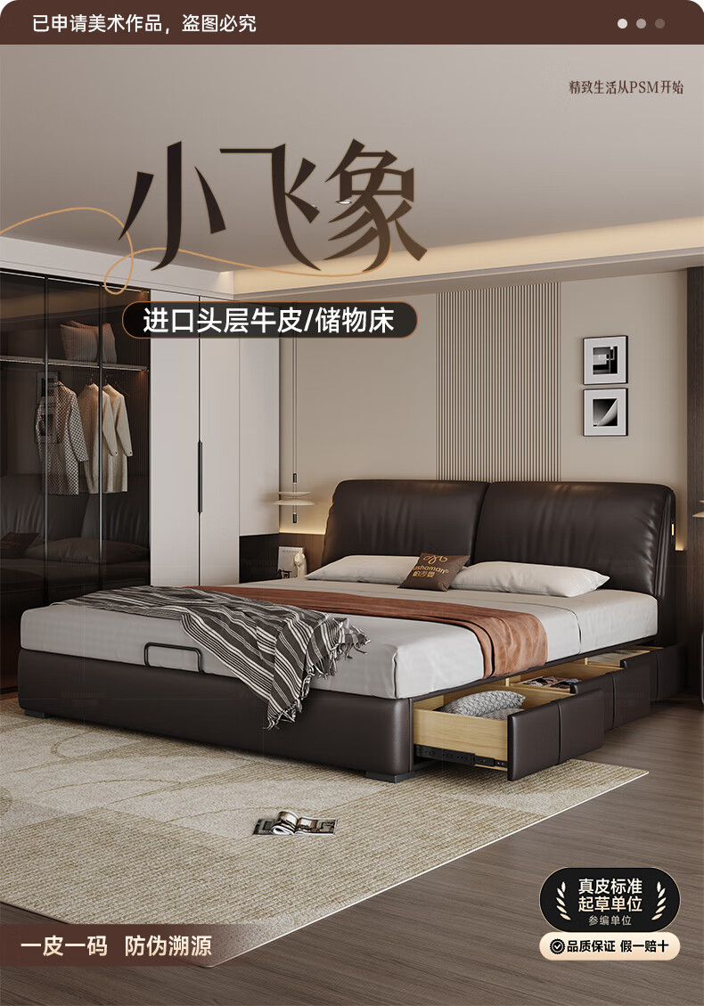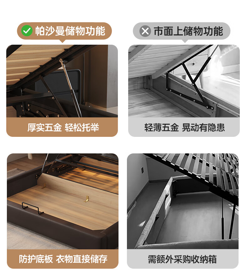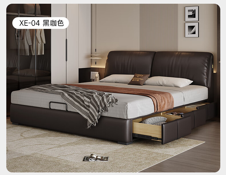 帕沙曼高箱床储物床大象耳朵真皮床现代简约主卧大床软包床双人床8066CP 【15CM钢木排骨架】单床 平移储物带三抽1800mm*2000mm
