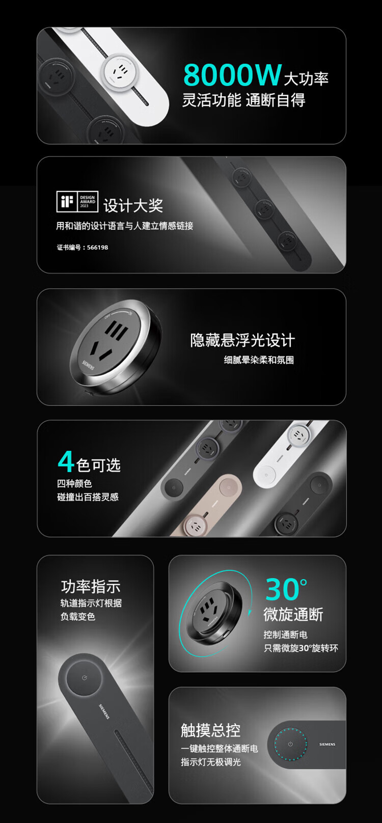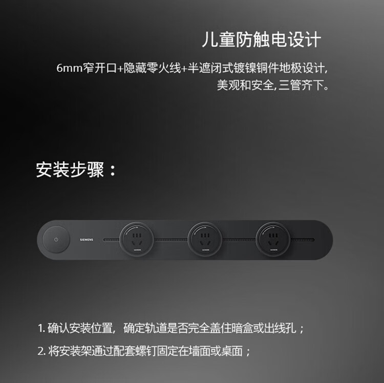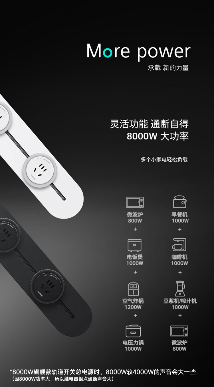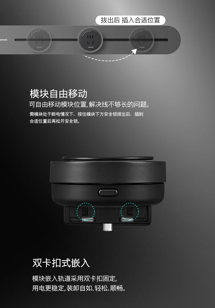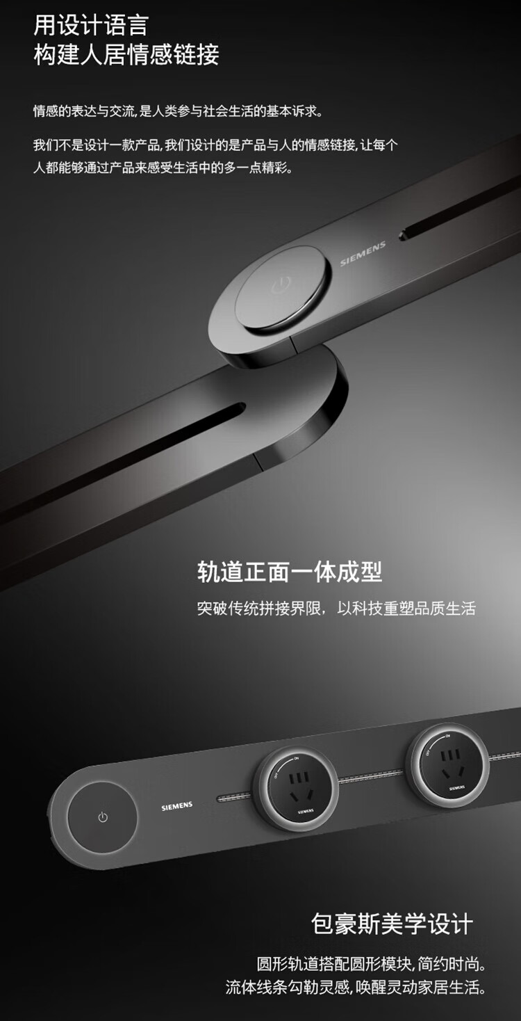 西门子(SIEMENS)轨道插座8000W大功率 可移动明装墙壁接线板电力插座导轨 旗舰款 高端款黑色0.6米轨道+3个五孔插座