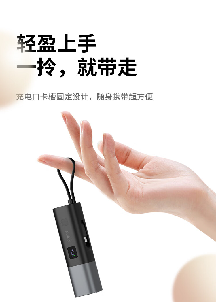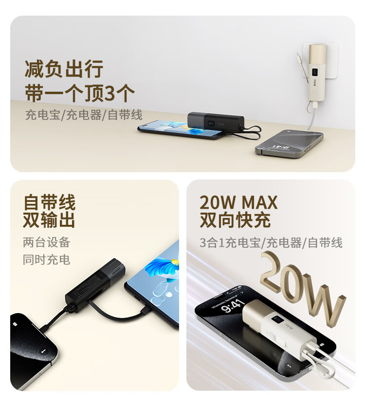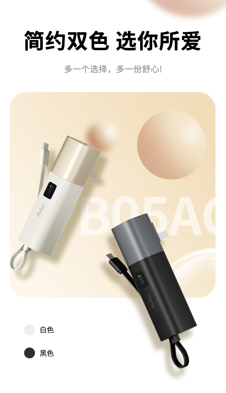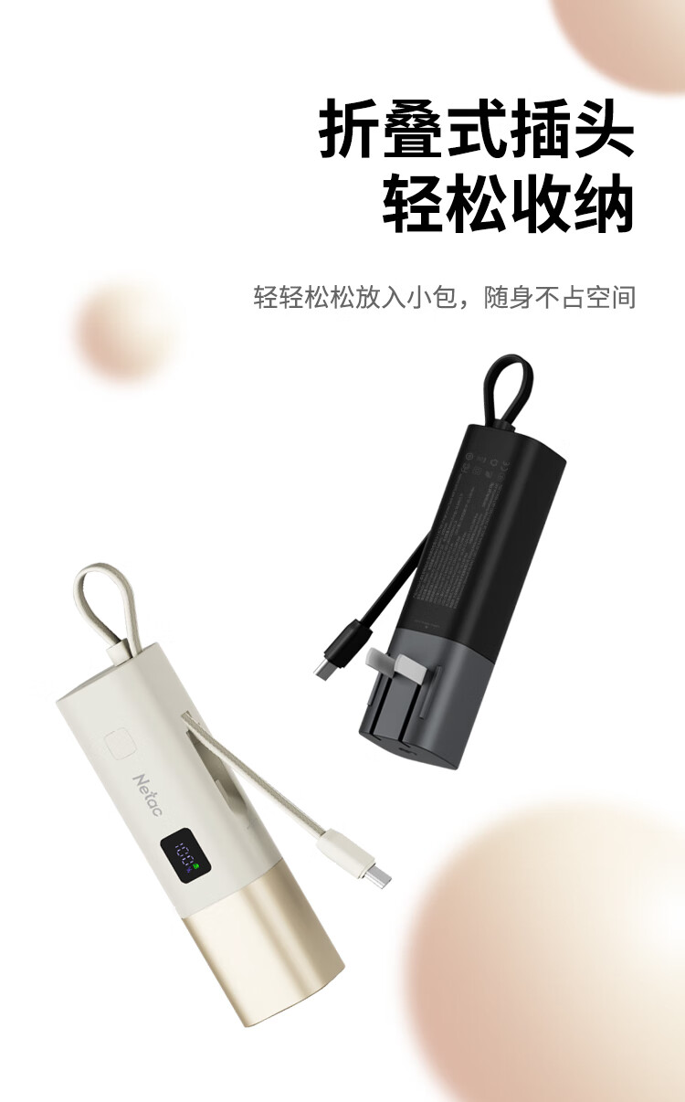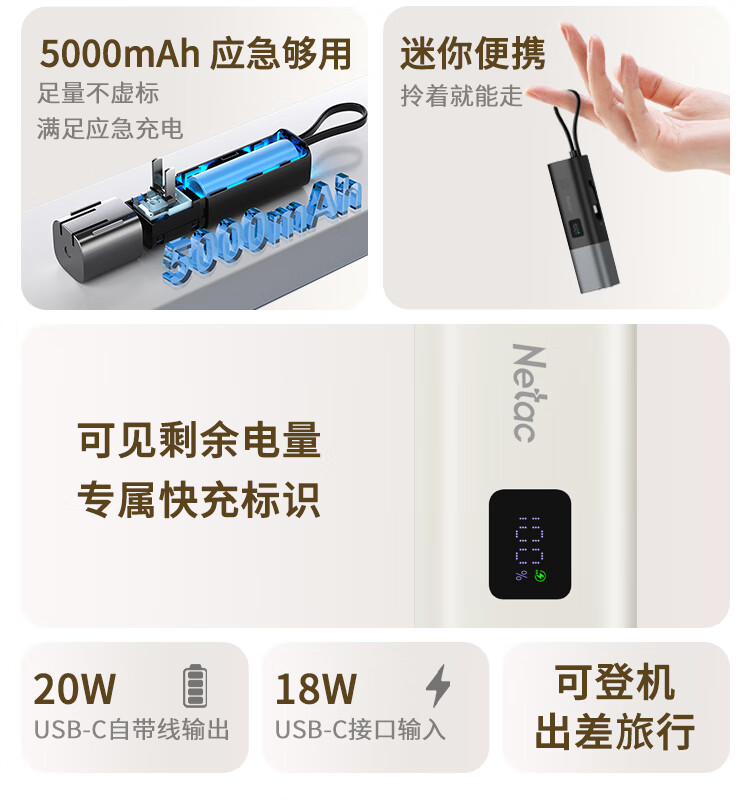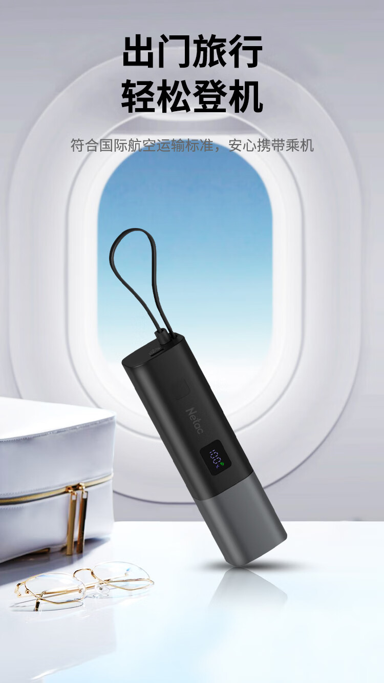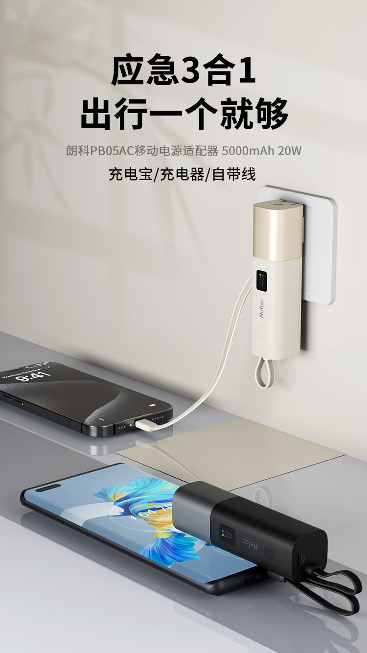 朗科(Netac)3C认证可上飞机三合一充电宝自带线20W双向快充带插头迷你便携苹果17可用小米华为手机移动电源黑