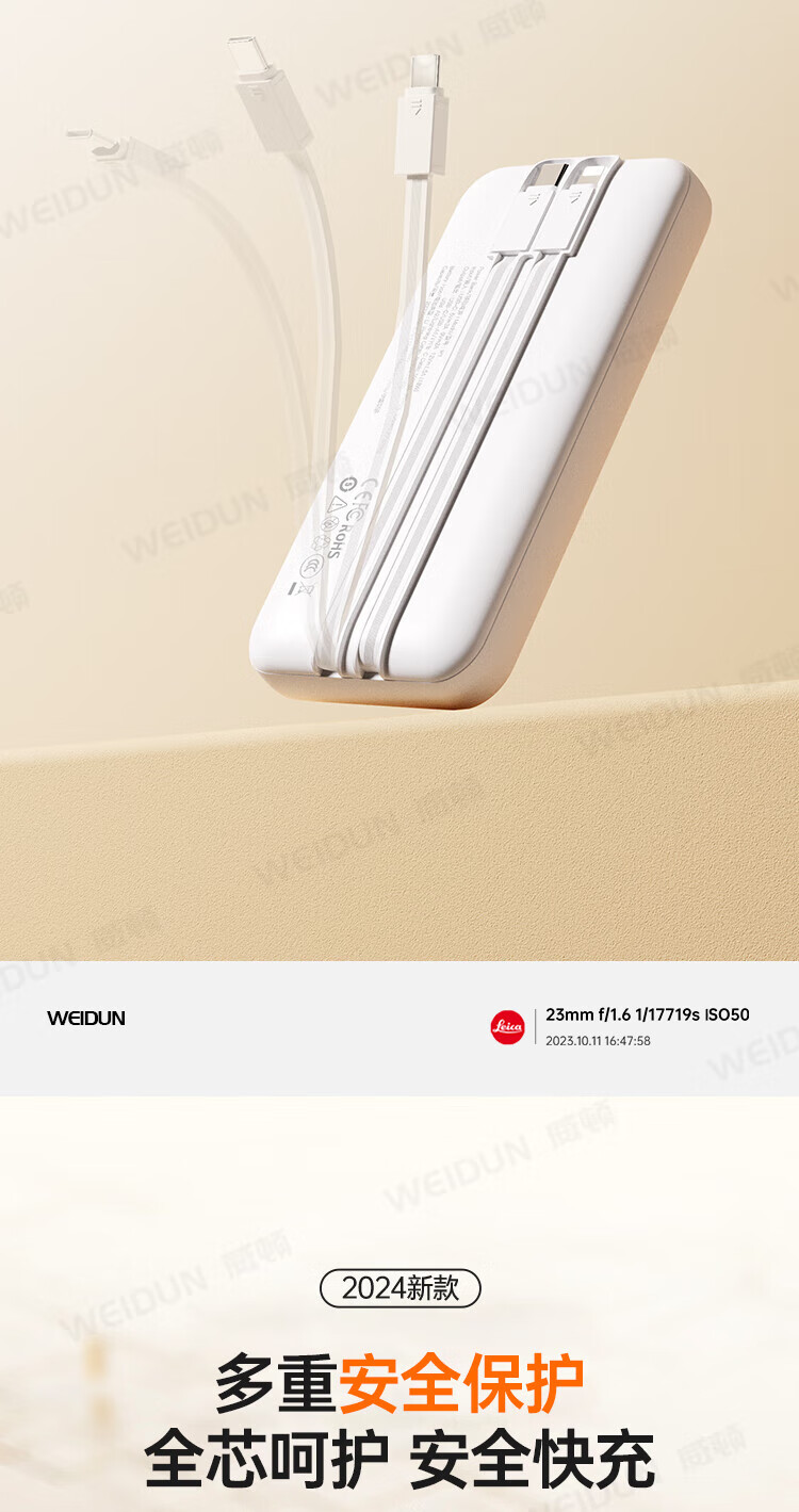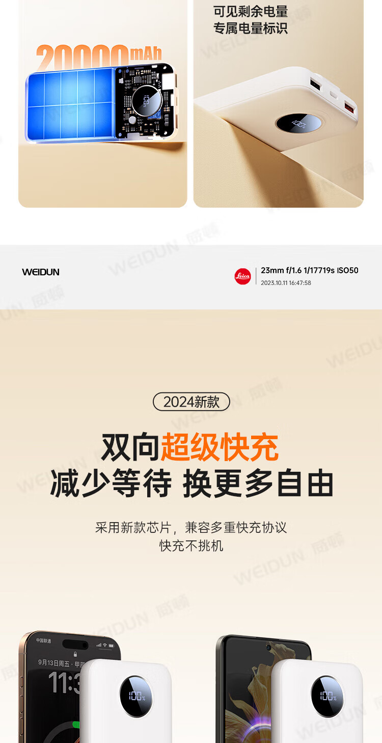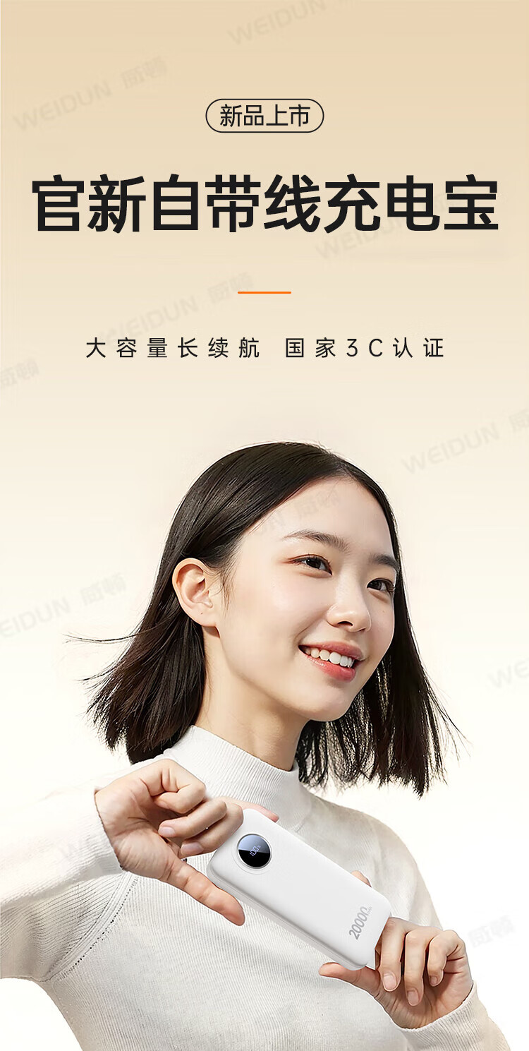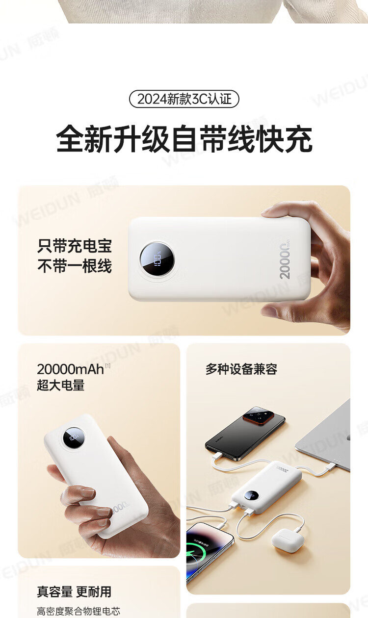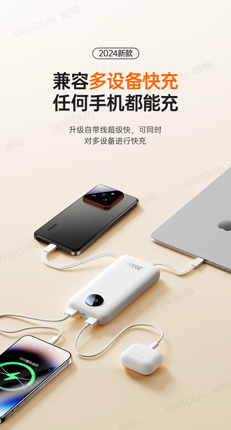 威顿【国家3C认证丨20000毫安】充电宝适用小米快充超大容量可上飞机十大排位自带线移动电源小巧便携 【皓月白】20000毫安+超级快充+提速999% 新国标3C双认证丨自带三快充线丨可上飞机高铁