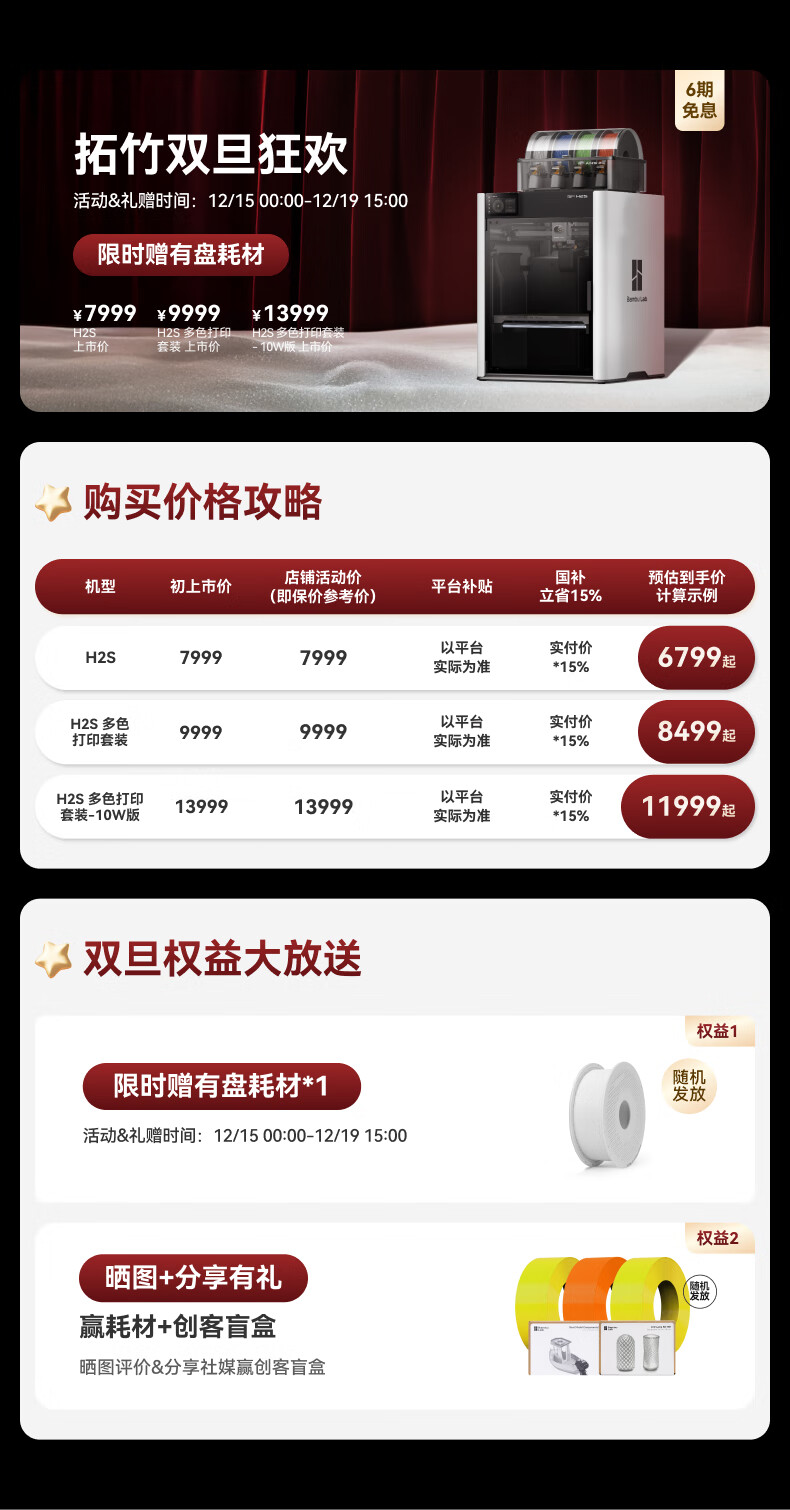 bambulabH2S 3D打印机器大尺寸激光雕刻模切画笔多功能四合一高精度高速智能多色家用旗舰系列新品 H2S 多色打印套装【大陆版】