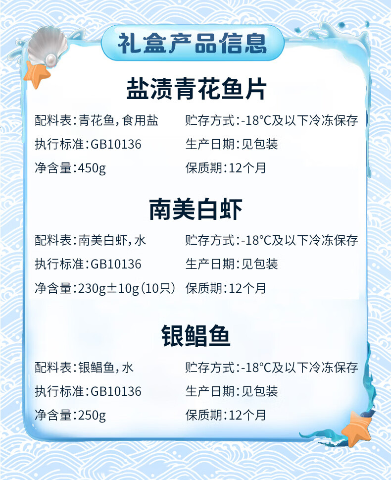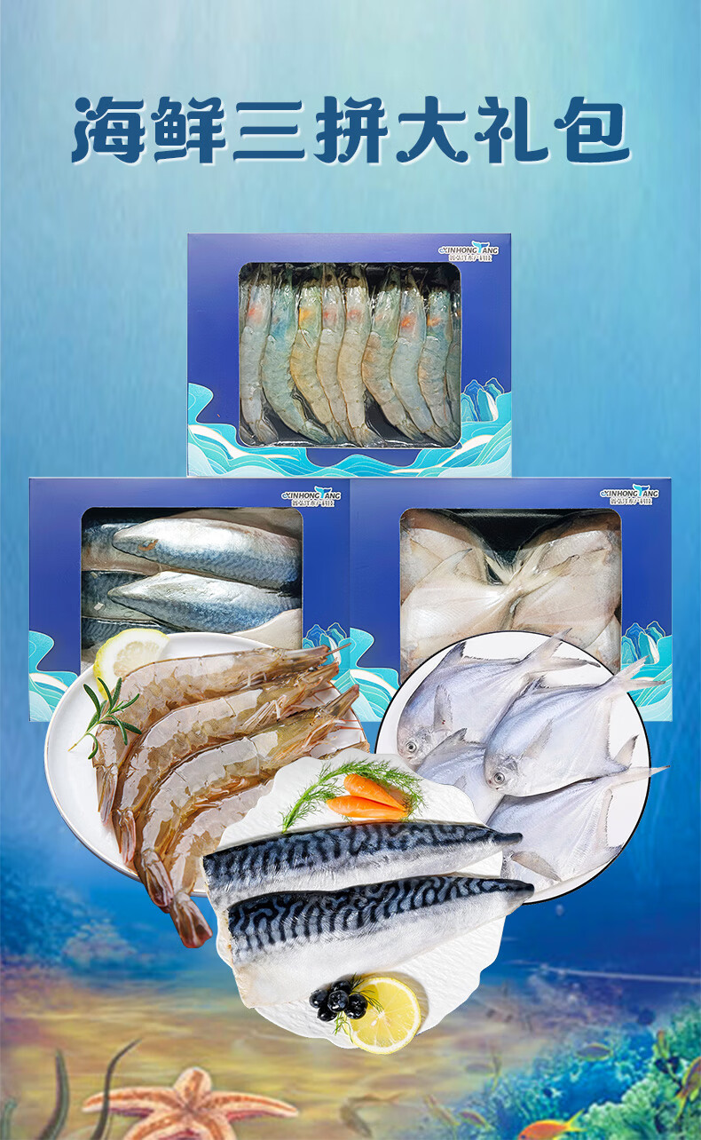 鑫弘洋水产科技(XINHONGYANG)【辽宁特产】葫芦岛海鲜三拼礼盒青花鱼片南美白虾银鲳鱼海鲜年货 青花鱼450g+青虾10条220g+银鲳鱼4条250g/盒