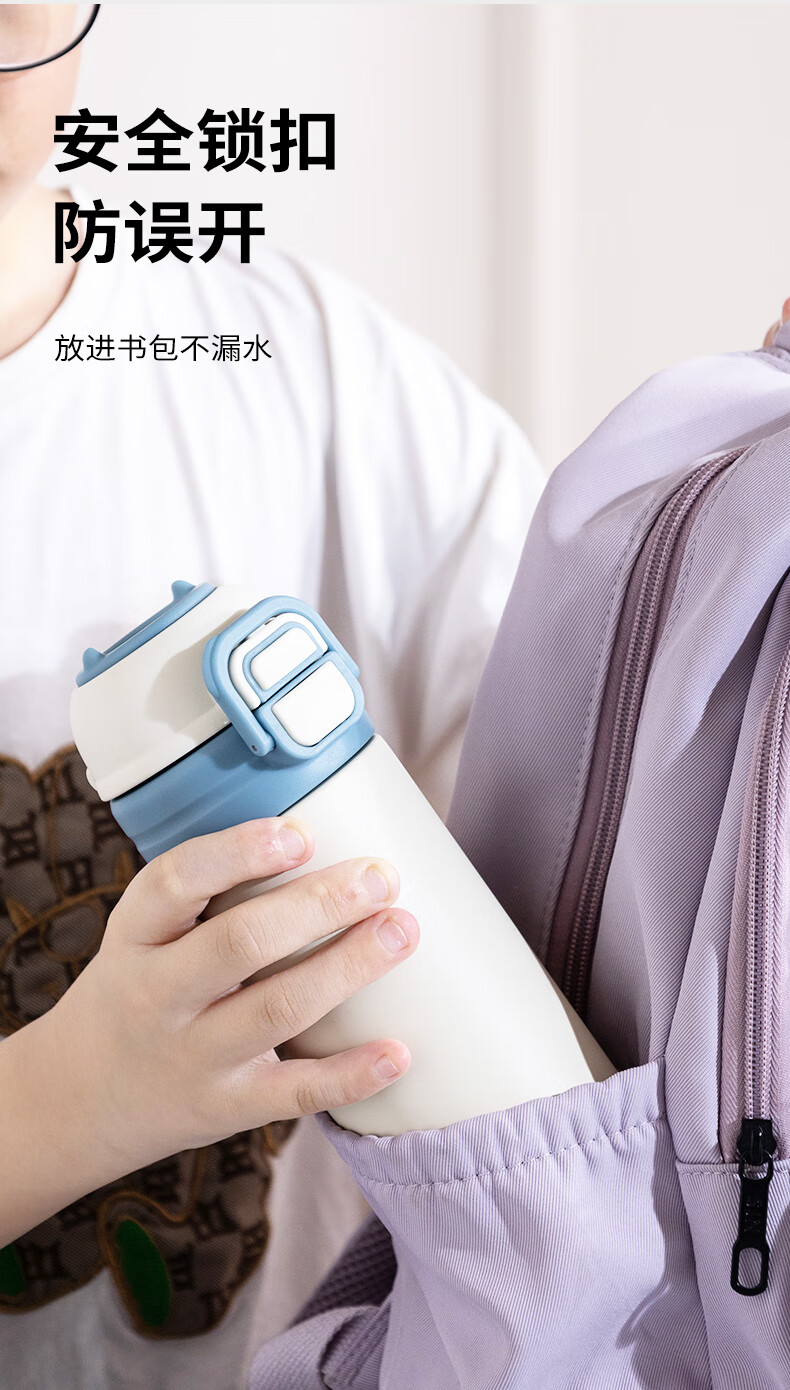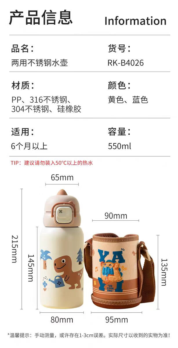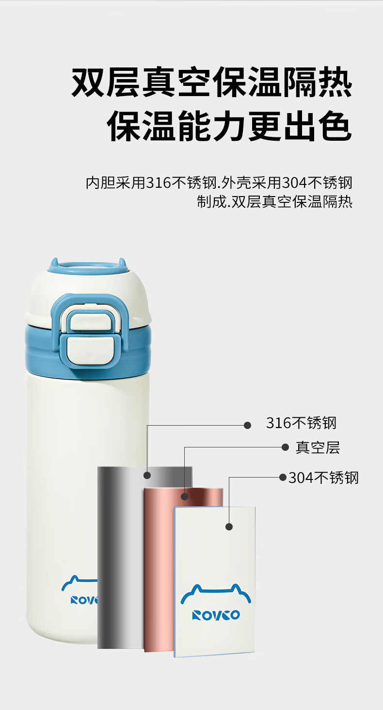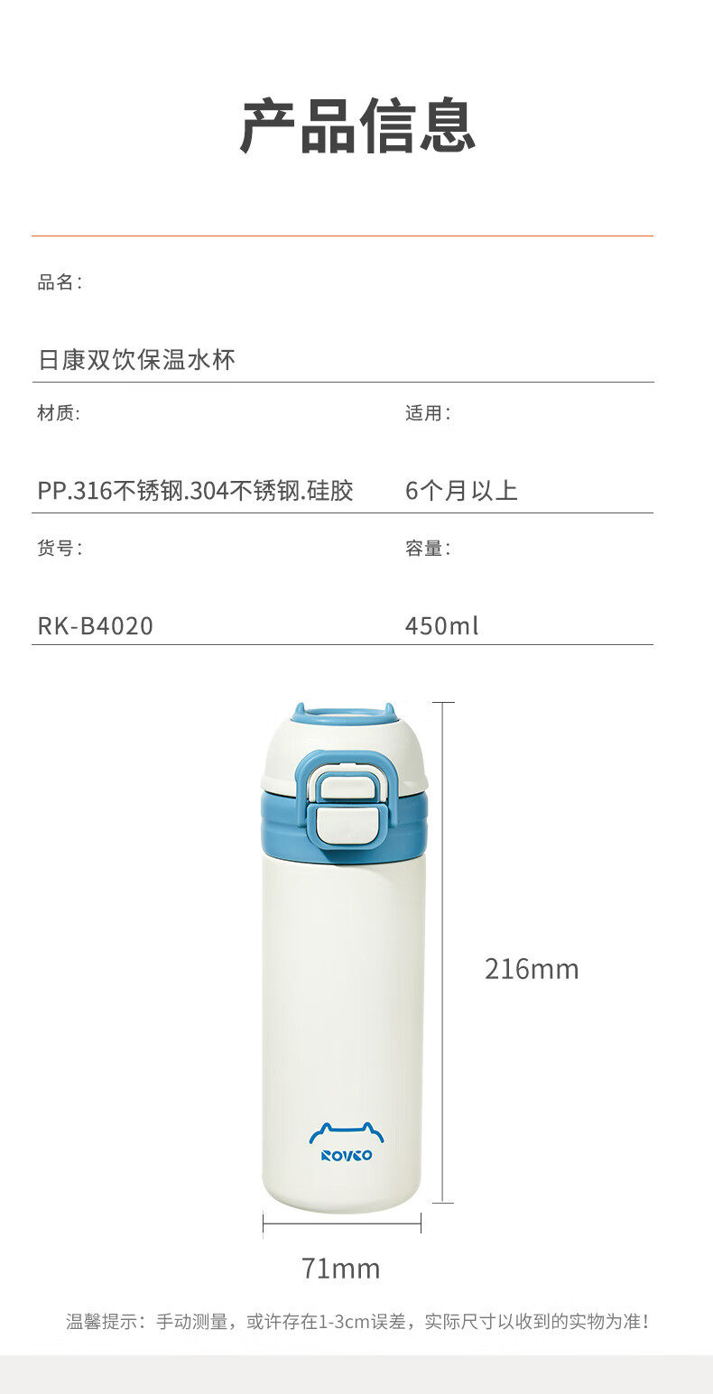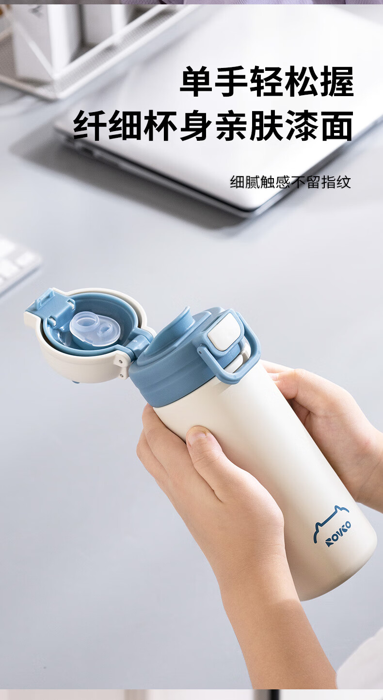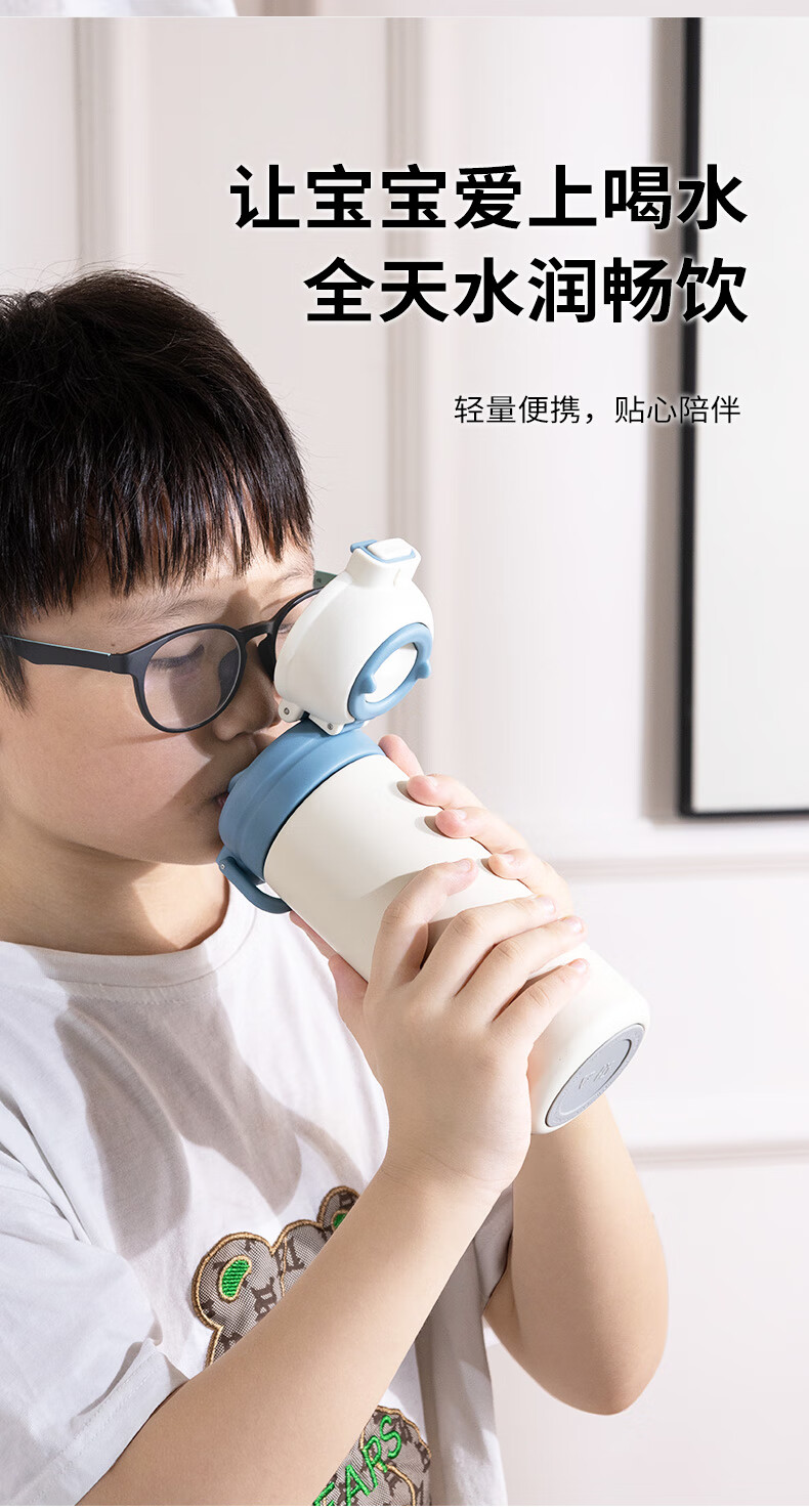 日康(rikang)保温杯 儿童水杯316不锈钢学生杯幼儿园上学专用水杯 【一杯双盖+杯套】B4026蓝色 550ml