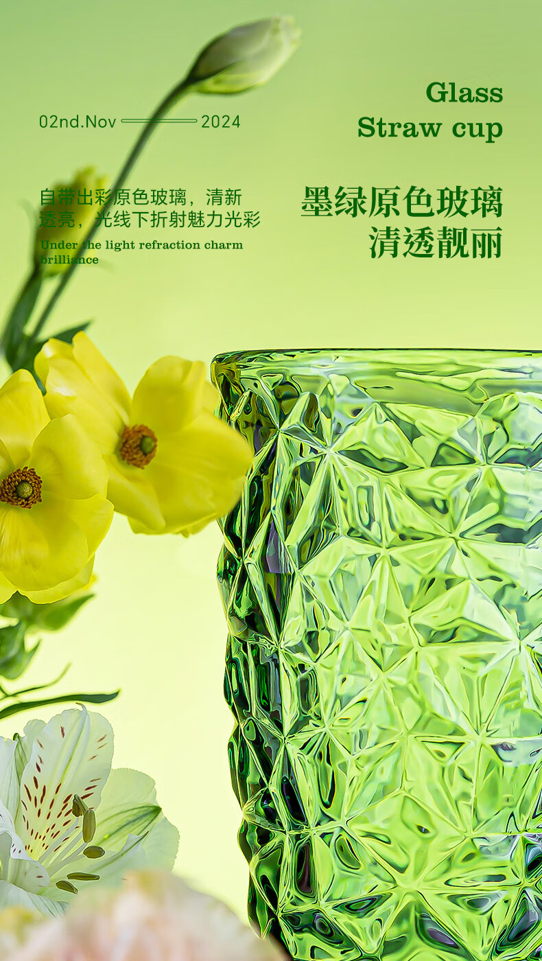 乐唯诗(LOVWISH)玻璃吸管杯水杯墨绿原色无铅加厚几何肌理网红高颜值饮料果汁杯 钻纹吸管杯【原色玻璃】440ml1只