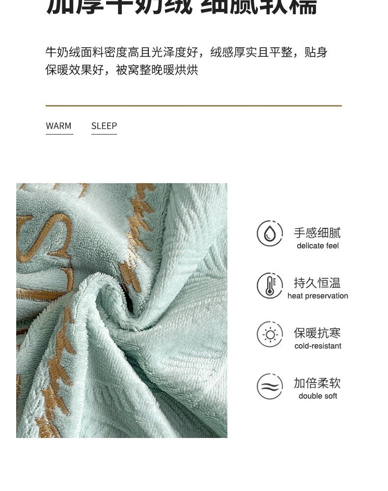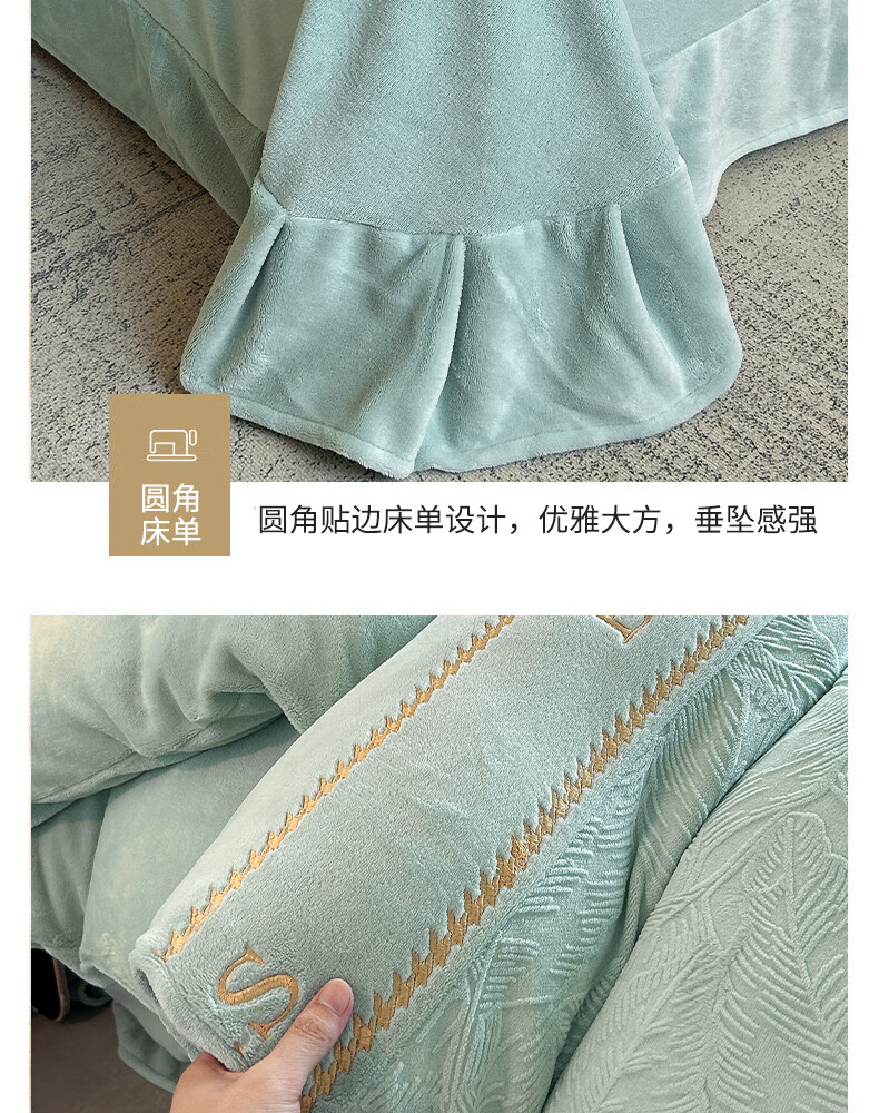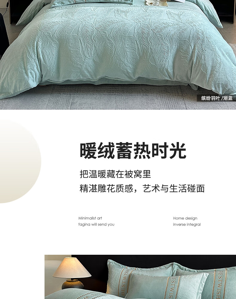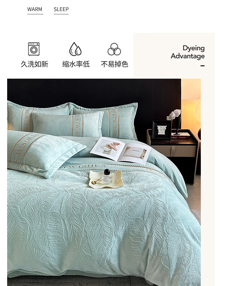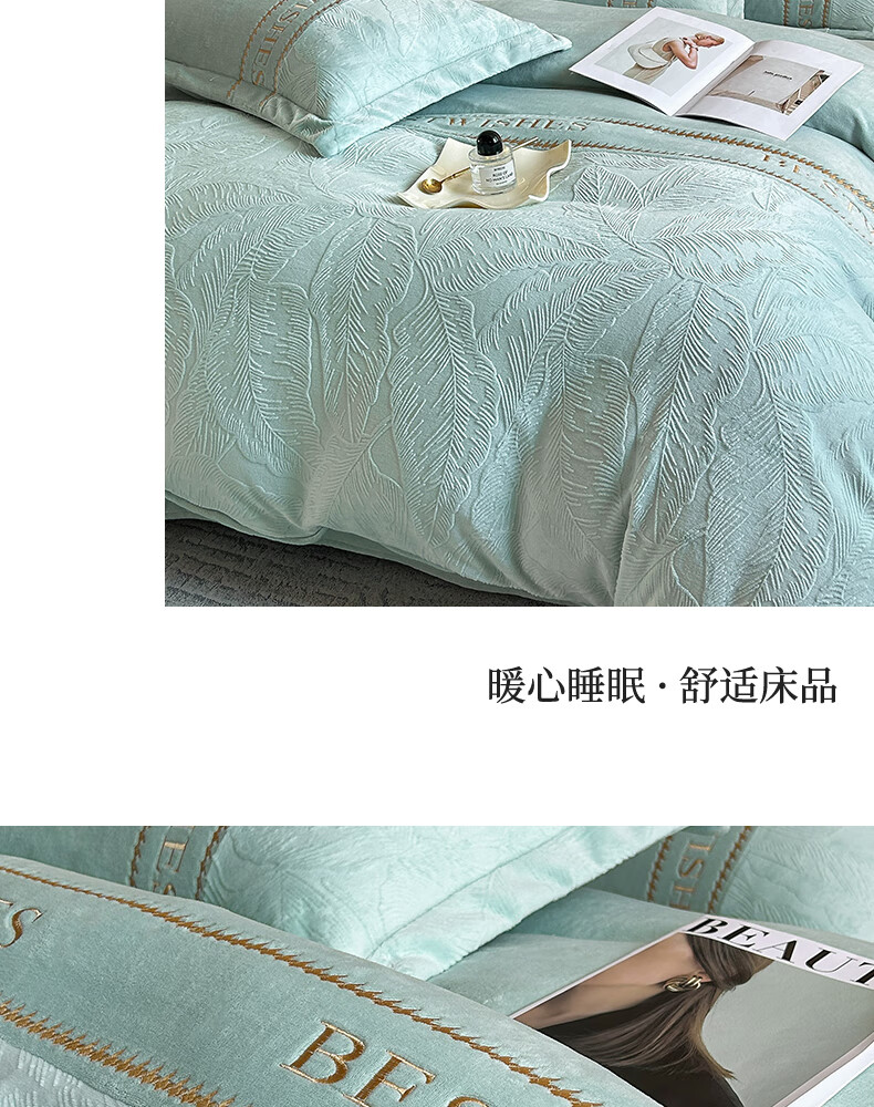 VJE轻奢牛奶绒四件套冬季加厚保暖双面绒床单被套法兰绒被罩床上用品 缤纷羽叶-蓝拼白 四件套2.0m 床单款 -被套220*240cm