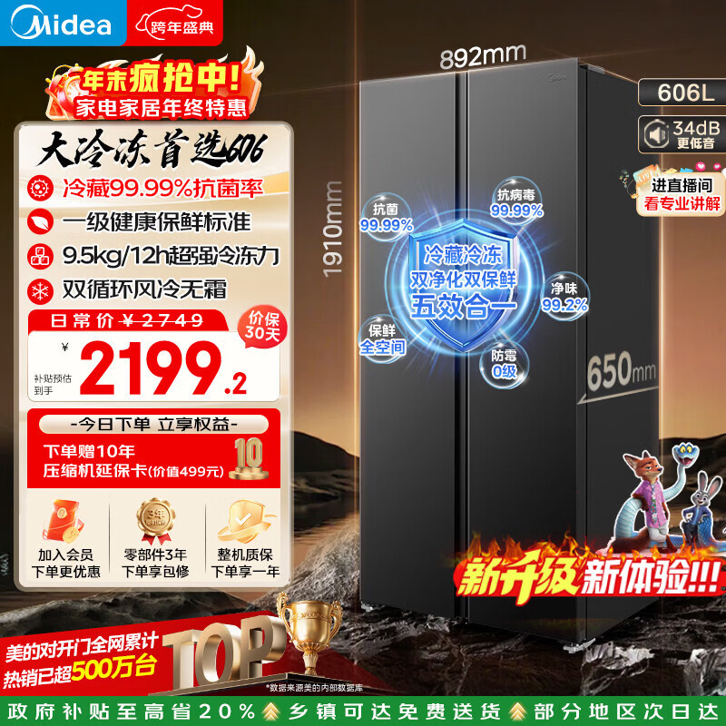 美的(Midea)606升对开门冰箱一级能效风冷无霜净味双变频超大容量大冷冻BCD-606WKPM(E)国家补贴
