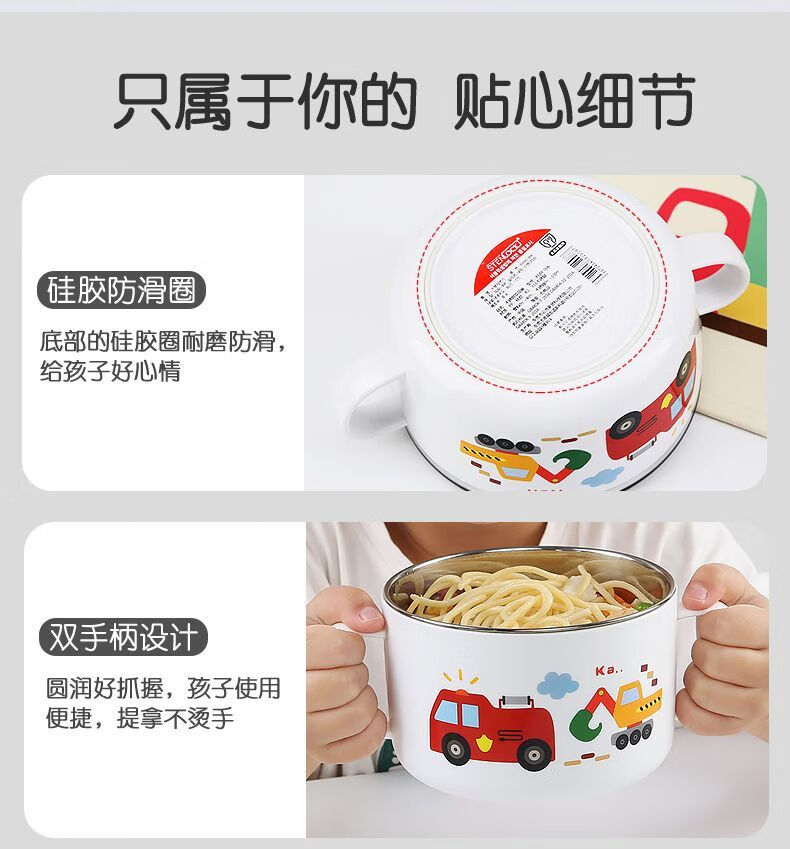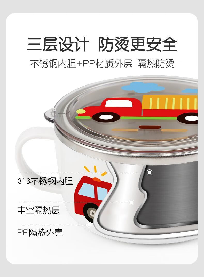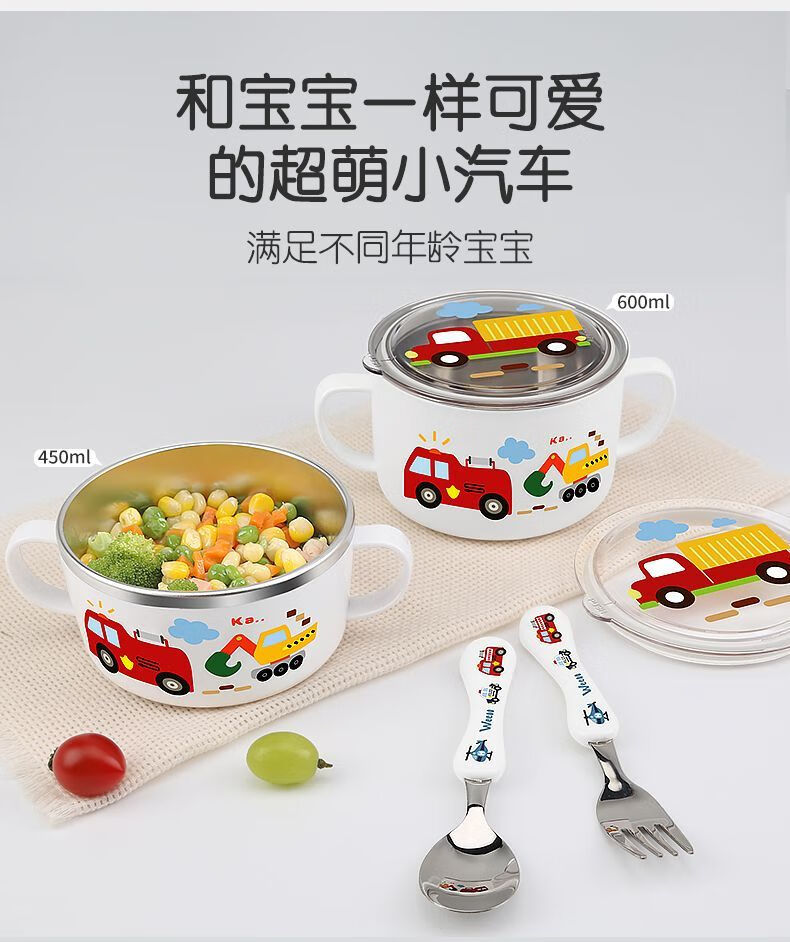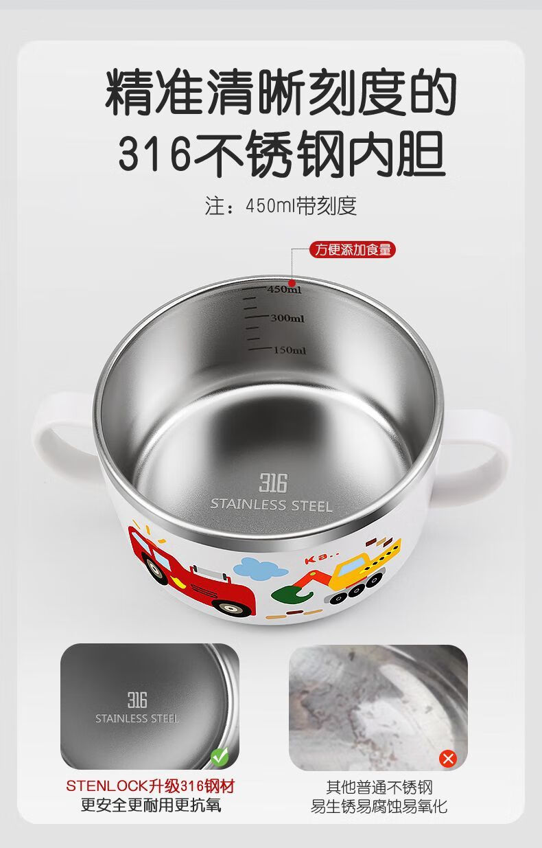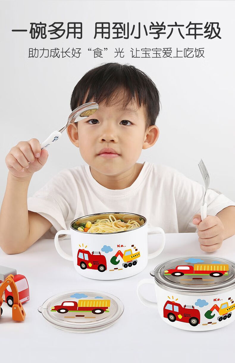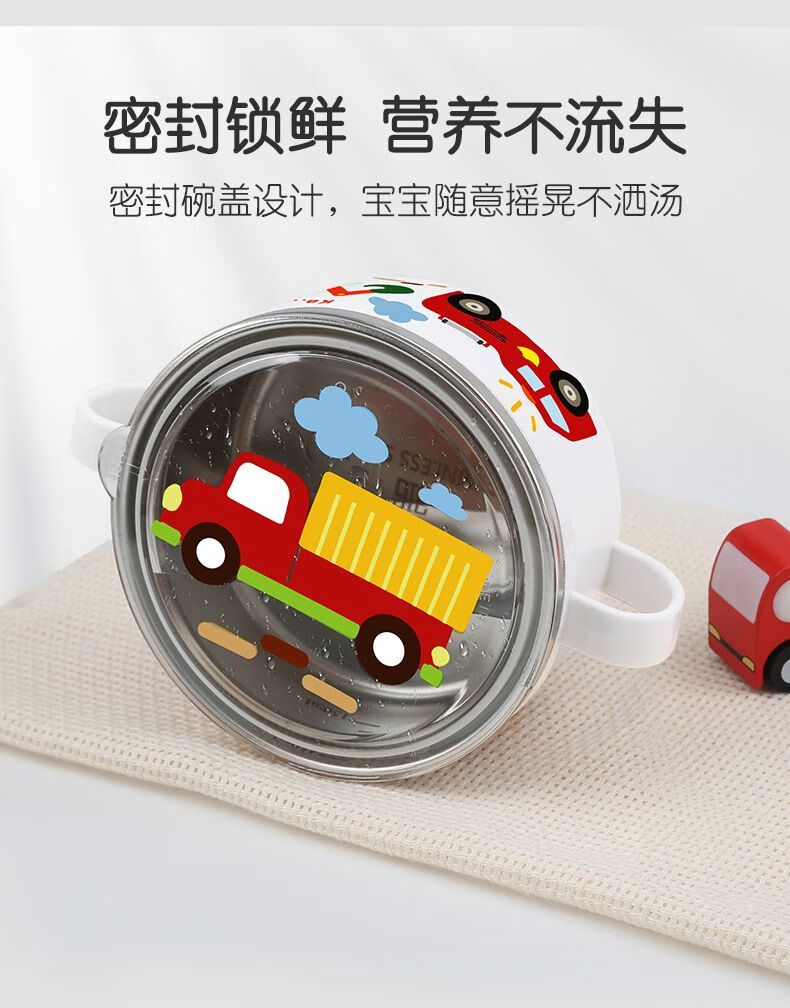 致仕(ZISIZ)儿童碗316不锈钢食品级小学生专用饭碗带盖防摔双耳汤碗带手柄304 【316】小汽车碗-450ml
