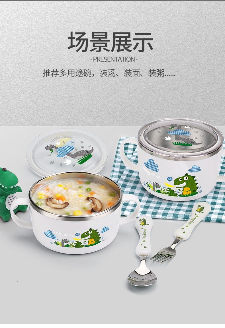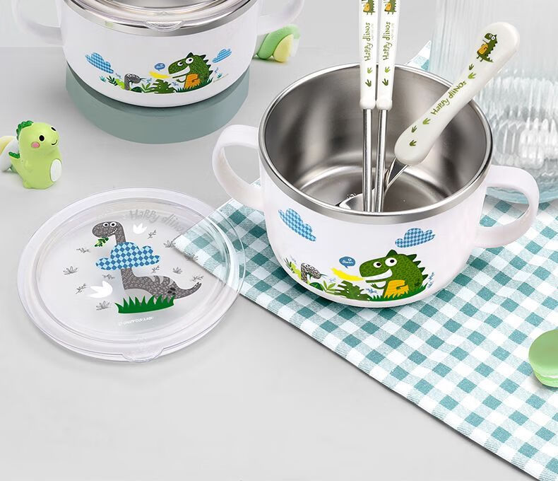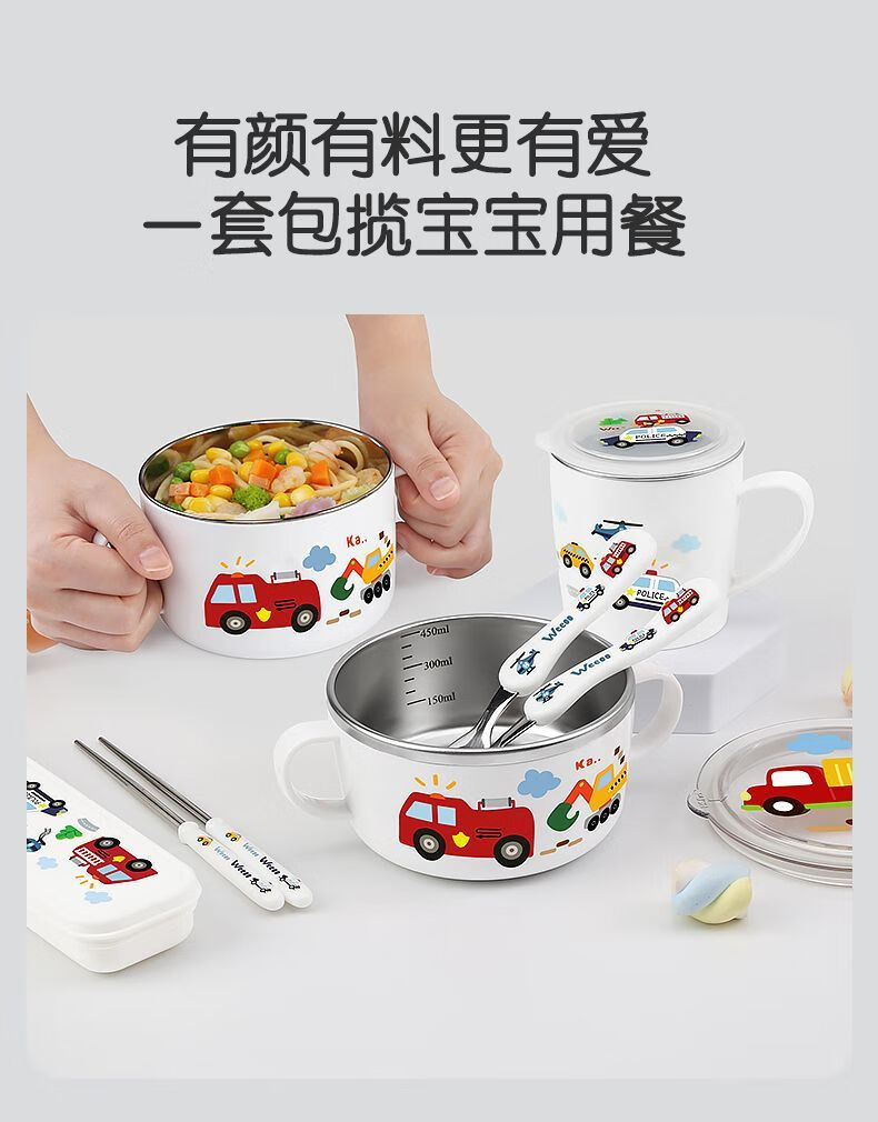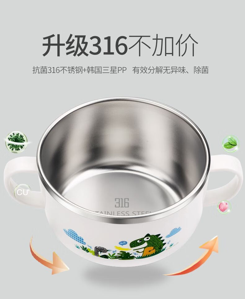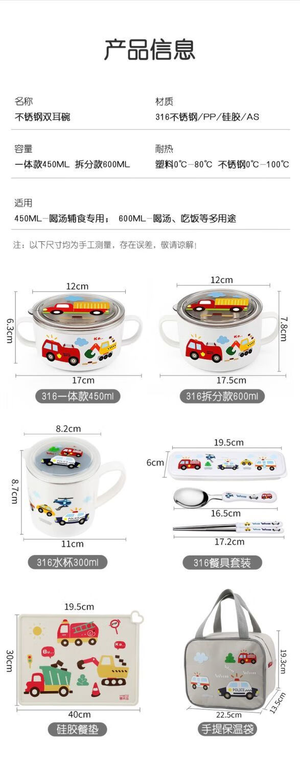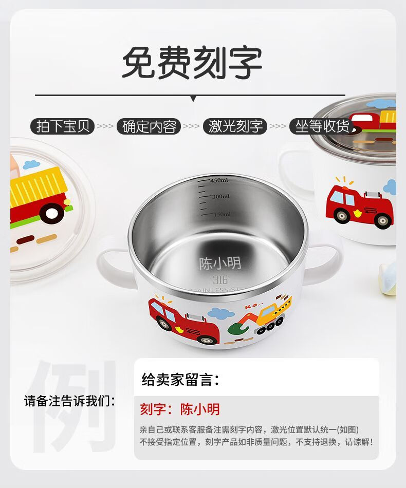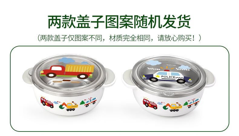 致仕(ZISIZ)儿童碗316不锈钢食品级小学生专用饭碗带盖防摔双耳汤碗带手柄304 【316】小汽车碗-450ml