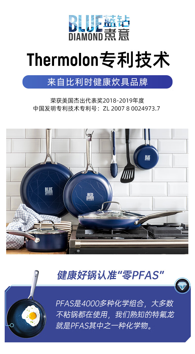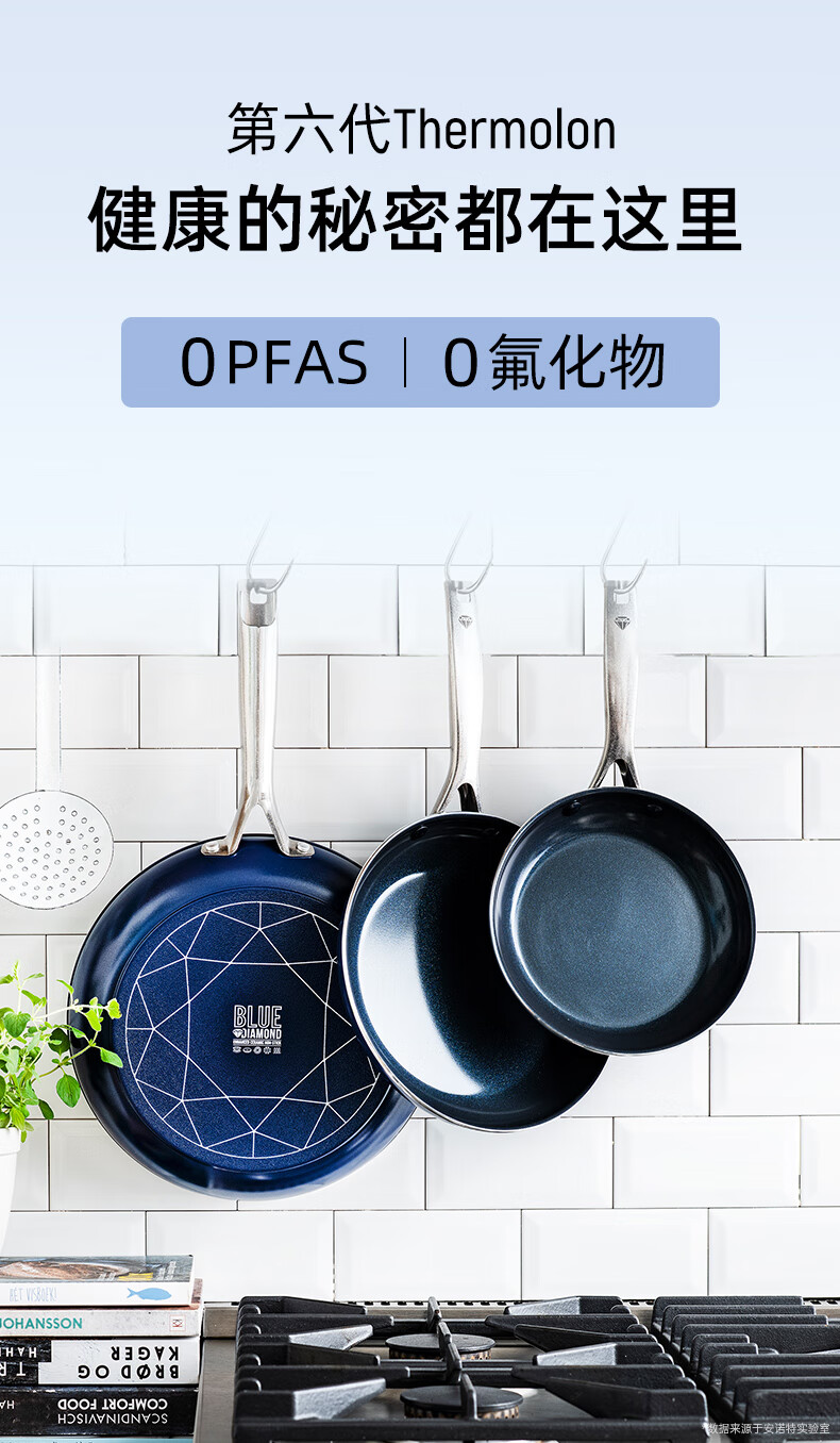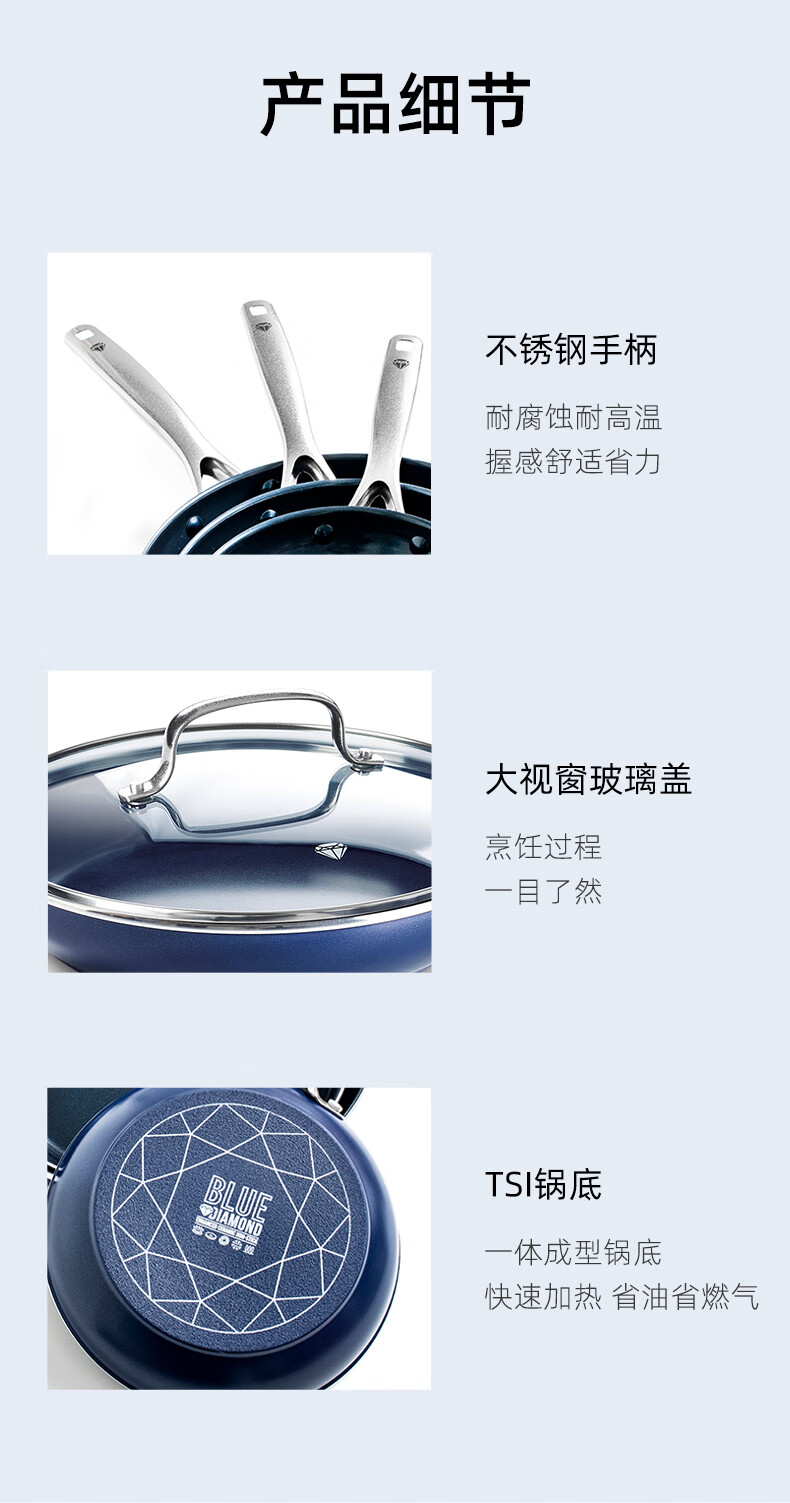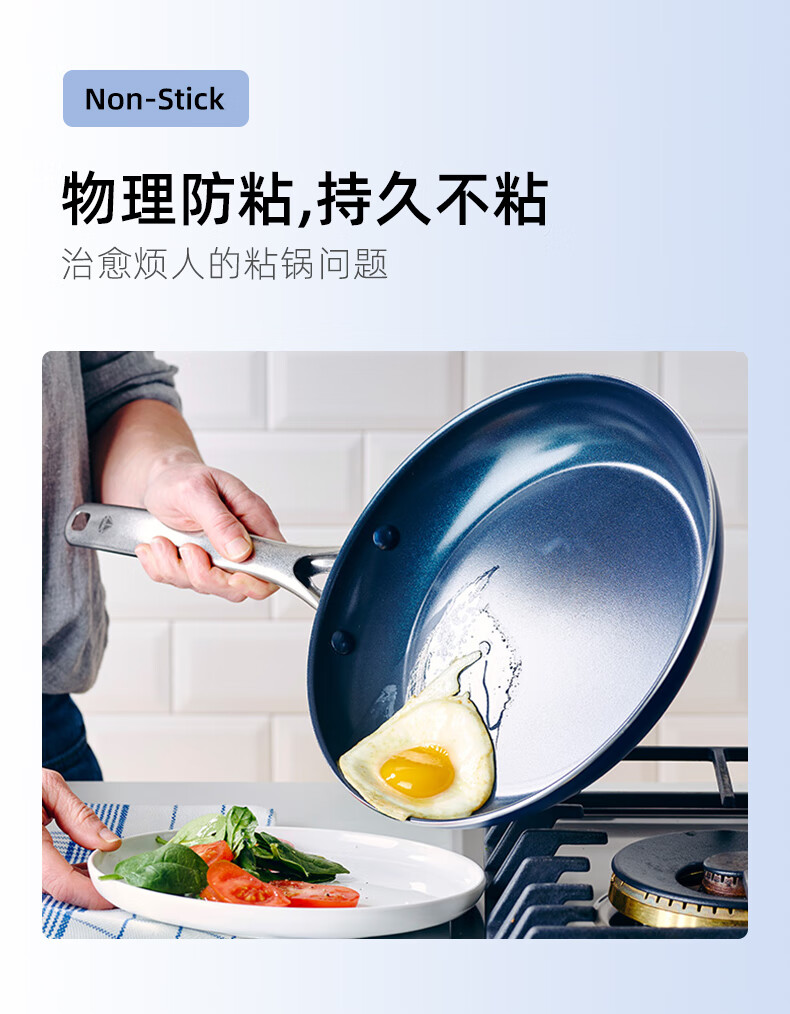 BLUE DIAMOND蓝钻平底锅钻石不粘锅陶瓷煎锅煎蛋家用燃气灶电磁炉通用牛排煎锅 配盖 20cm 8