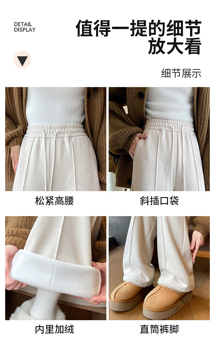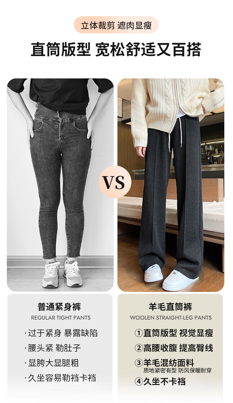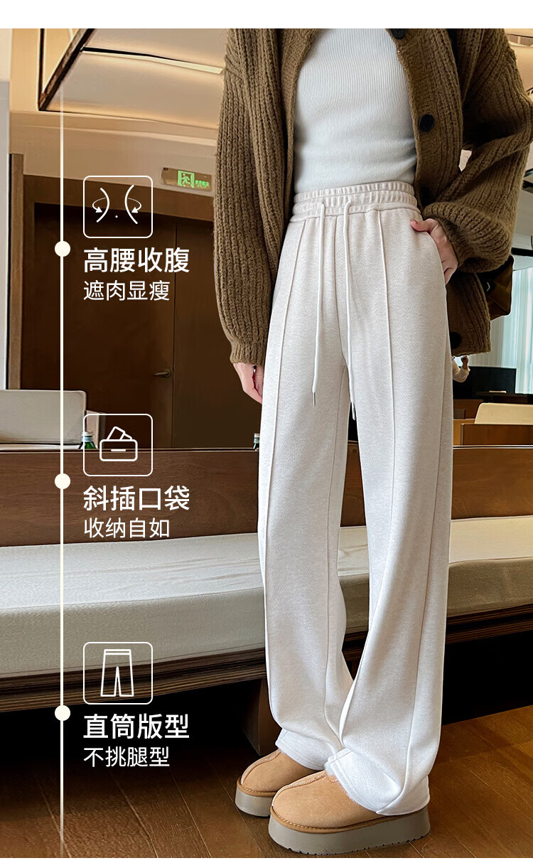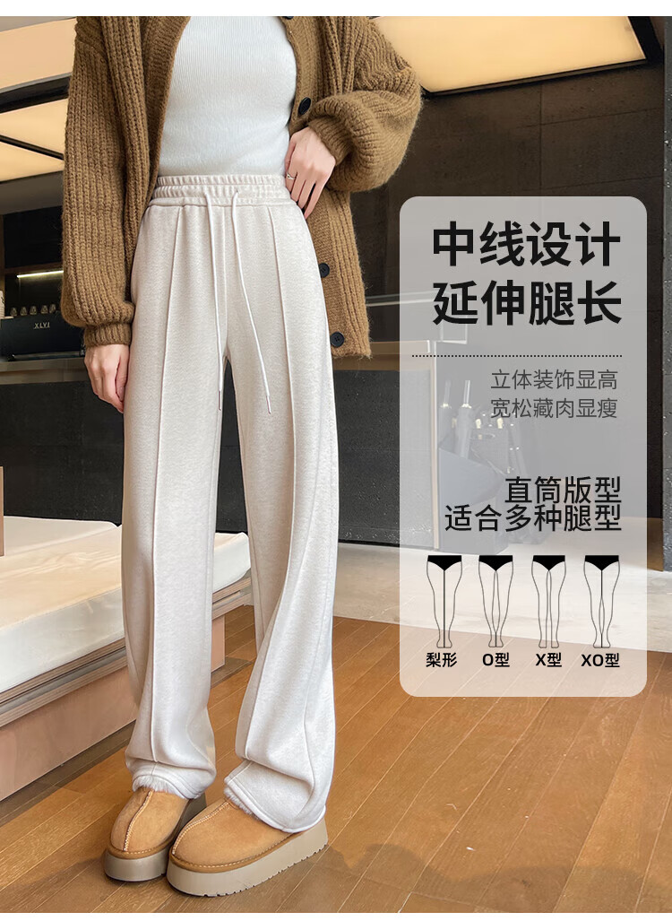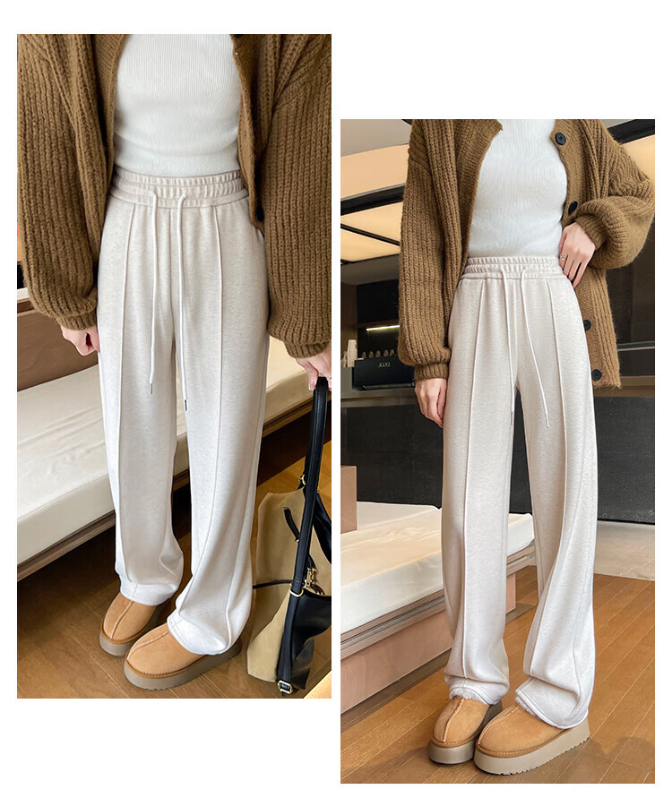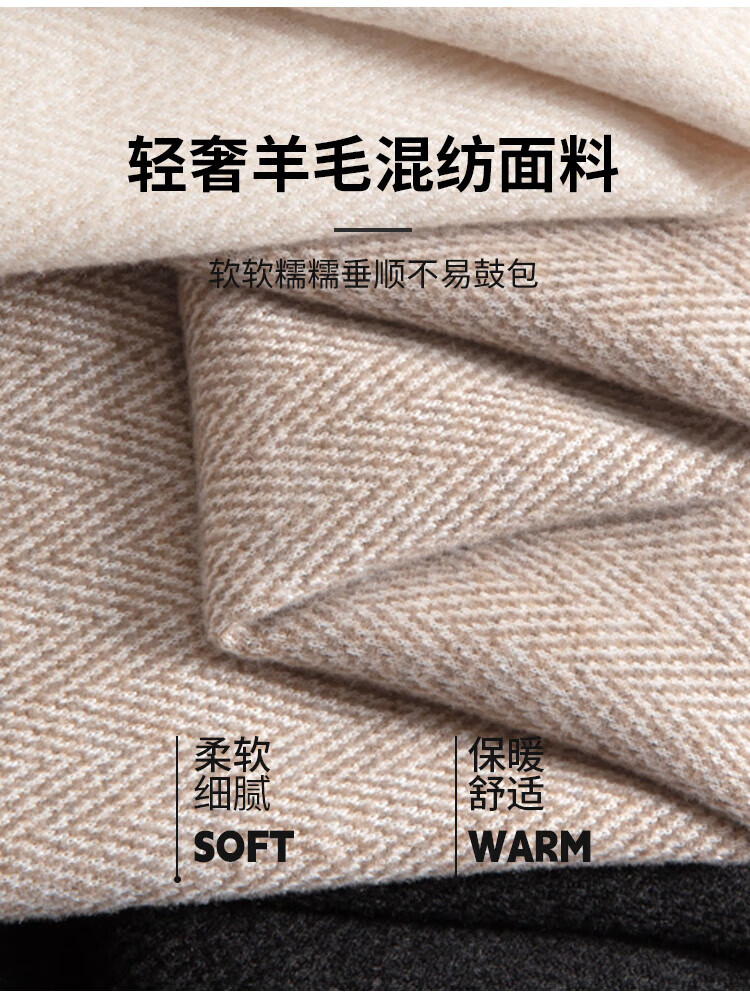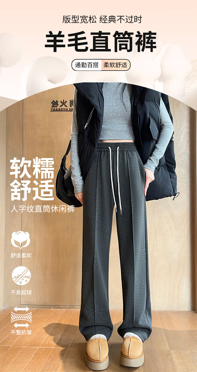 浪莎人字纹毛呢阔腿裤女秋冬季2025新款加绒加厚休闲窄版羊毛直筒裤子 奶杏色 【羊毛亲肤保暖】 XL 【适合125-140斤】
