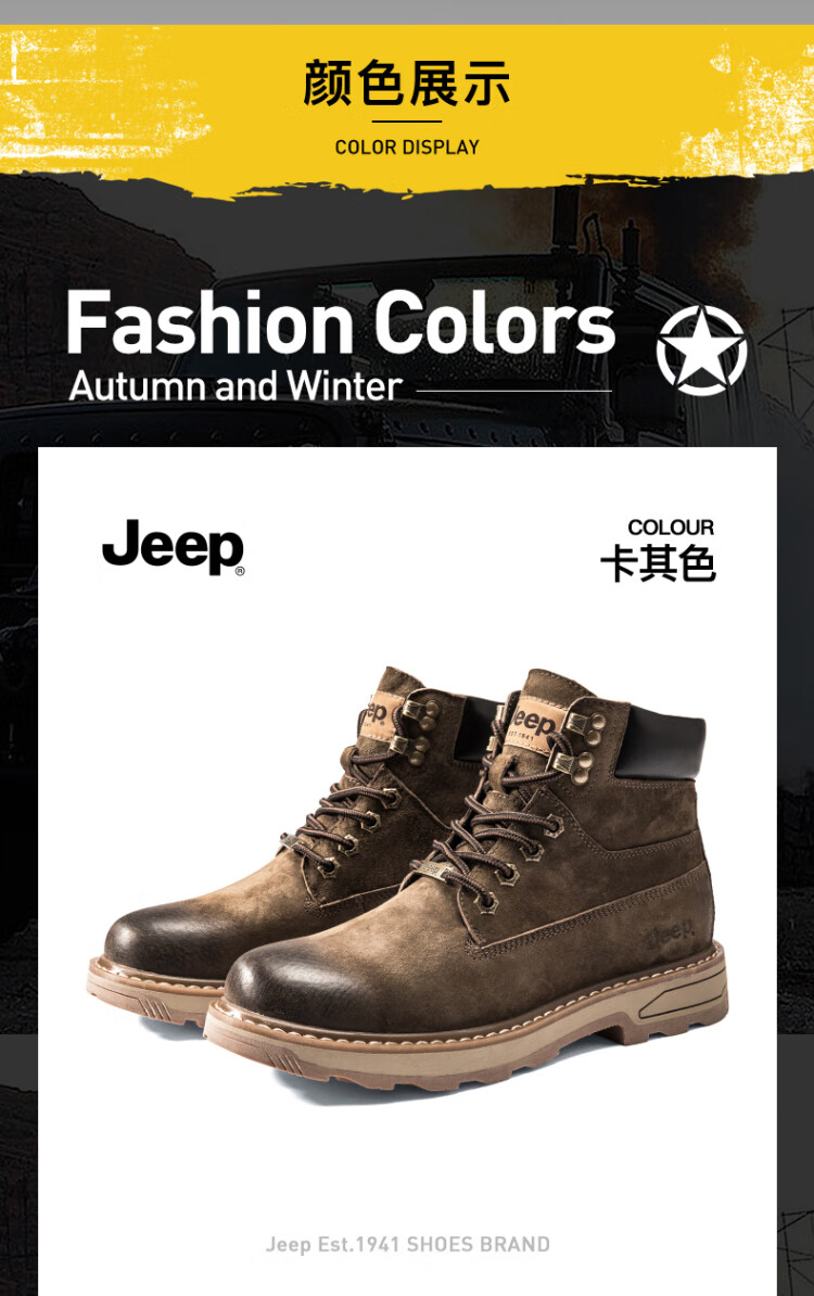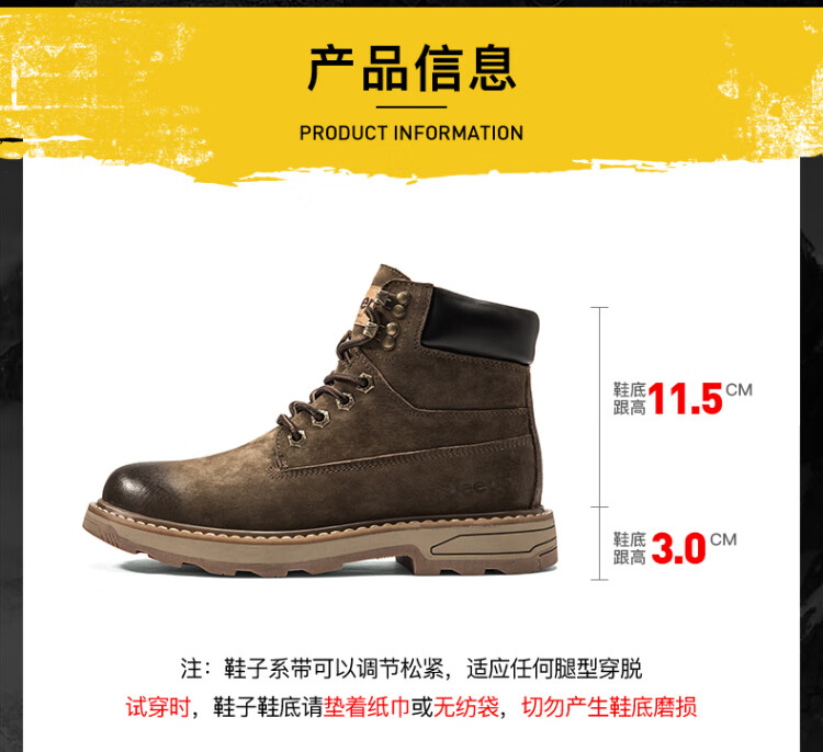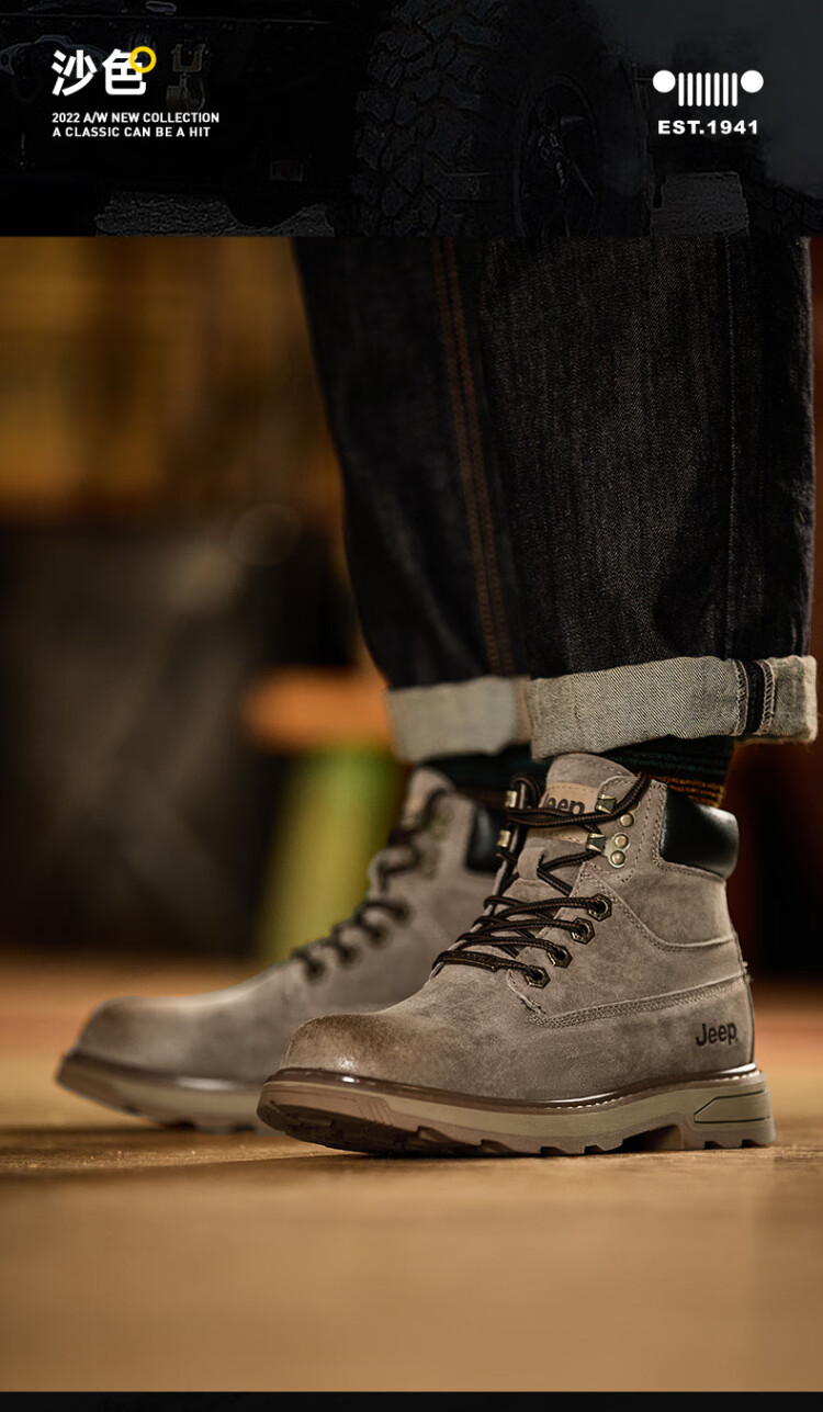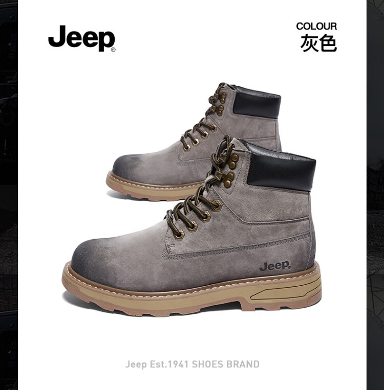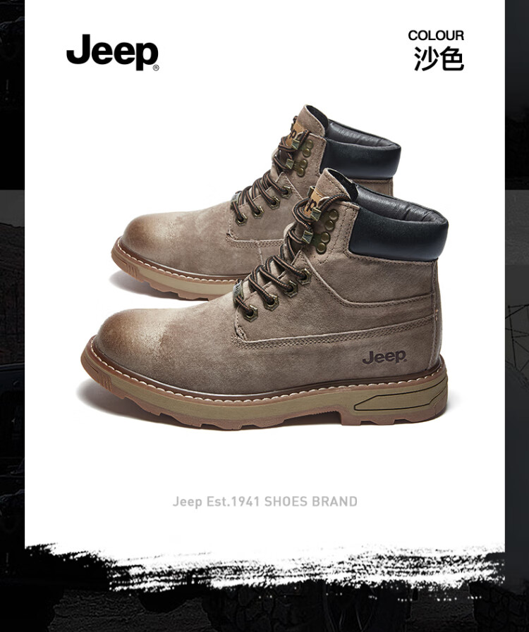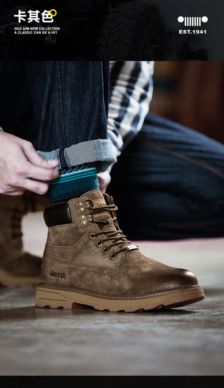 JEEP吉普马丁靴男秋冬季男士高帮百搭复古英伦风增高工装大黄靴子男鞋 卡其色 42