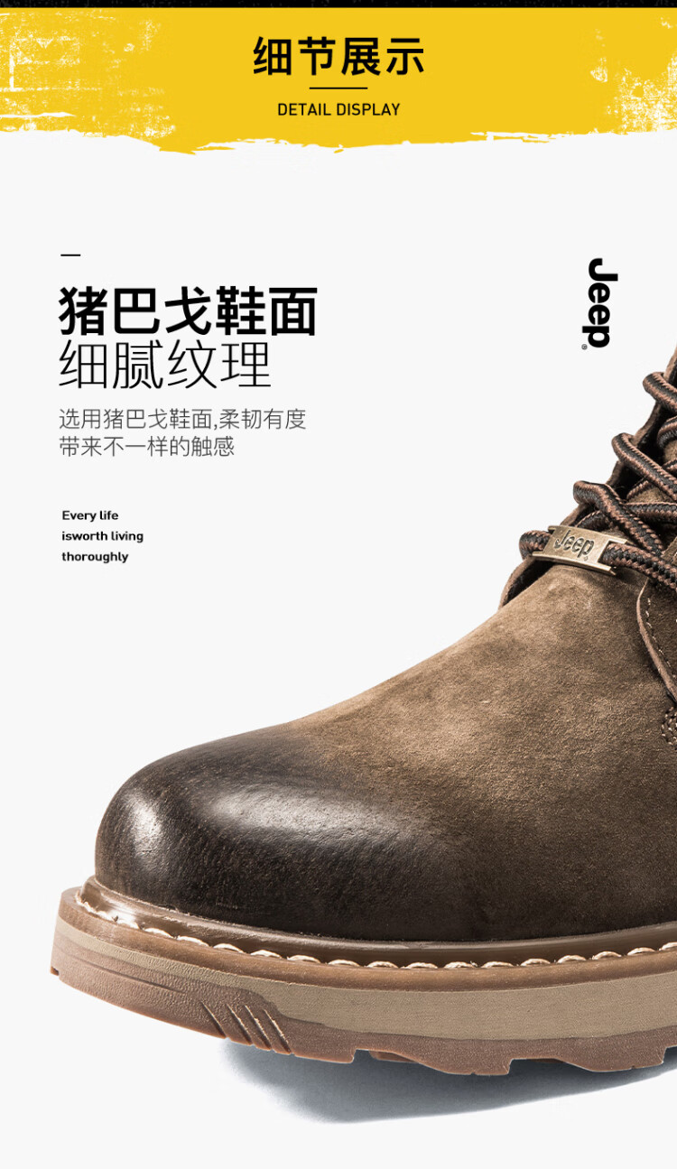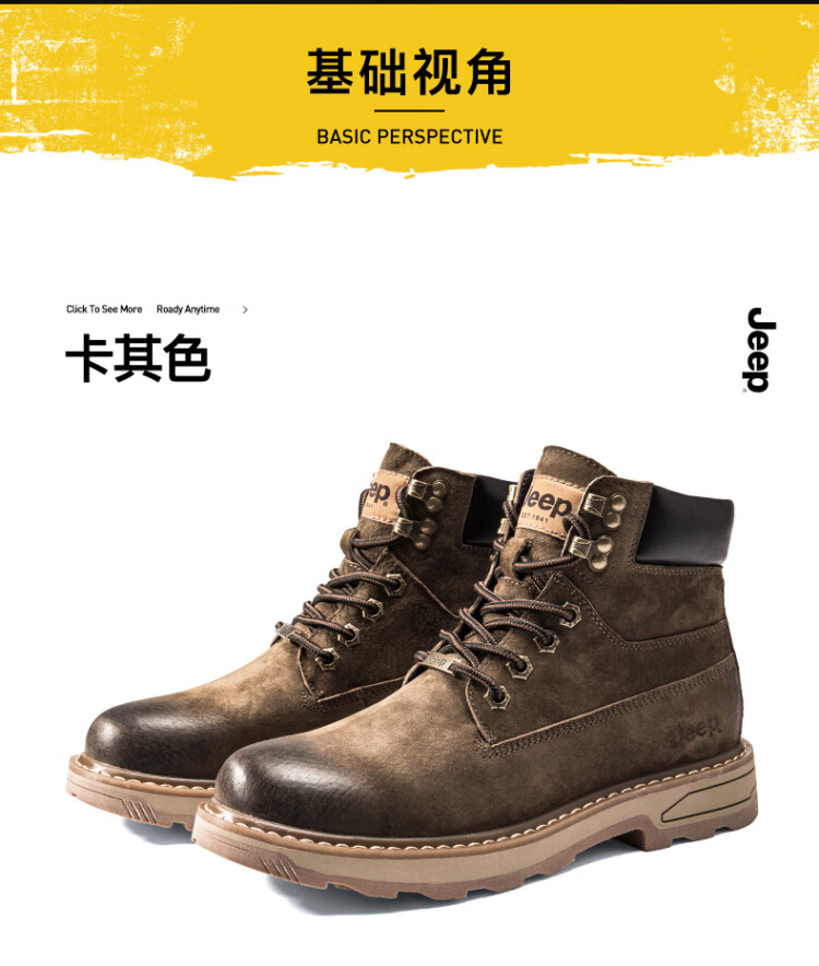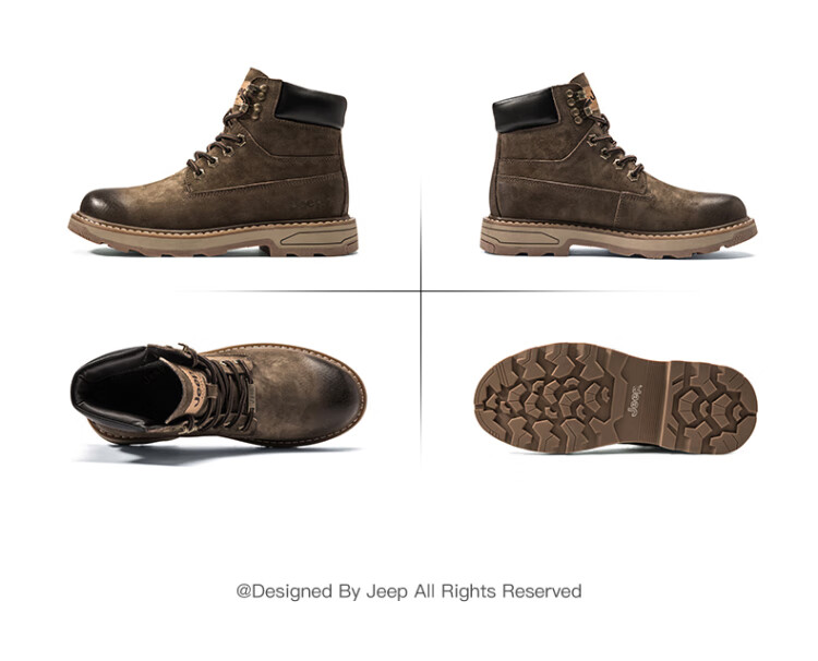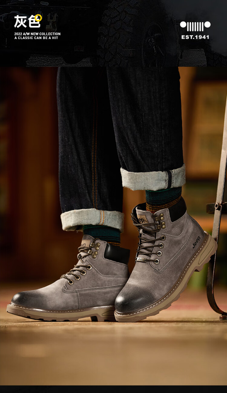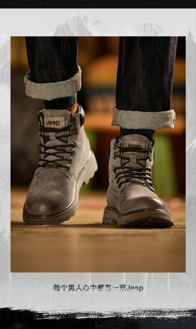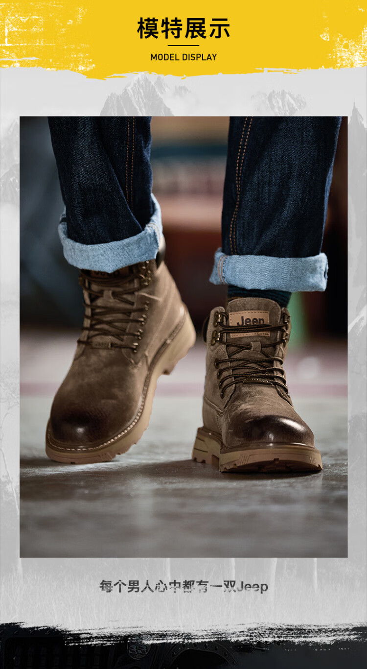 JEEP吉普马丁靴男秋冬季男士高帮百搭复古英伦风增高工装大黄靴子男鞋 卡其色 42