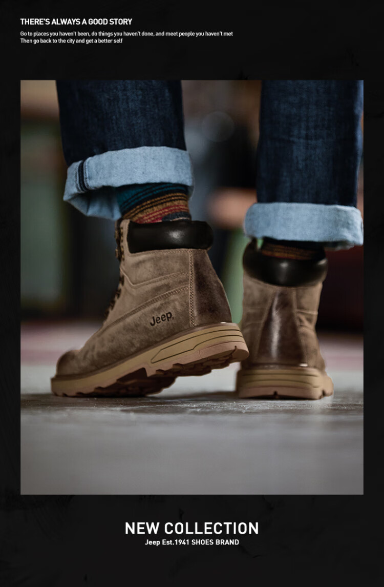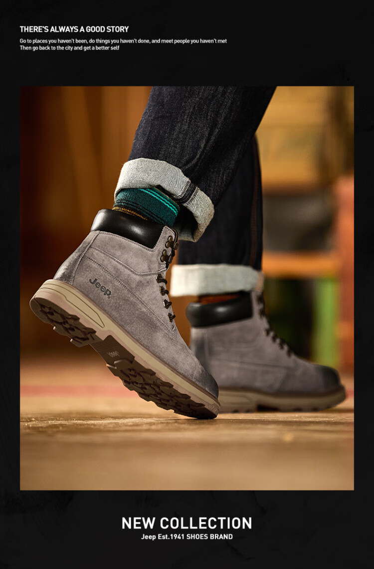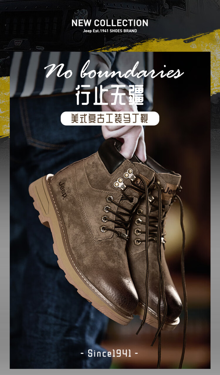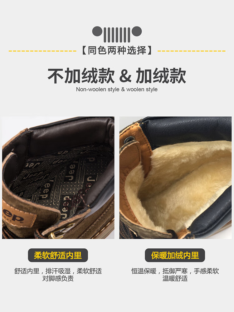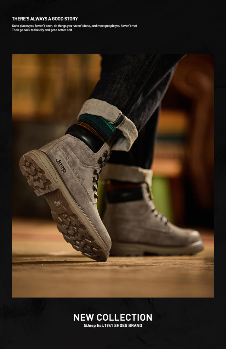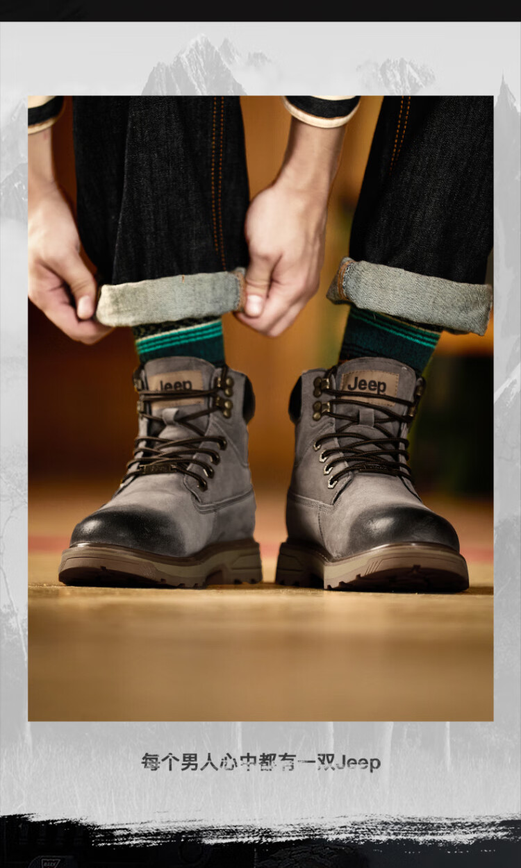 JEEP吉普马丁靴男秋冬季男士高帮百搭复古英伦风增高工装大黄靴子男鞋 卡其色 42