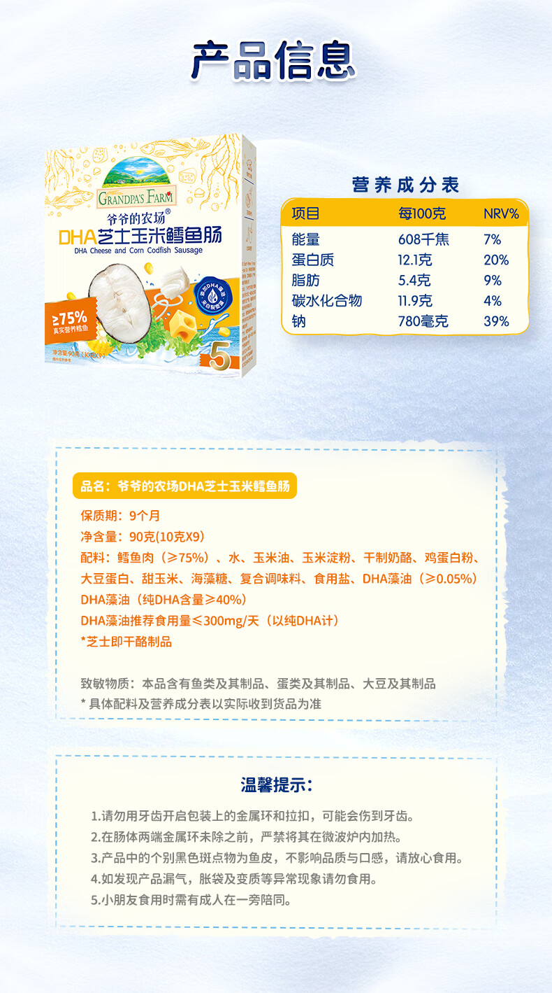 爷爷的农场DHA高蛋白鳕鱼肠儿童宝宝零食猪肉扒芝士玉米鱼肠牛乳棒奶酪块 【DHA】高蛋白鳕鱼肠90g