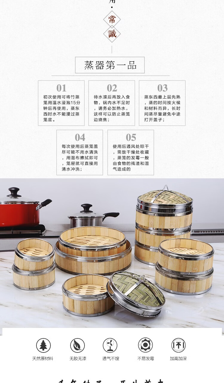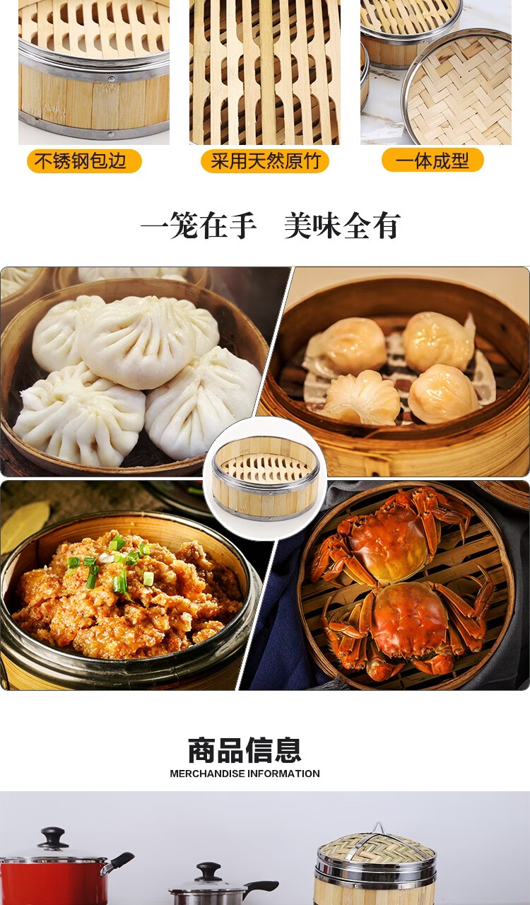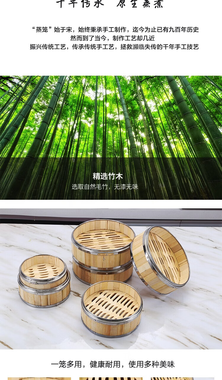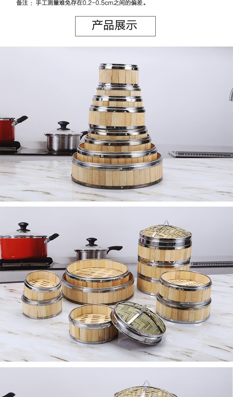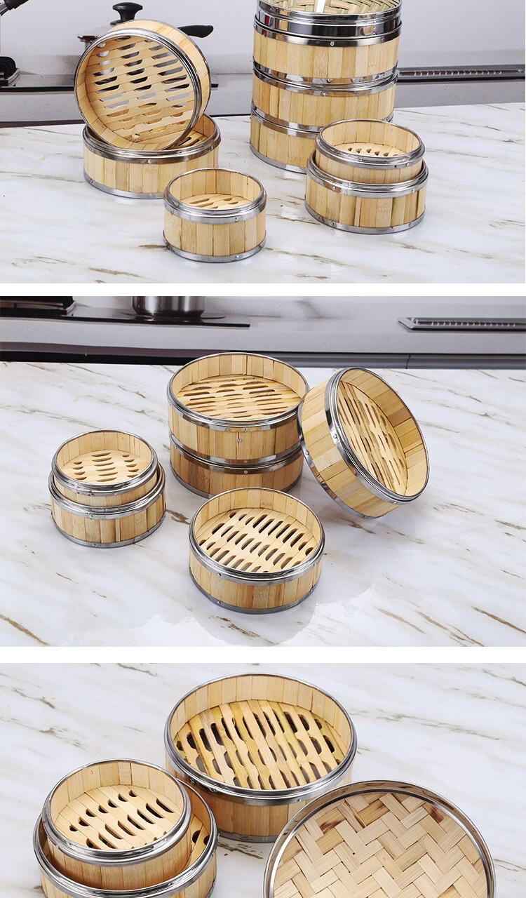 咏夏家用蒸笼饭蒸屉小笼包蒸饭笼不锈钢包边蒸格广式早茶餐厅竹制蒸笼 16cm2笼1盖(送2张布垫)
