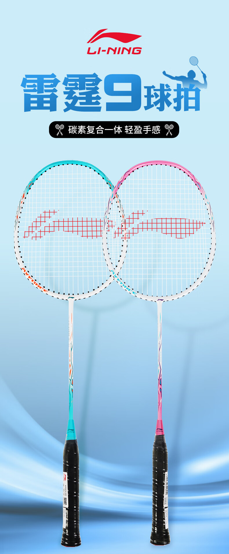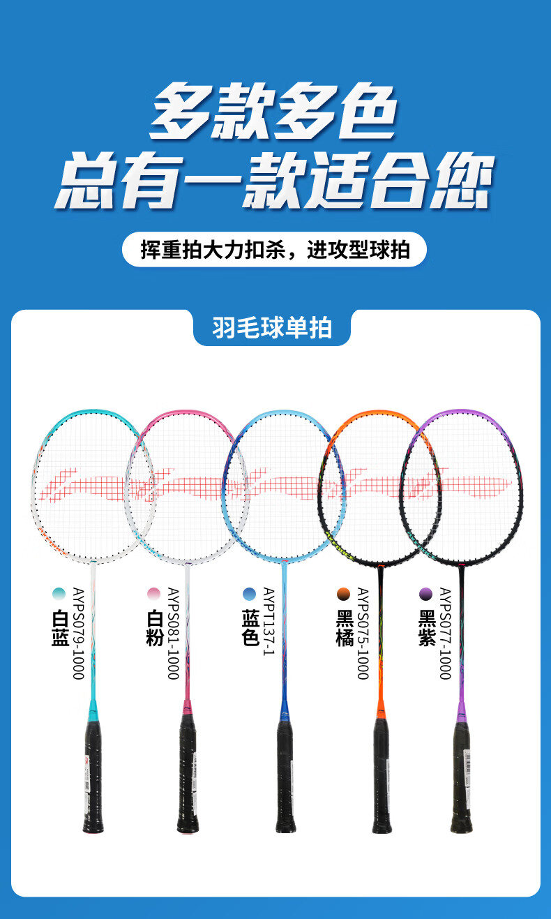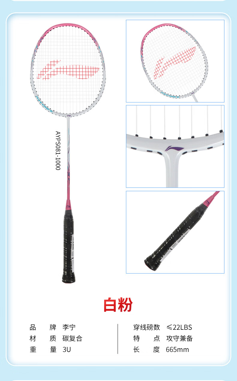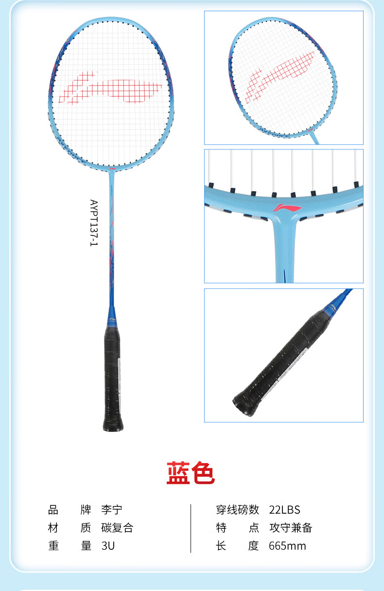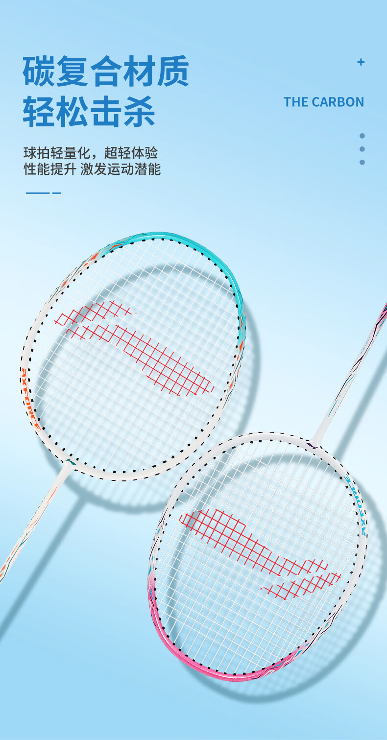 李宁羽毛球拍耐用型单双拍超轻碳素纤维学生业余初学套装雷霆9 1只装 碧空蓝AYPT137