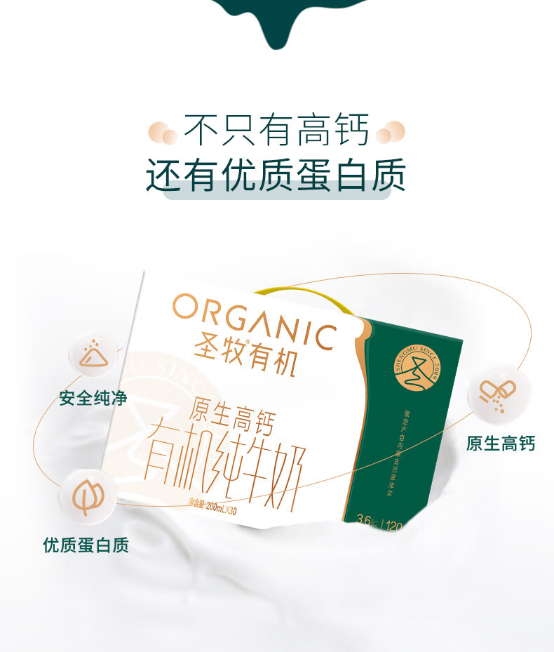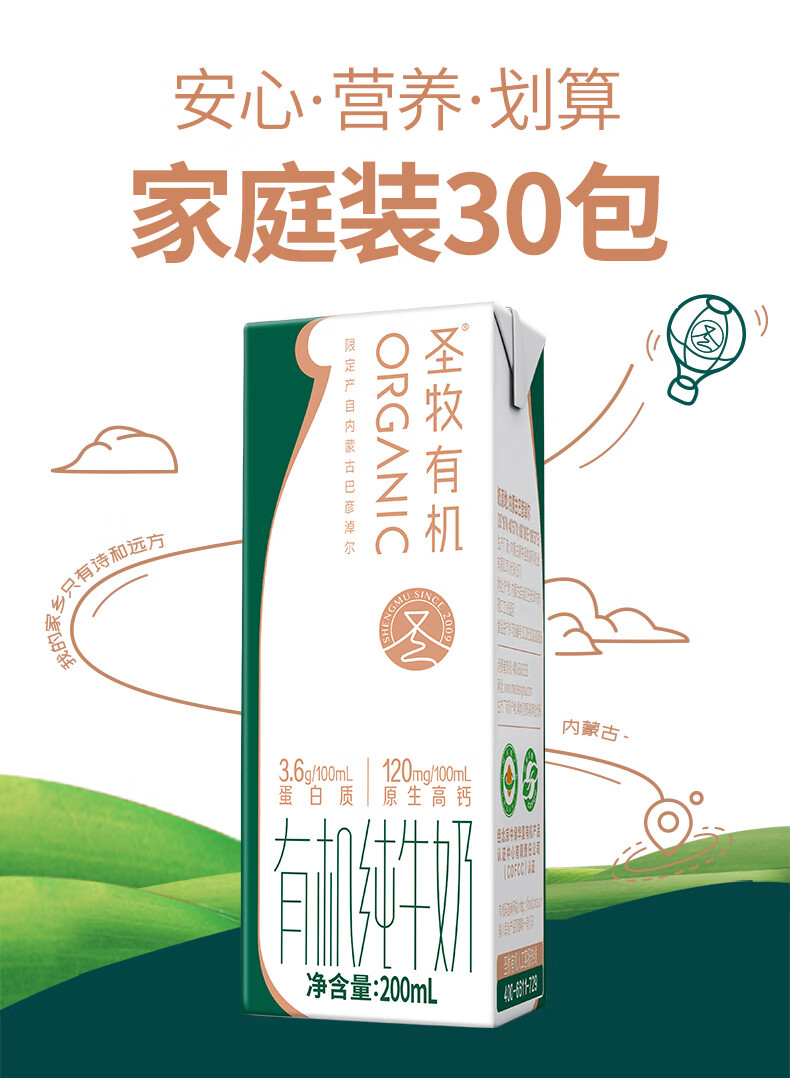 圣牧有机高钙纯牛奶 3.6g蛋白 礼盒 【家庭量贩装】200ml*30盒