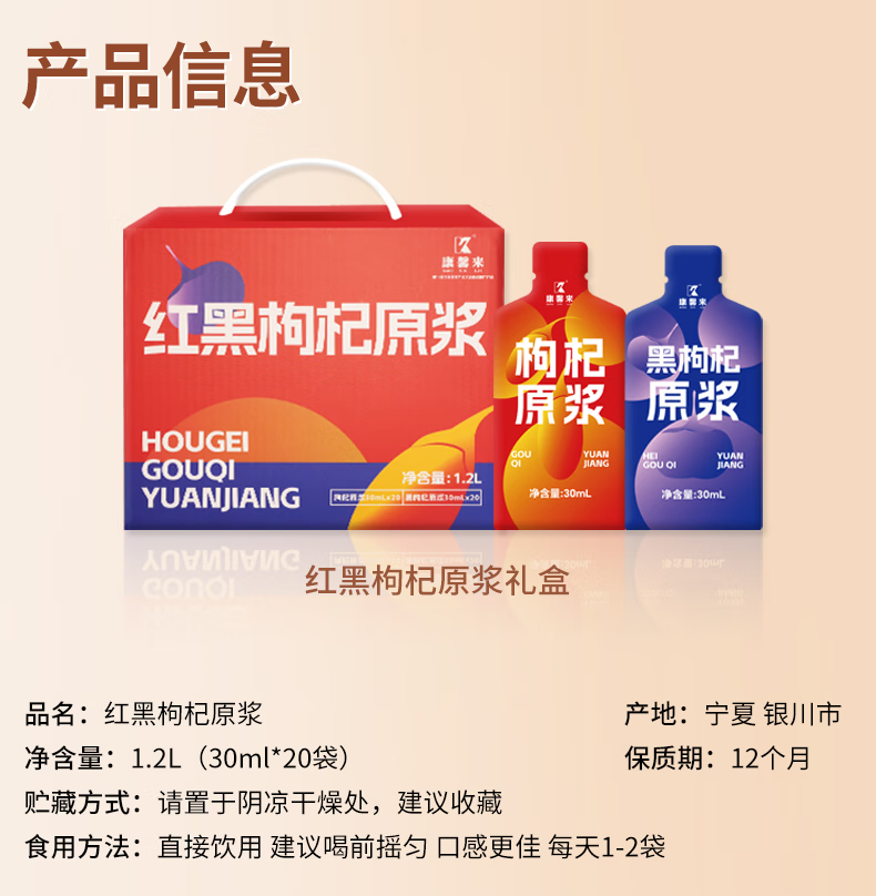 康馨来红黑枸杞原浆组合宁夏产地鲜果鲜榨不注水枸杞原汁原浆送家人长辈 康馨来黑枸杞原浆1200ml【40袋黑枸杞】