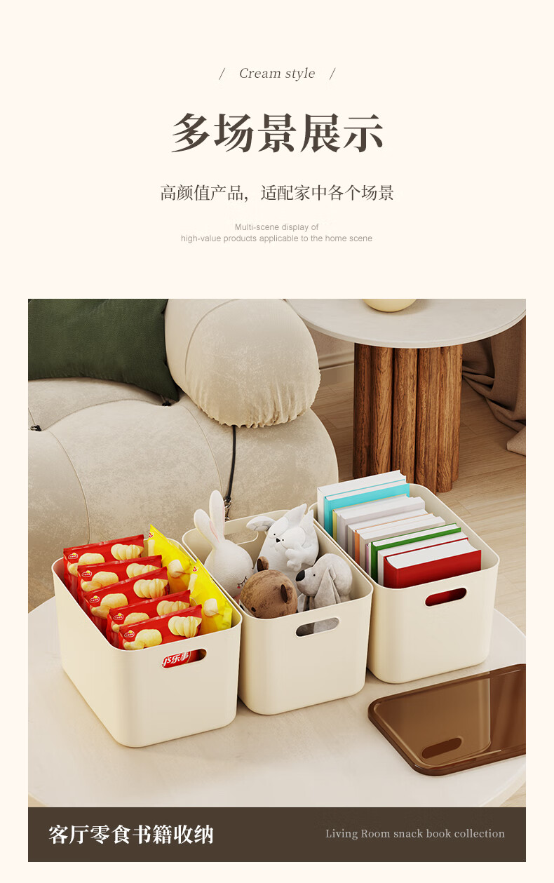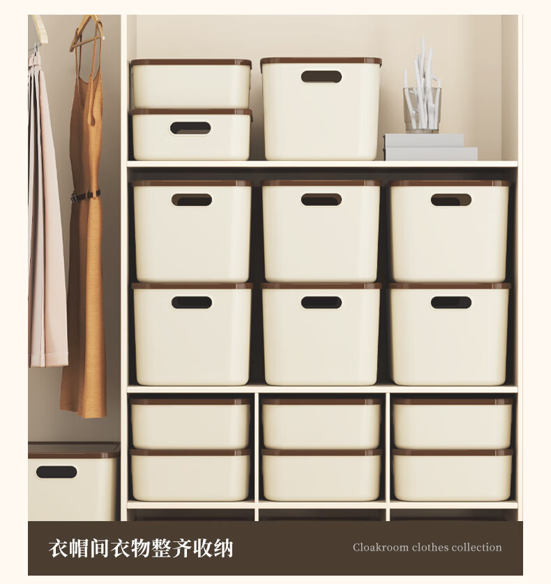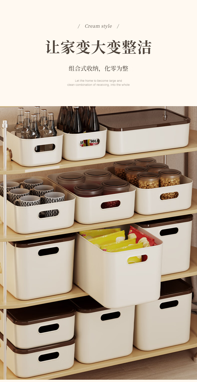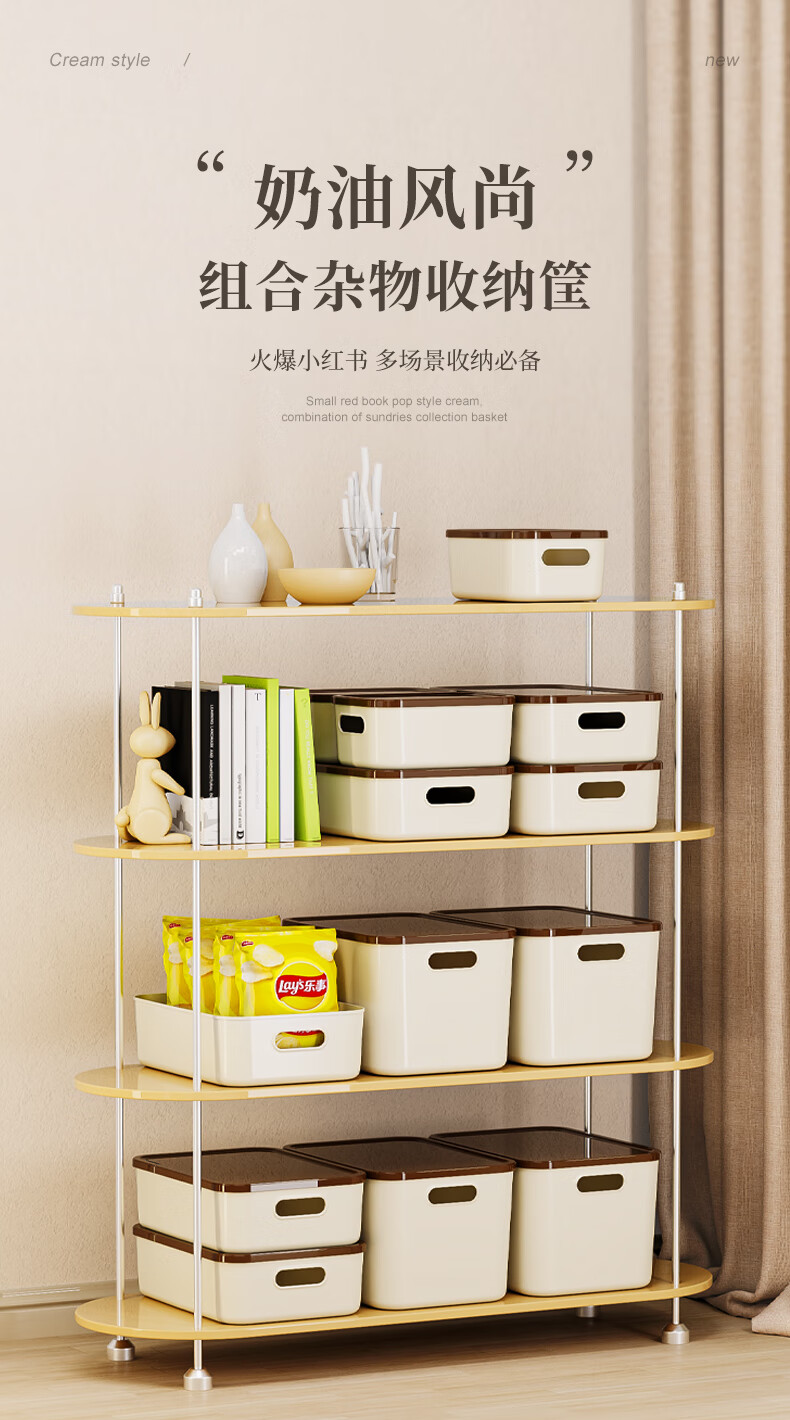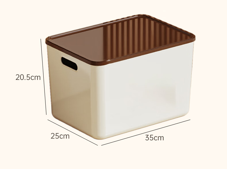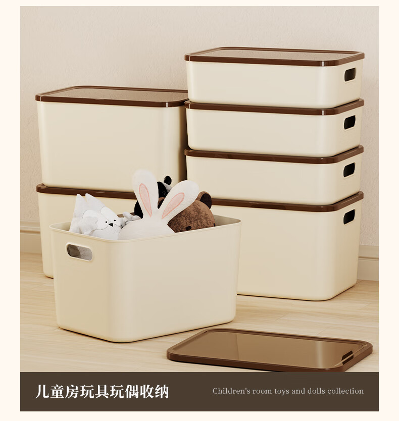 稻草熊桌面收纳盒家用杂物零食化妆品整理收纳箱长方形带盖储物箱收纳篮 奶咖极简收纳盒【35*25*20.5cm】 3个装