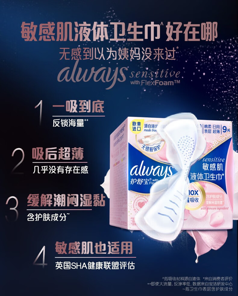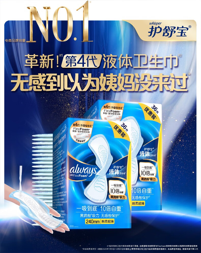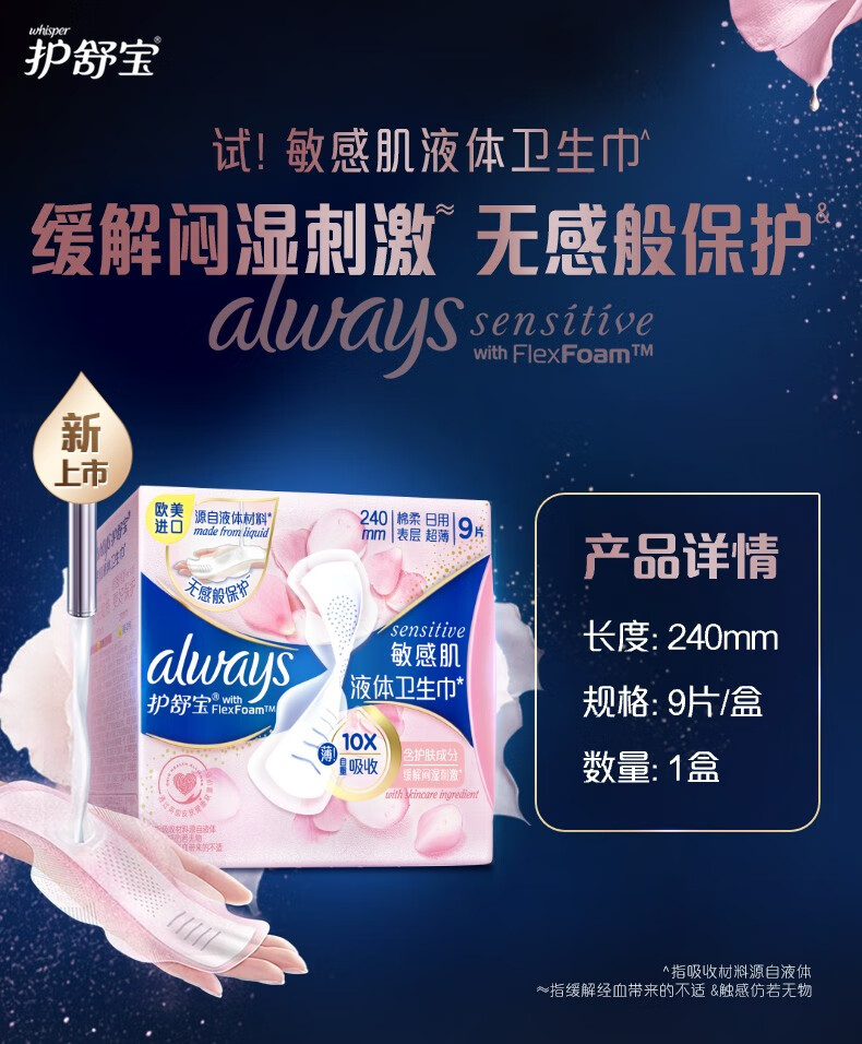 护舒宝升级敏感肌液体卫生巾姨妈巾日用夜用护肤款超薄透气无感保护官方 【经典液体】 240mm 72片
