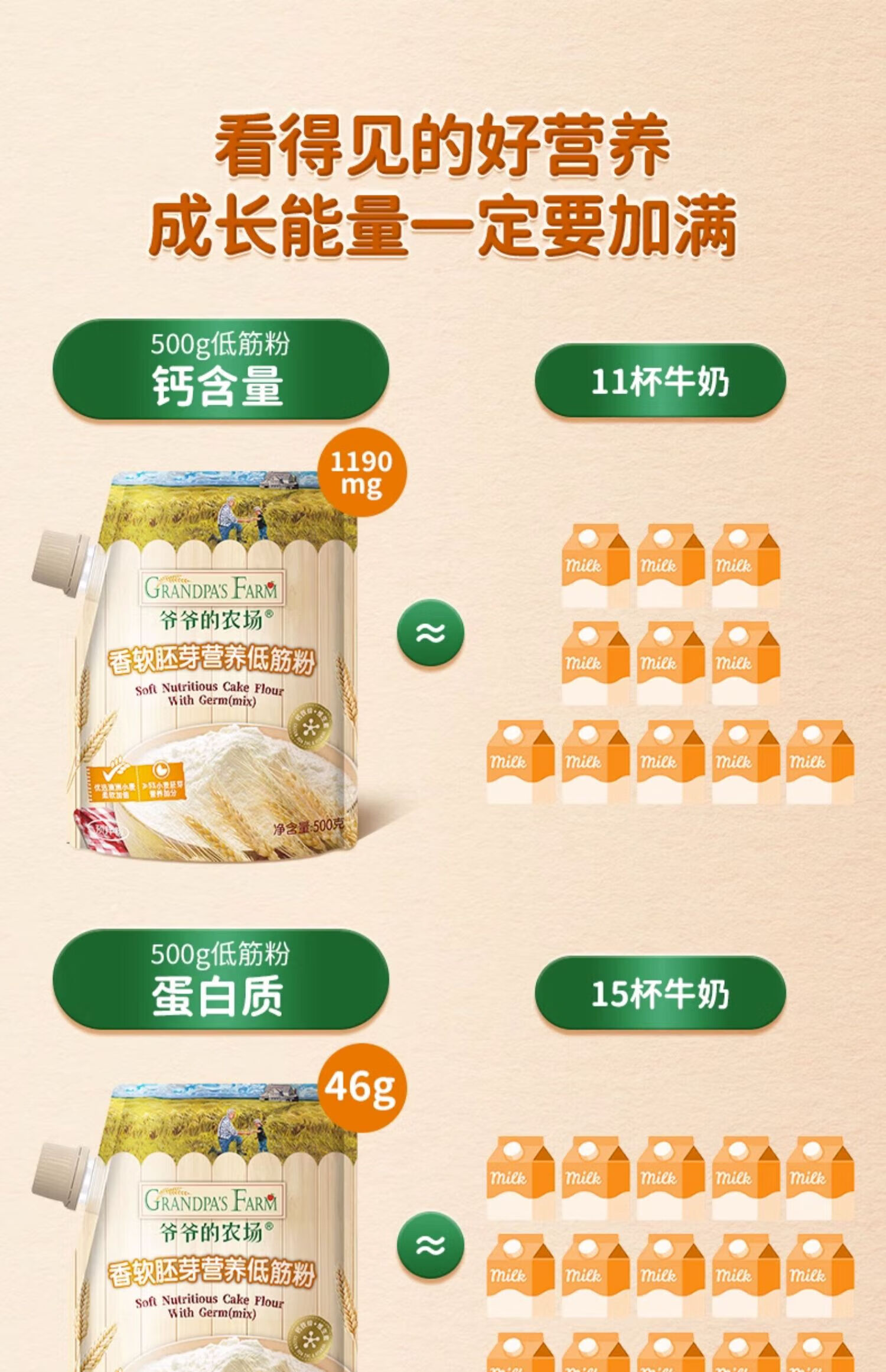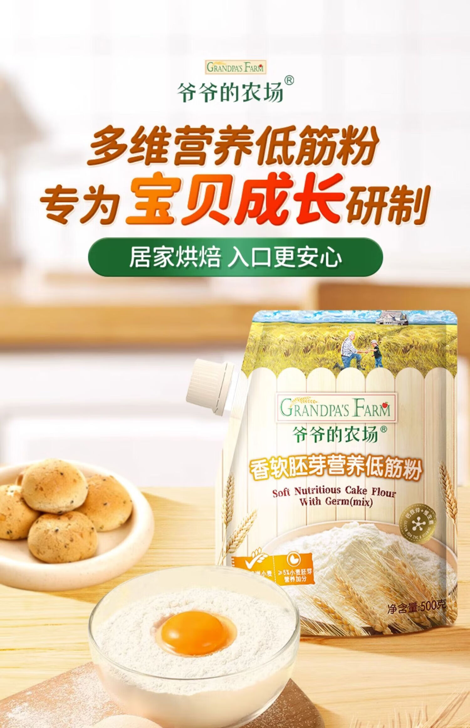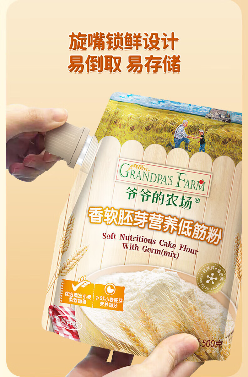 爷爷的农场香软胚芽营养低筋粉500g 小麦营养低筋面粉制作蛋糕松饼粉糕点粉 香软胚芽营养低筋粉 500g*1袋