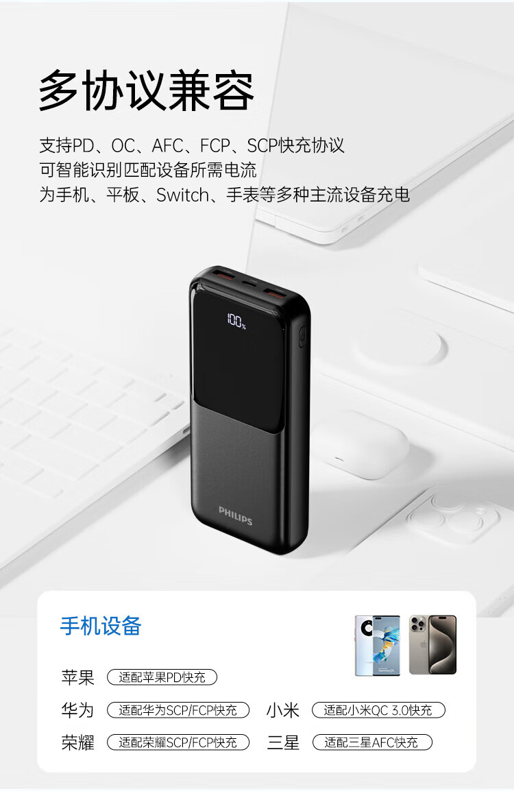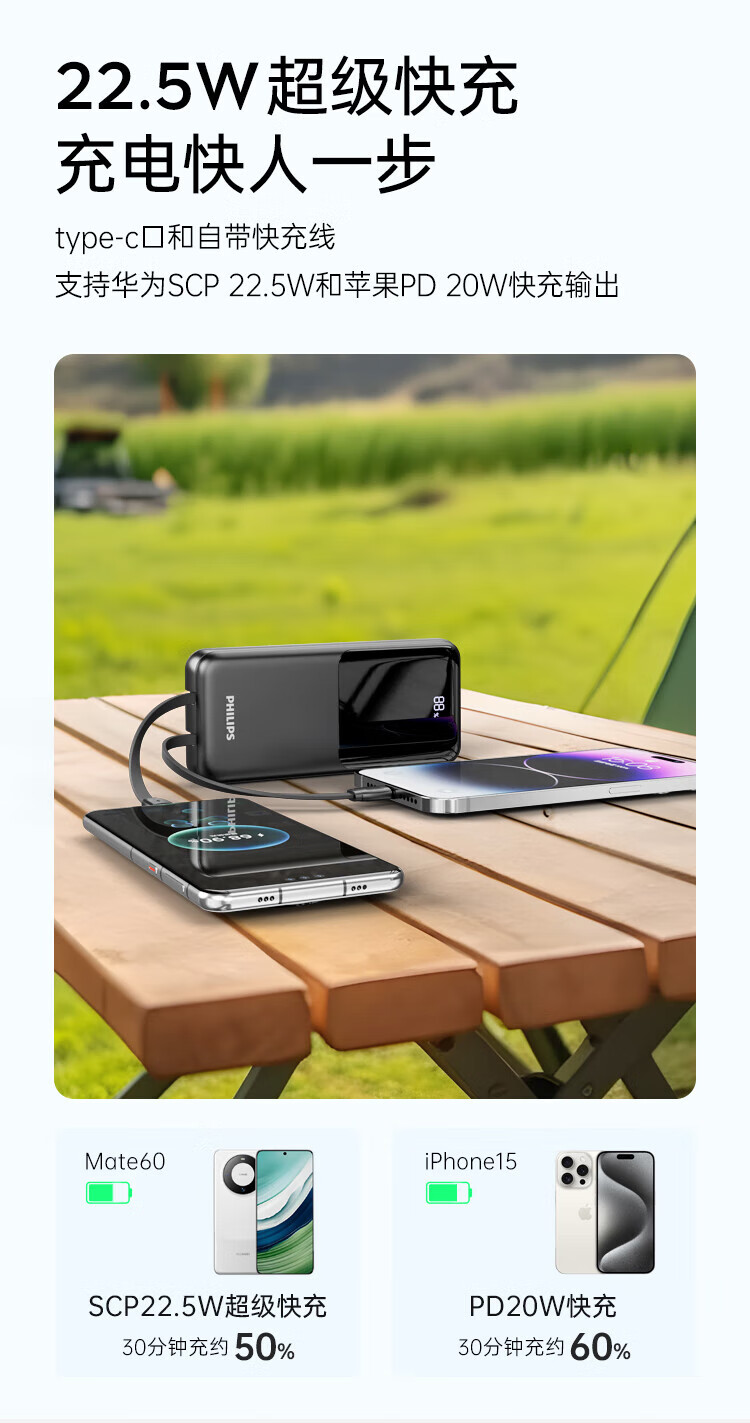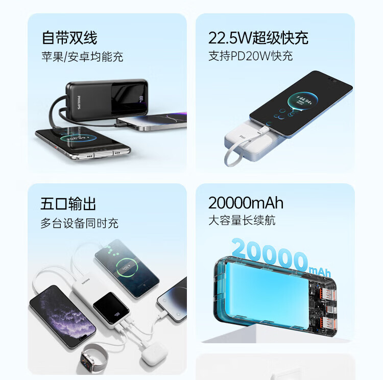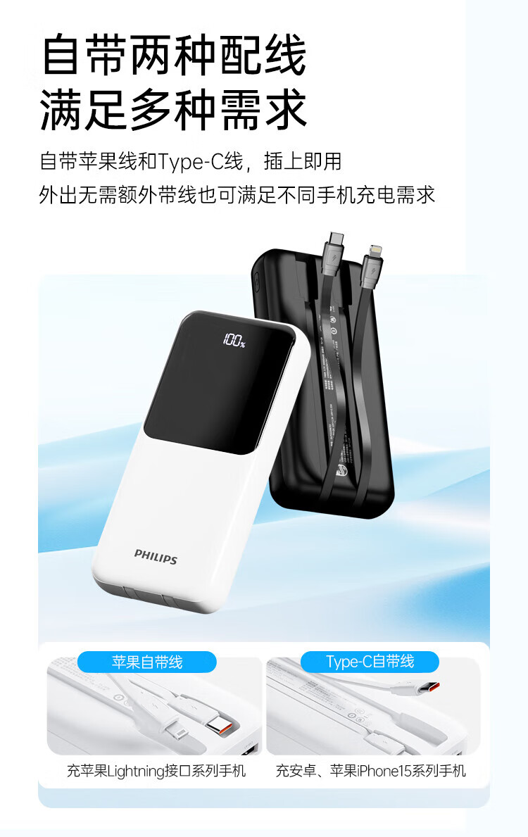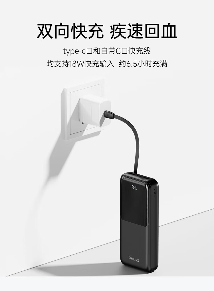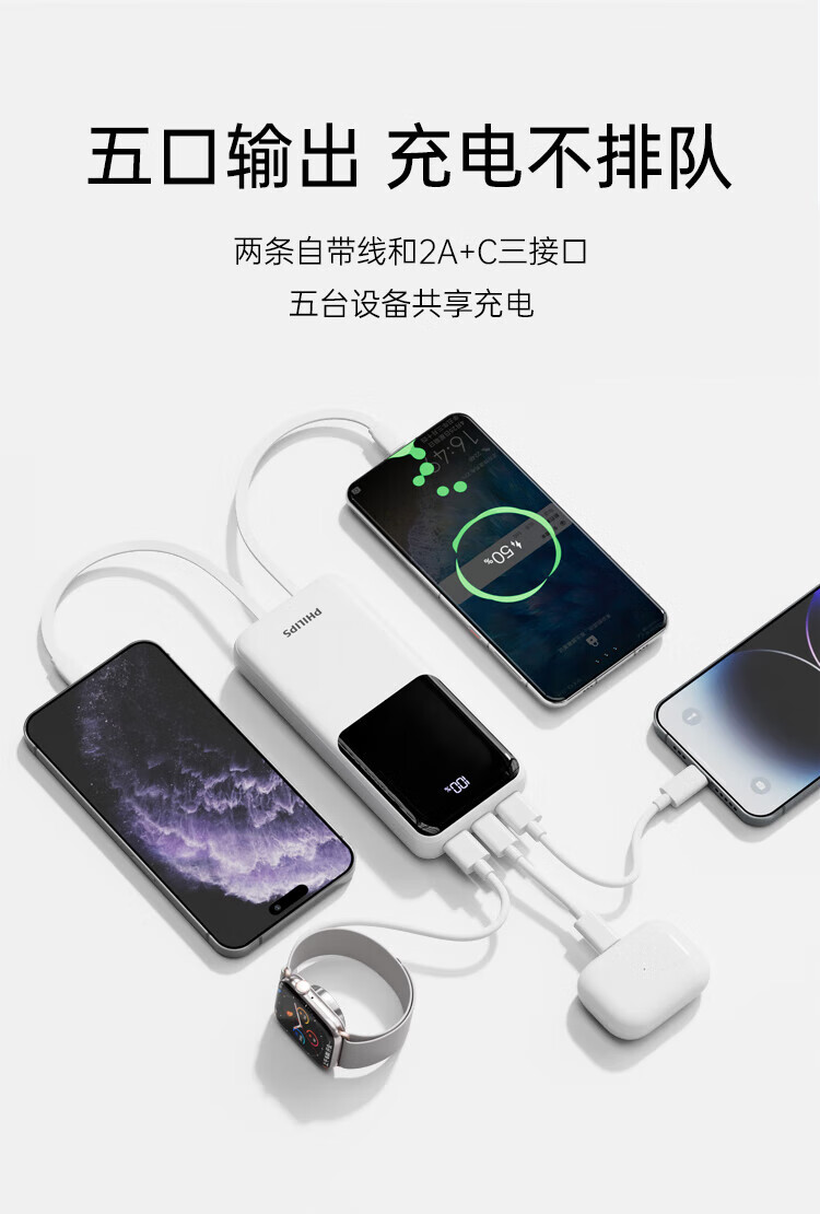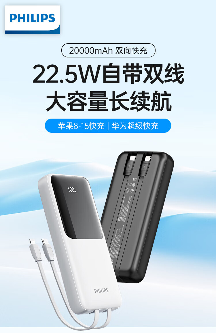 飞利浦(PHILIPS)充电宝可携带上飞机 3C认证 自带双线20000mAh移动电源22.5W超级快充 PD20W快充适用手机通用 DLP2206【白色】20000毫安