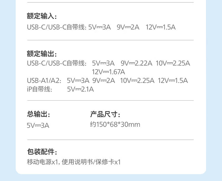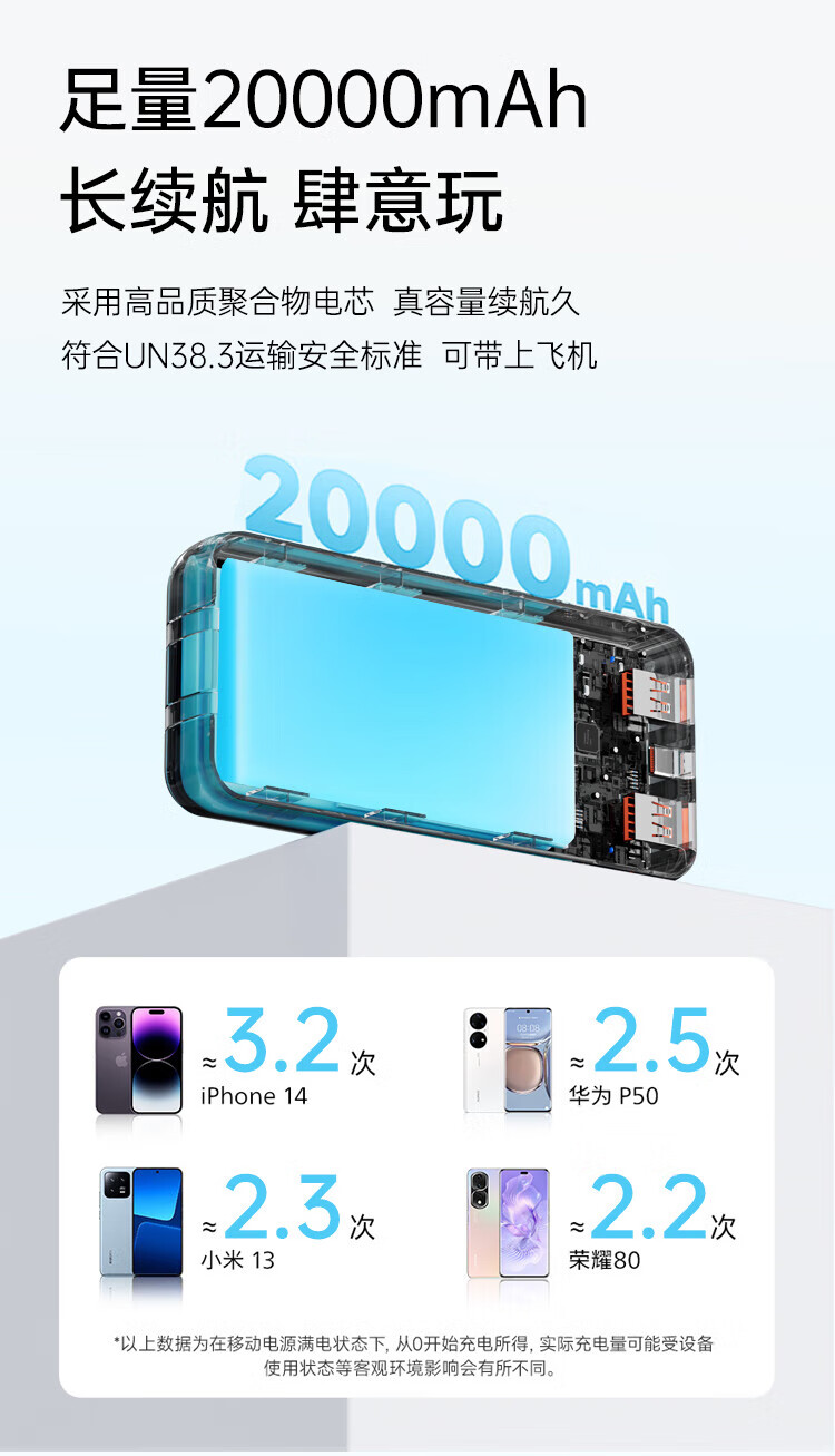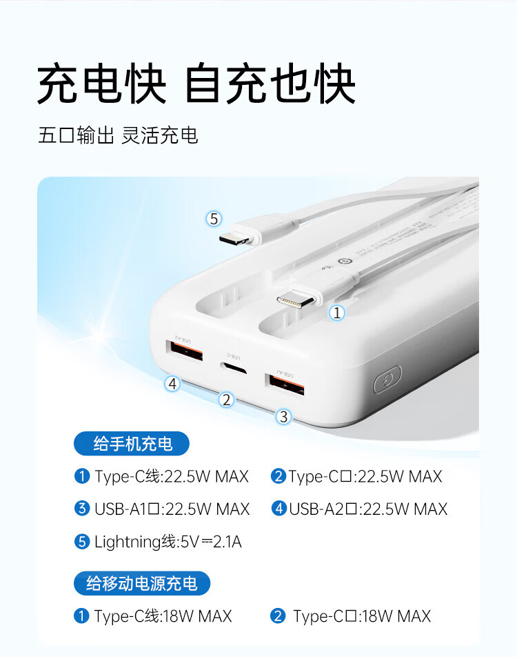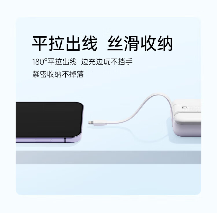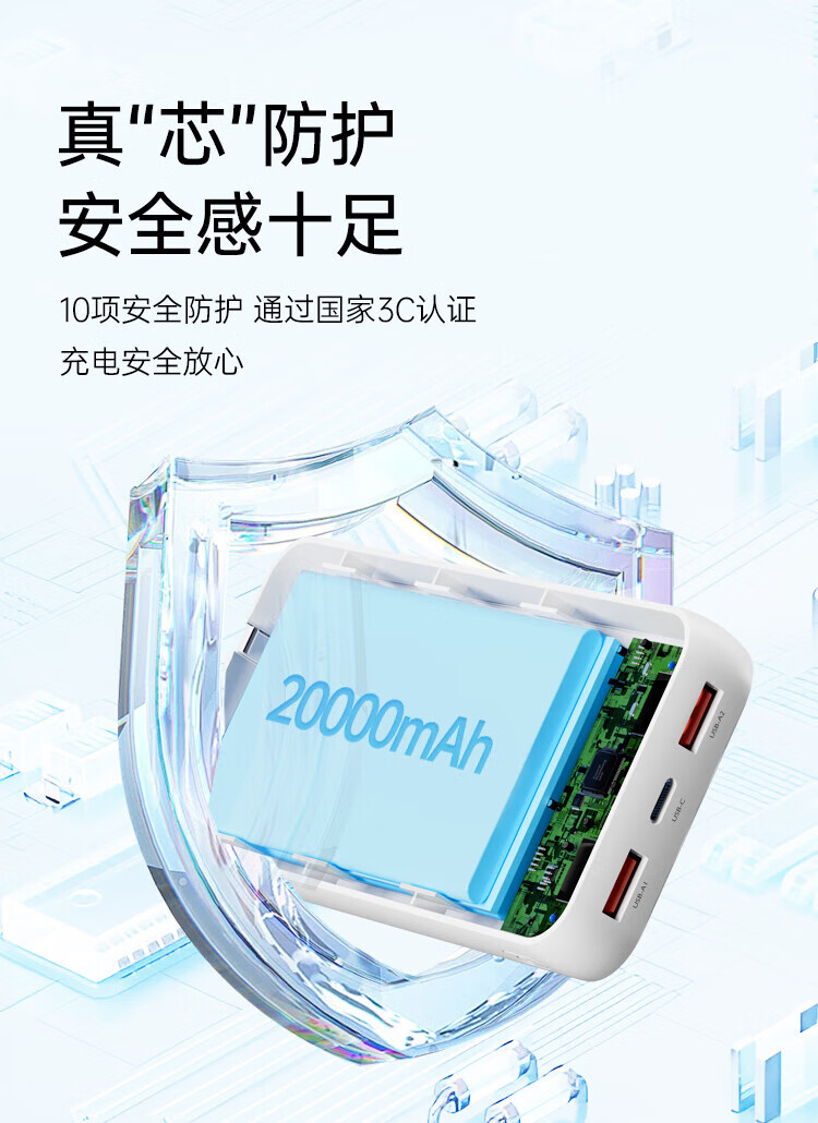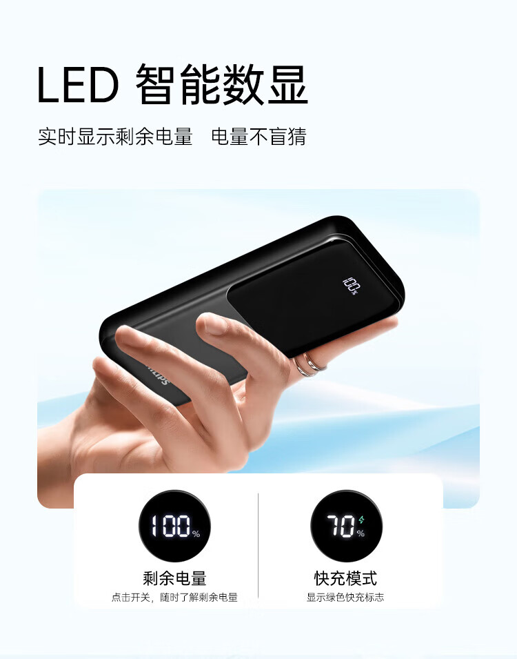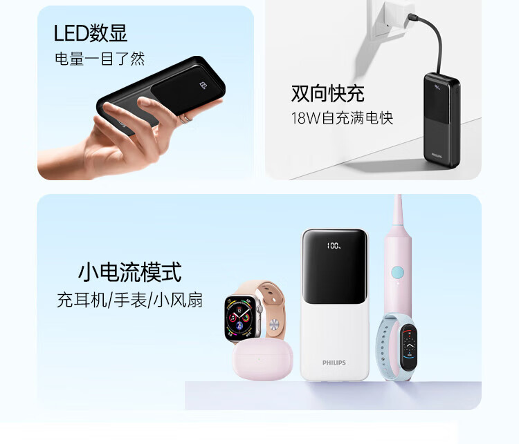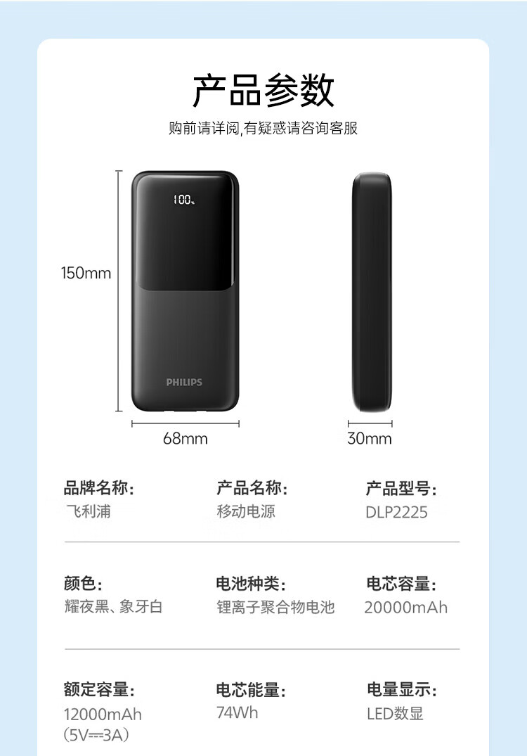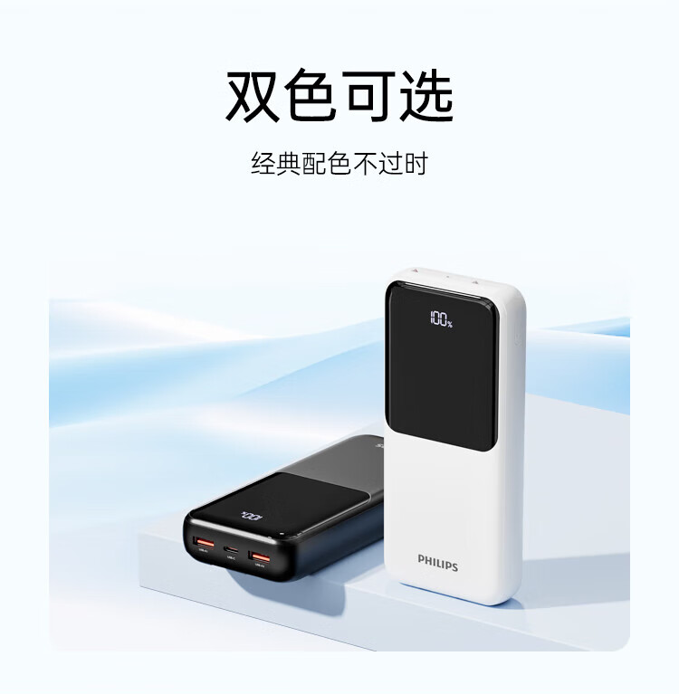 飞利浦(PHILIPS)充电宝可携带上飞机 3C认证 自带双线20000mAh移动电源22.5W超级快充 PD20W快充适用手机通用 DLP2206【白色】20000毫安