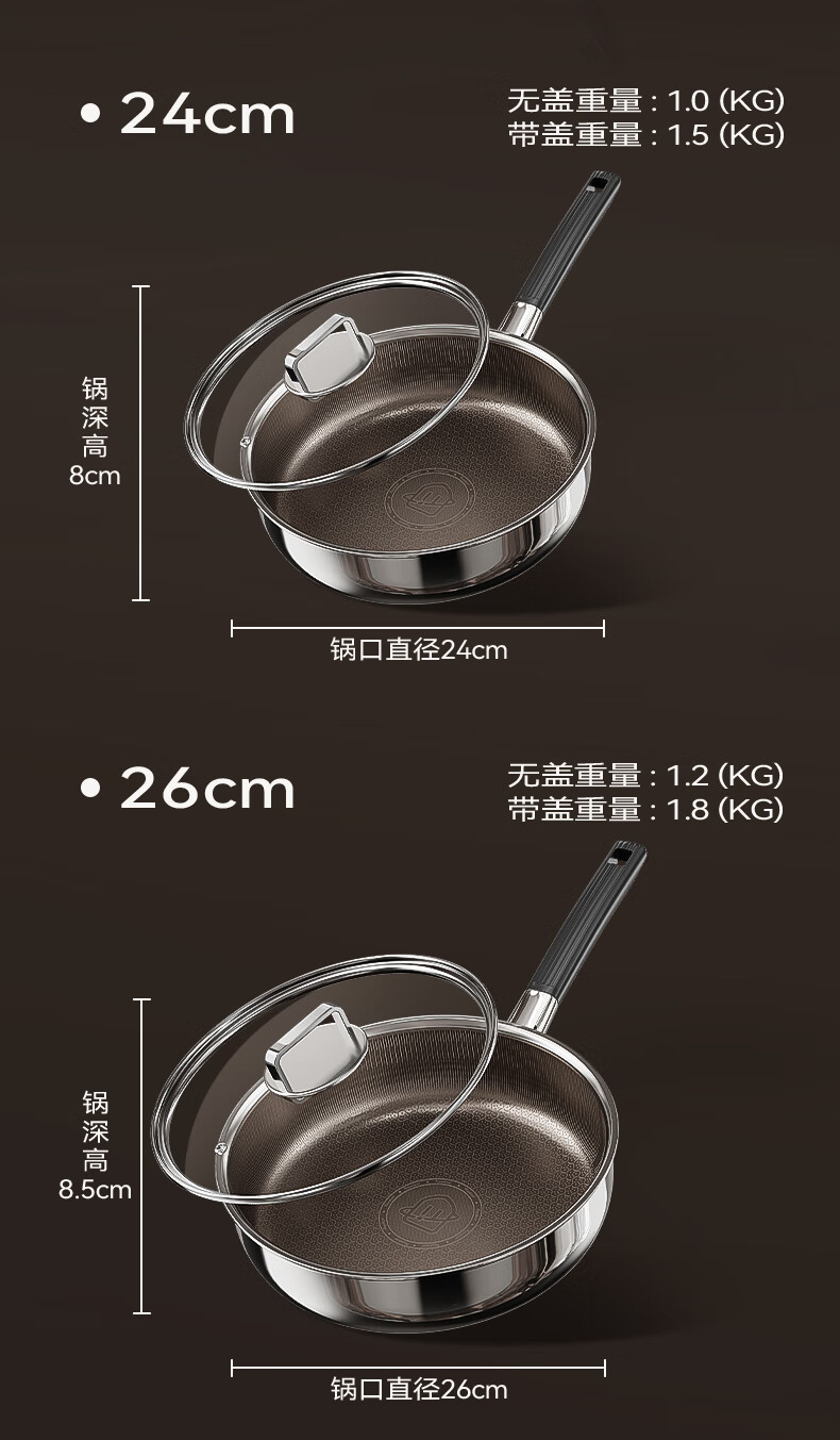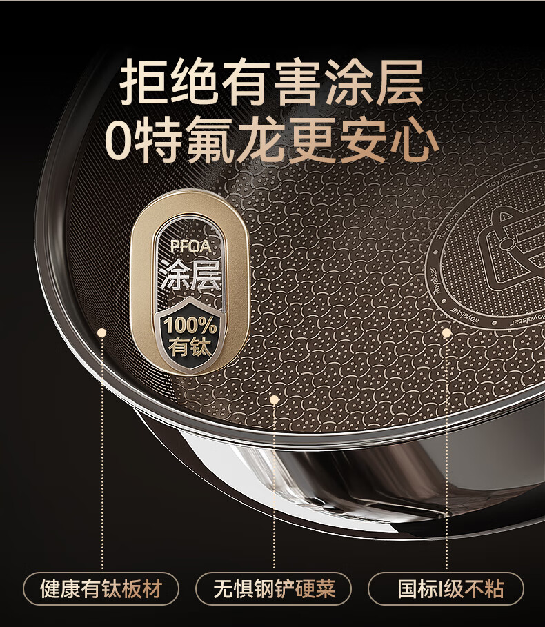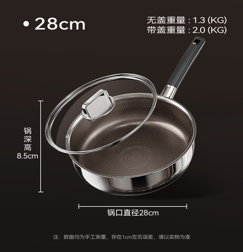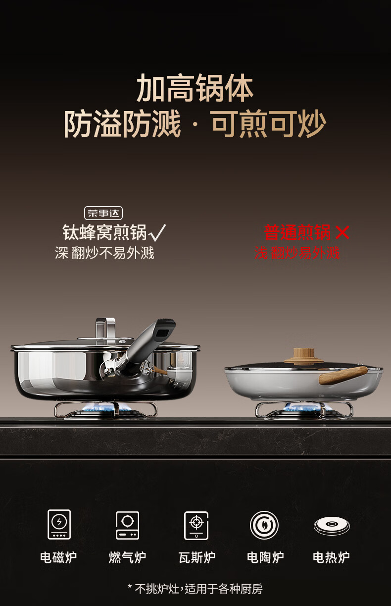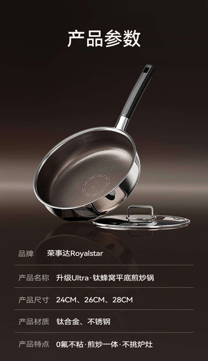 荣事达无涂层钛平底不粘锅家用不锈钢蜂窝电磁炉煤气灶炒菜深煎锅 【带盖】持久不粘 聚油不凸底 2-5人适用 28cm