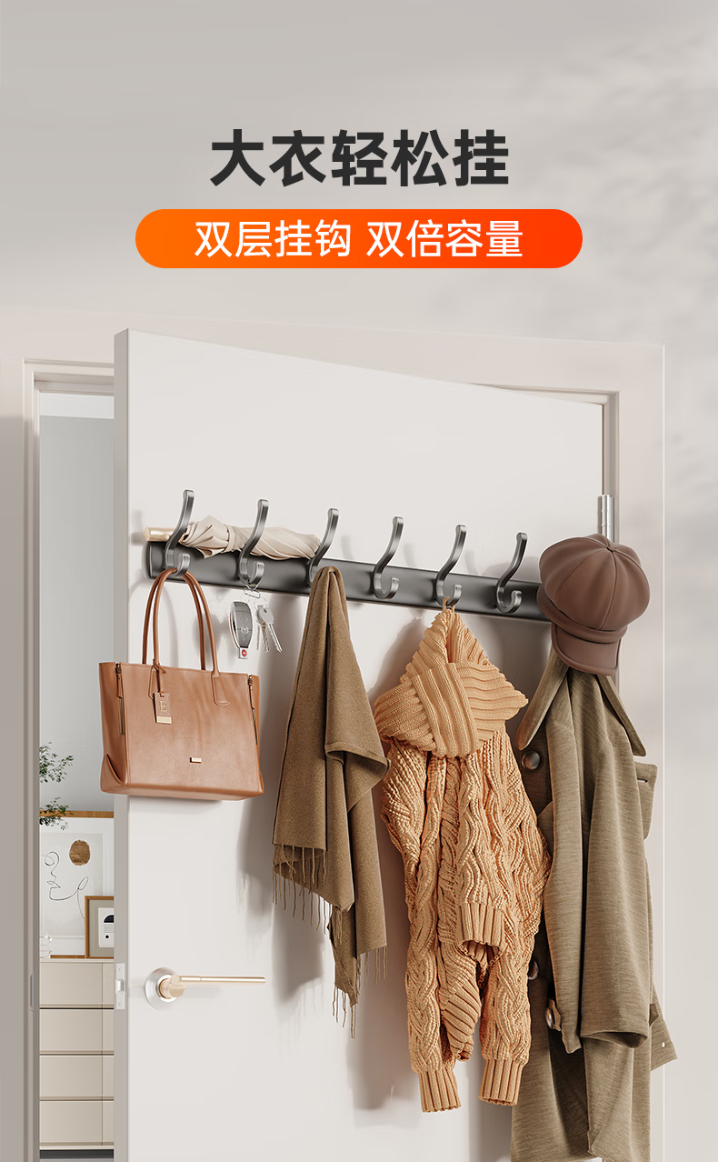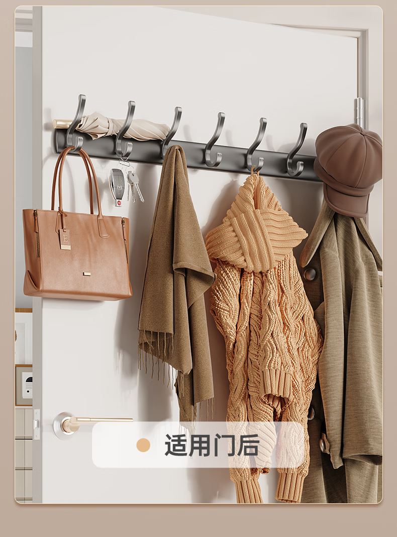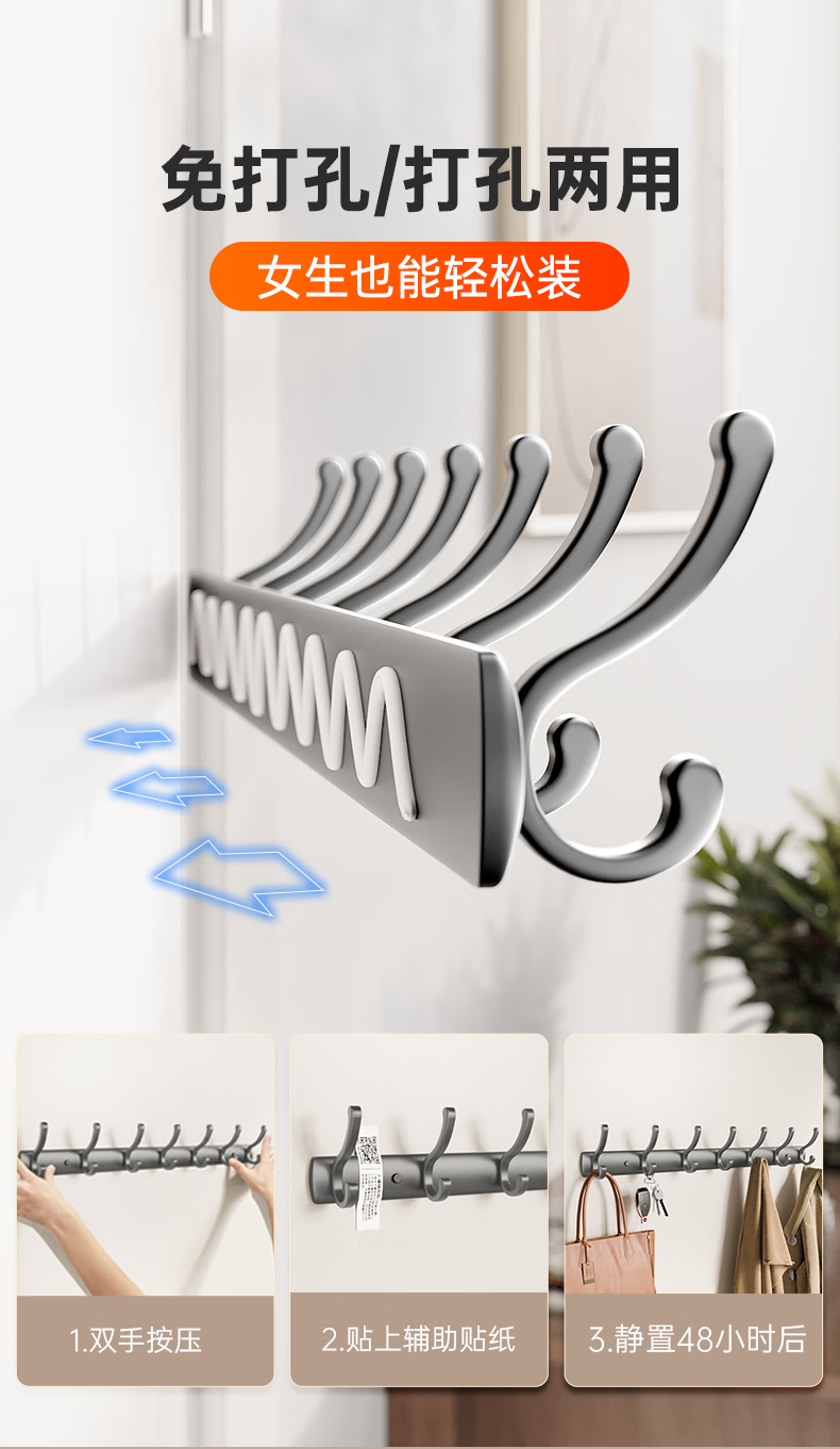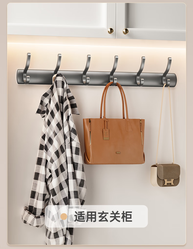 WCZ德国挂衣架墙上壁挂门后挂衣钩免打孔强力承重进门玄关衣服挂架衣 枪灰凤尾4钩(加免钉胶和打孔螺丝包)