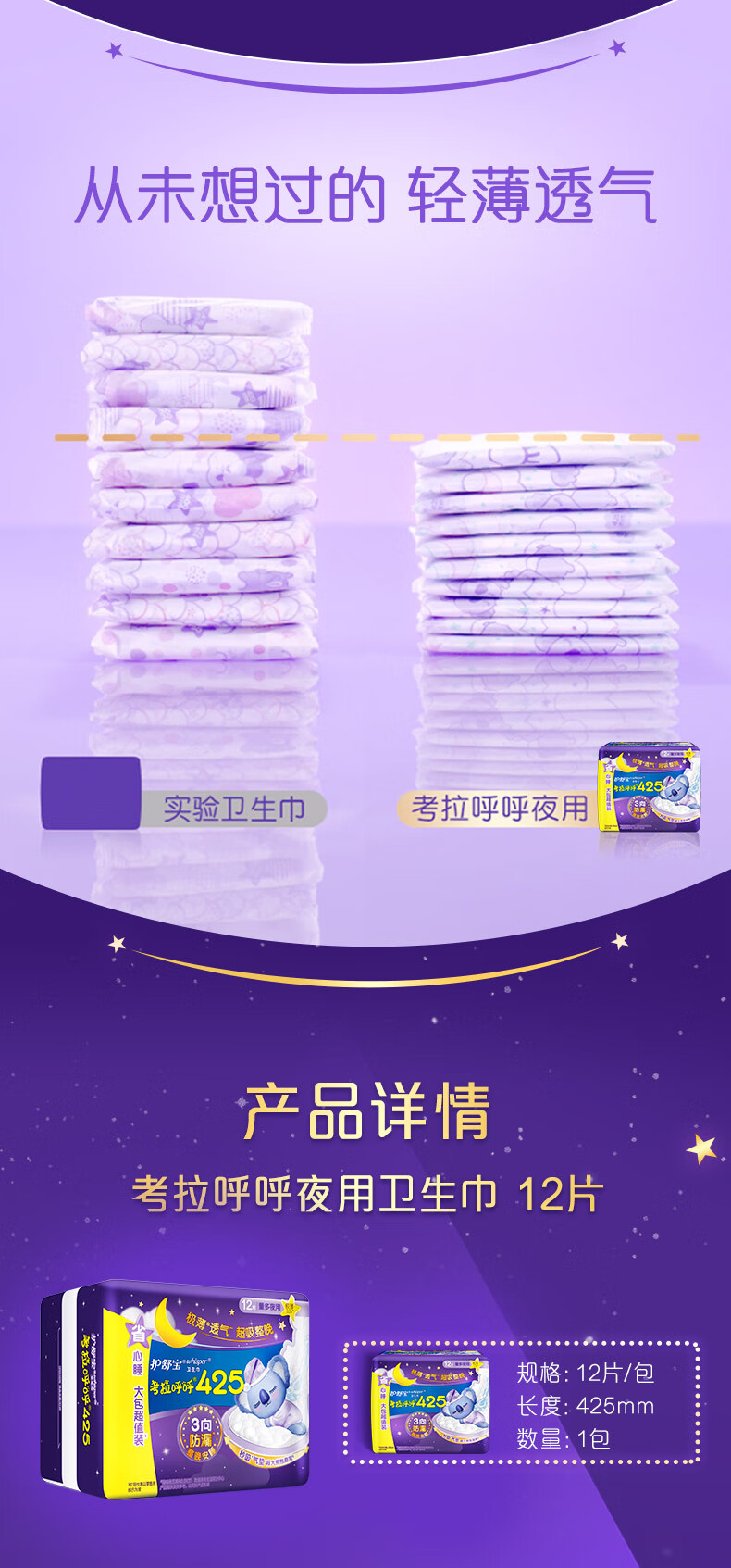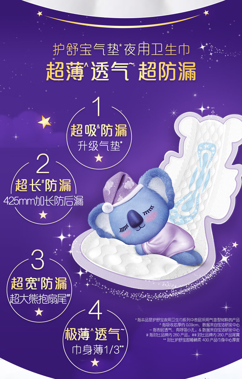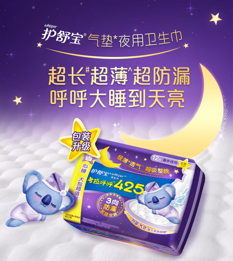 护舒宝考拉呼呼超长夜用卫生巾425mm12片姨妈巾试用京东自营官方旗舰