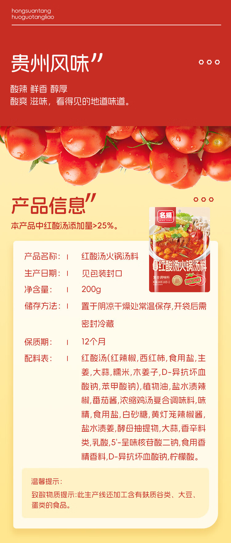 名揚名扬贵州风味红酸汤火锅底料发酵番茄米线鱼肥牛调味料家用 红酸汤火锅底料200g*2袋