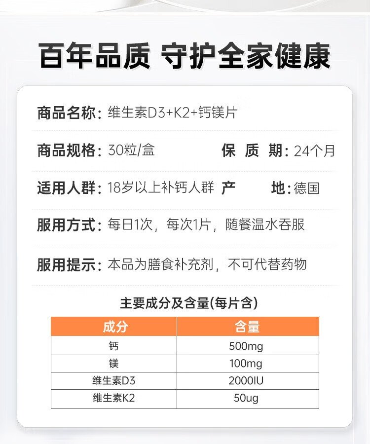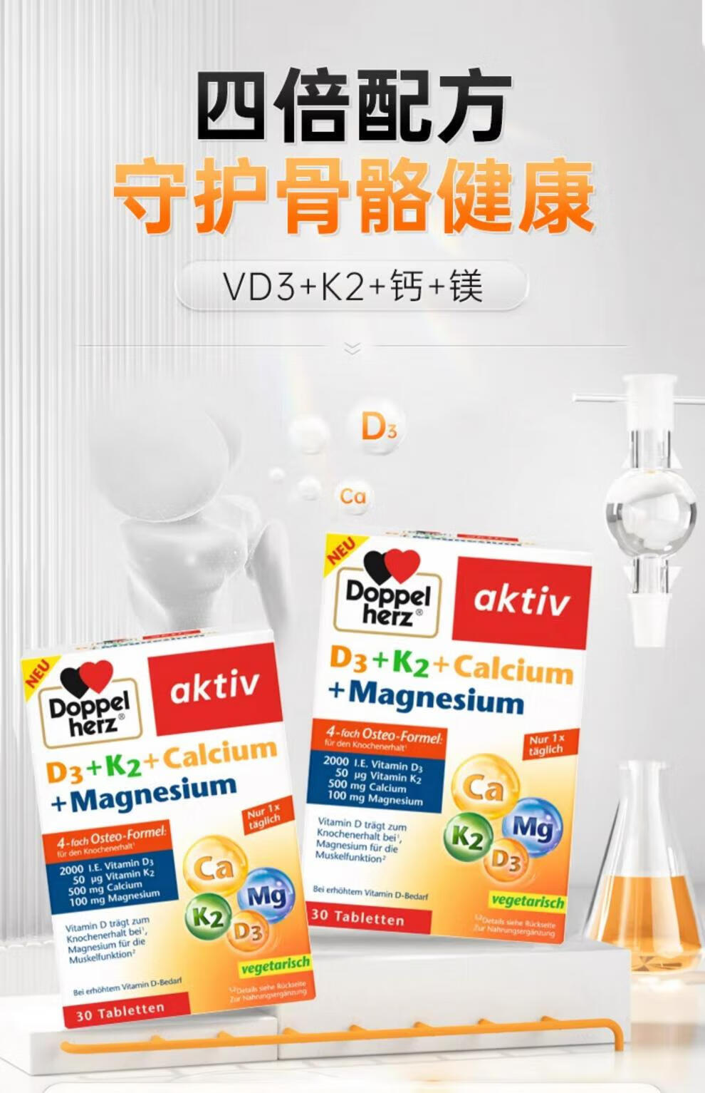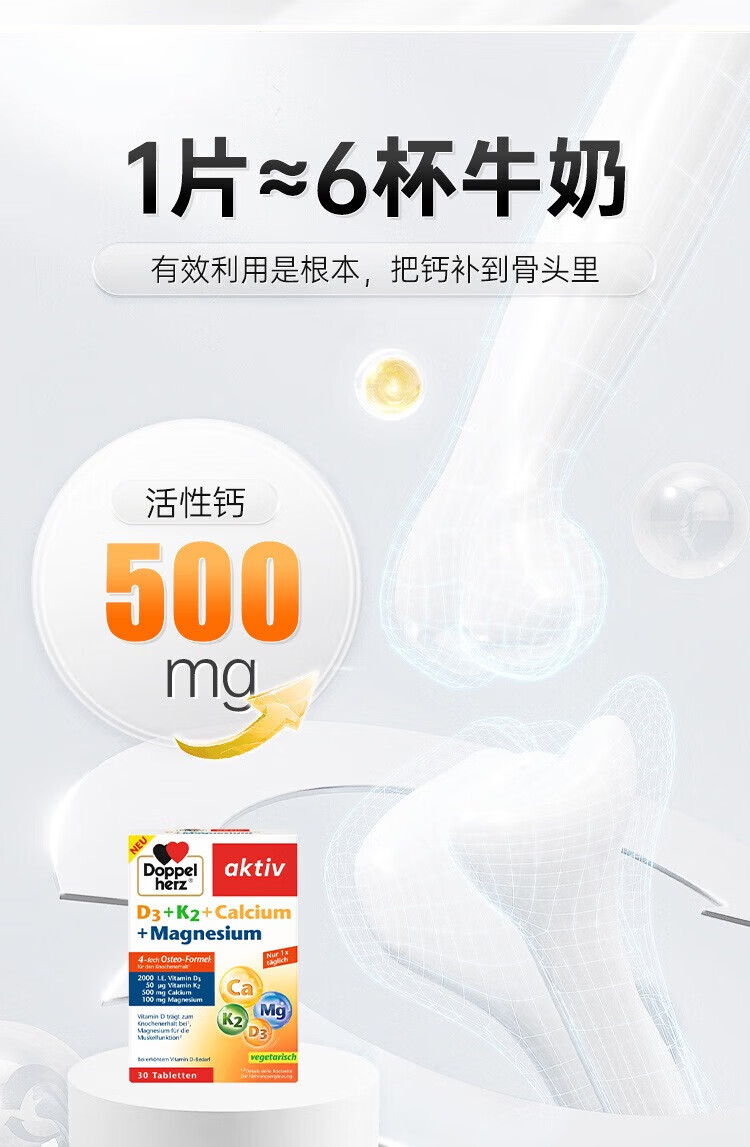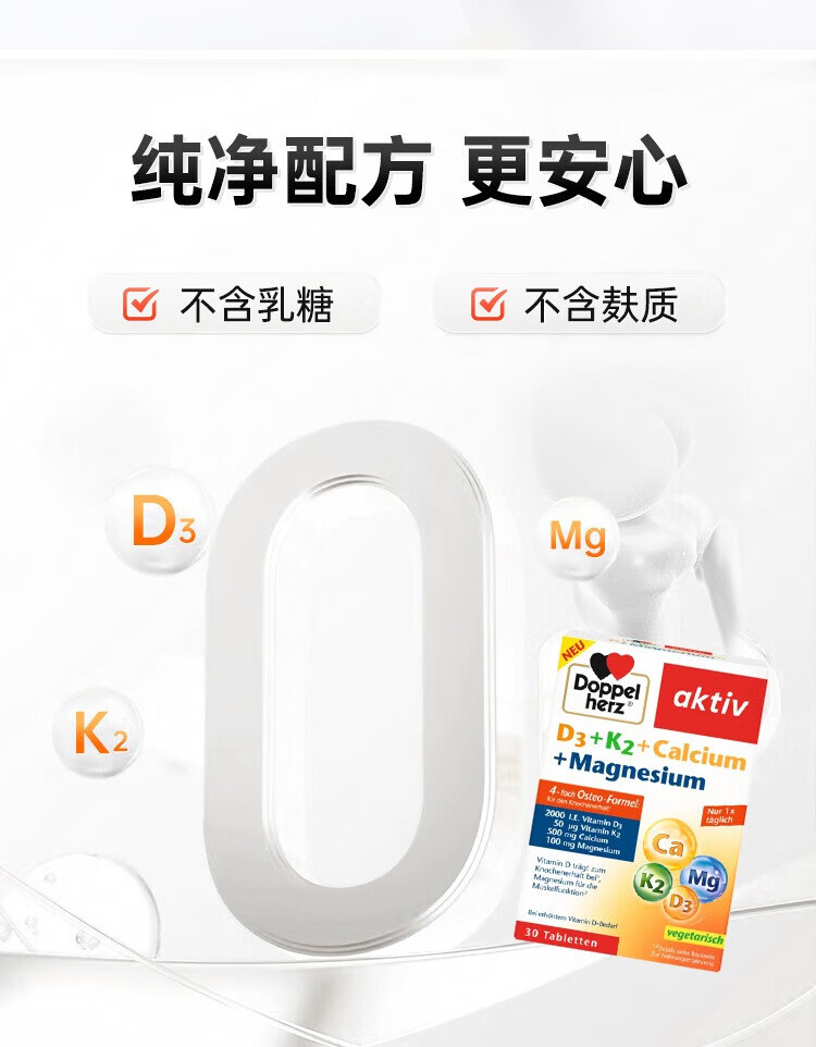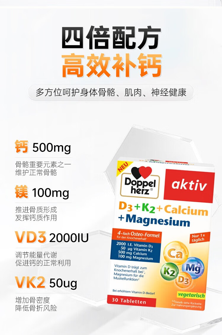 Doppelherz德国维生素D3+K2+钙+镁4合一配方补钙入骨片剂30粒 1盒 粉红色 片剂