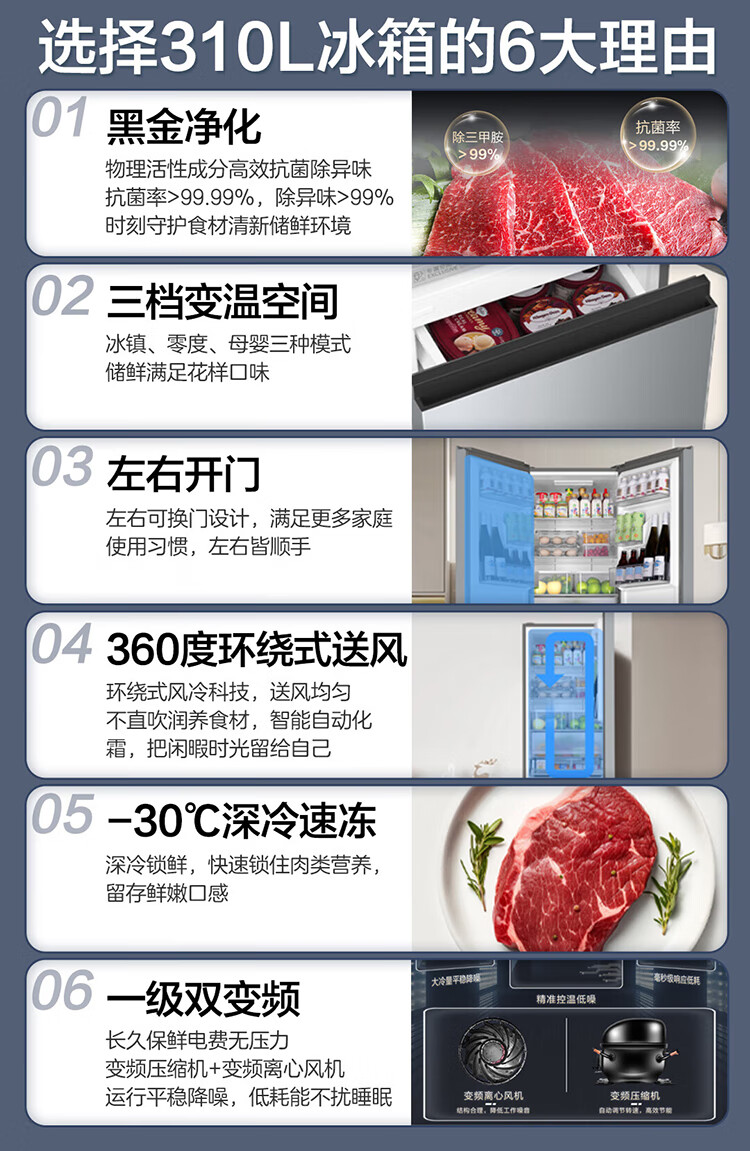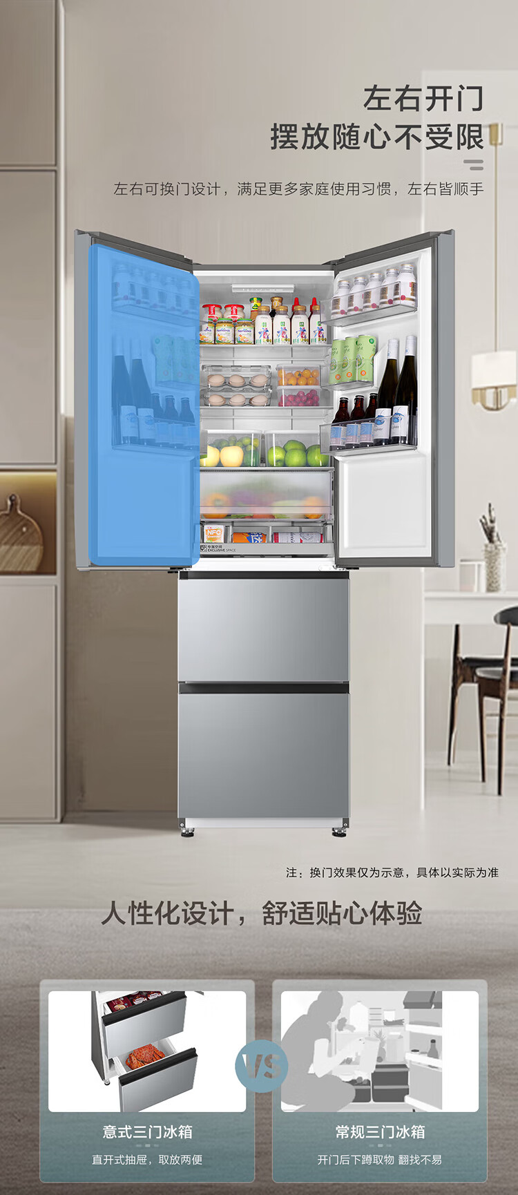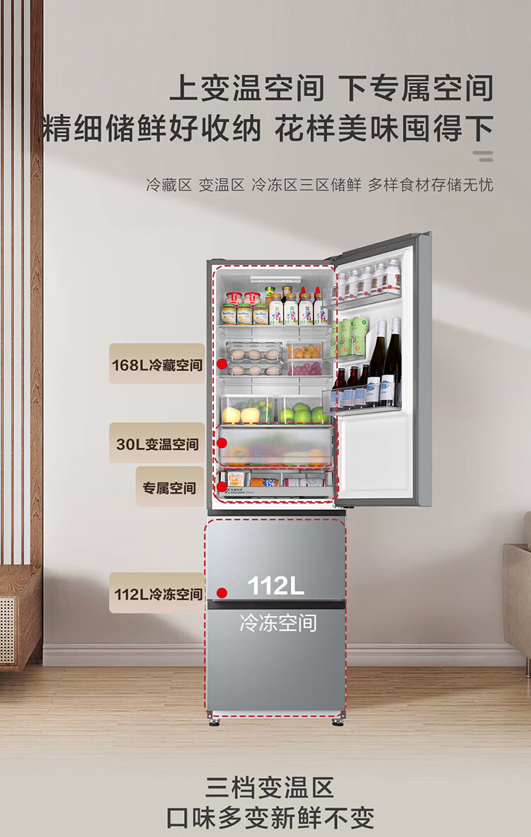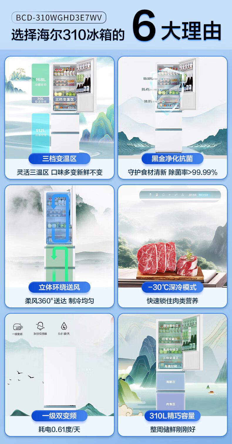 海尔(Haier)冰箱310升三门风冷无霜黑金净化三档变温一级能效双变频节能小户型租房家用大容量电冰箱补贴15% 冰河银+三档变温+黑金净化抑菌