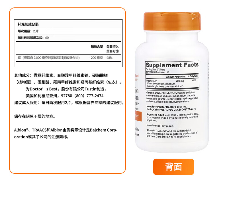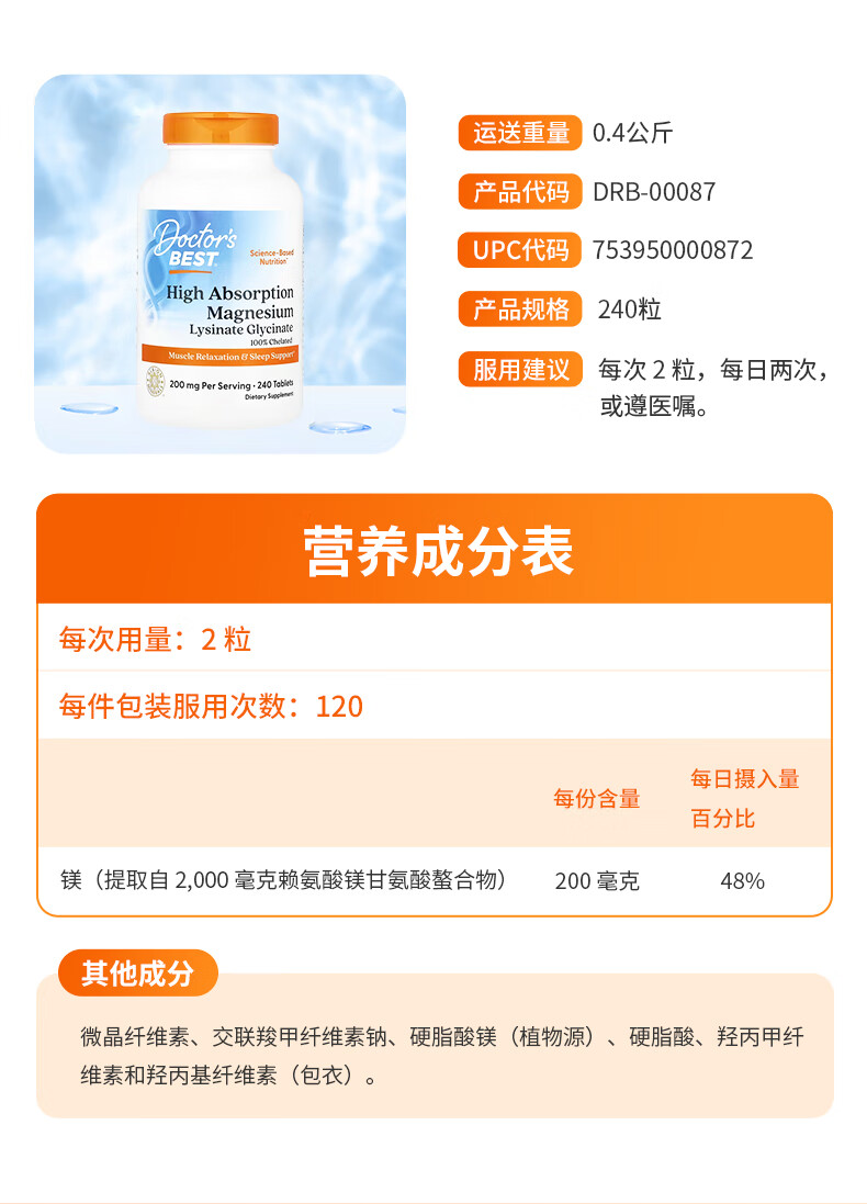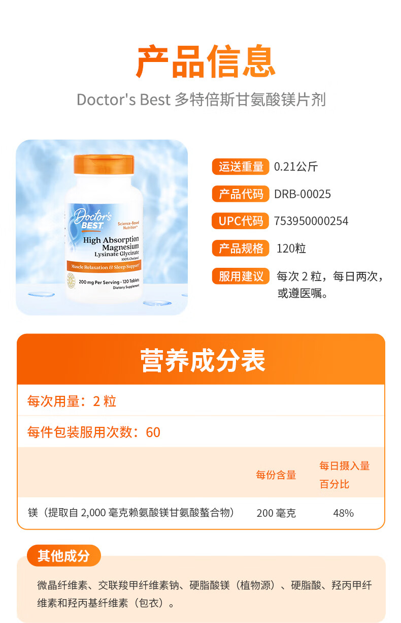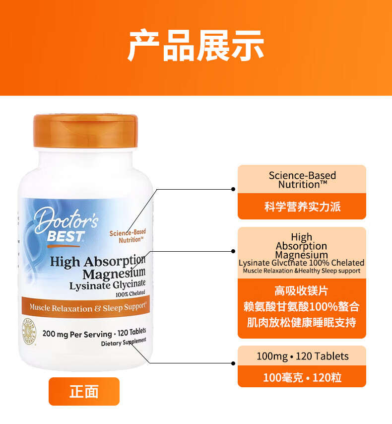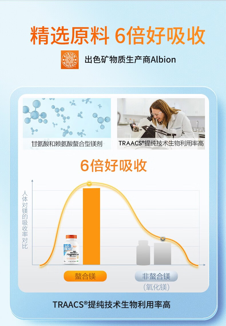 Doctor's best高吸收镁 情绪维稳神经舒缓酶系支撑 120片*1瓶