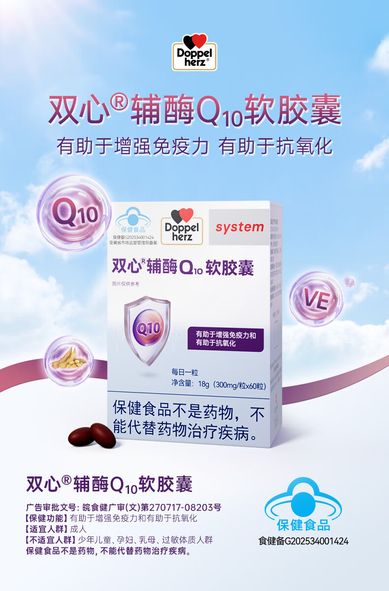 双心(Doppel herz)辅酶Q10软胶囊 增强免疫力抗氧化 蓝帽认证 辅酶Q10 蓝帽 60粒*3盒 巩固效果