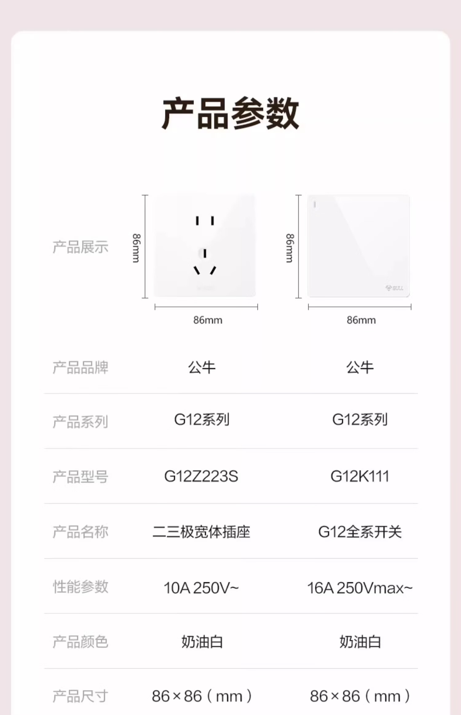 公牛(BULL)插座面板五孔带开关明装g12暮雪白全屋套装家用奶油风哑光86型 清单发客服【省心省力】全配齐