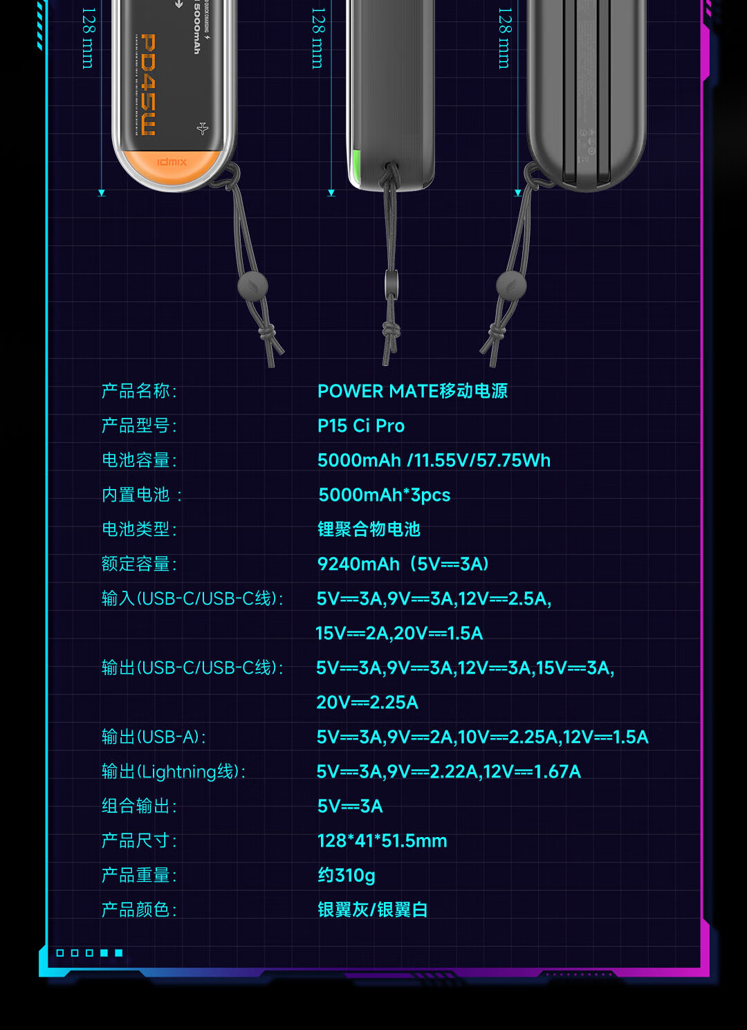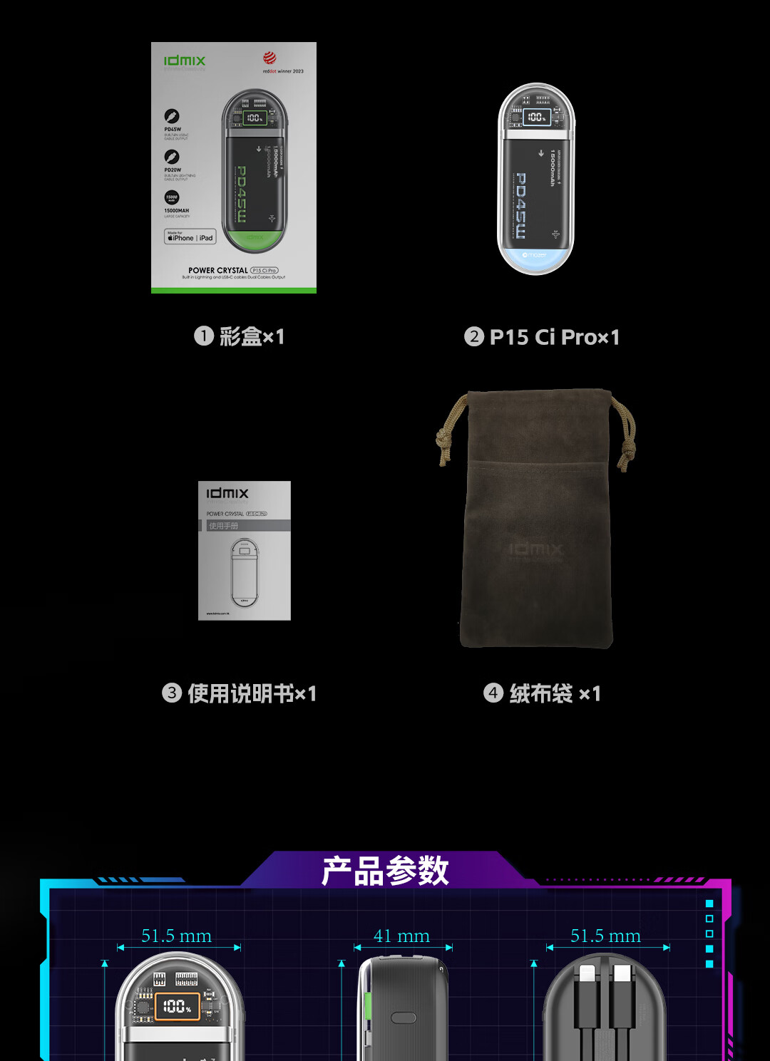 IDMIXIdmix充电宝双自带线PD45W快充15000毫安大容量MFI认证适用苹果15华为mate60 白