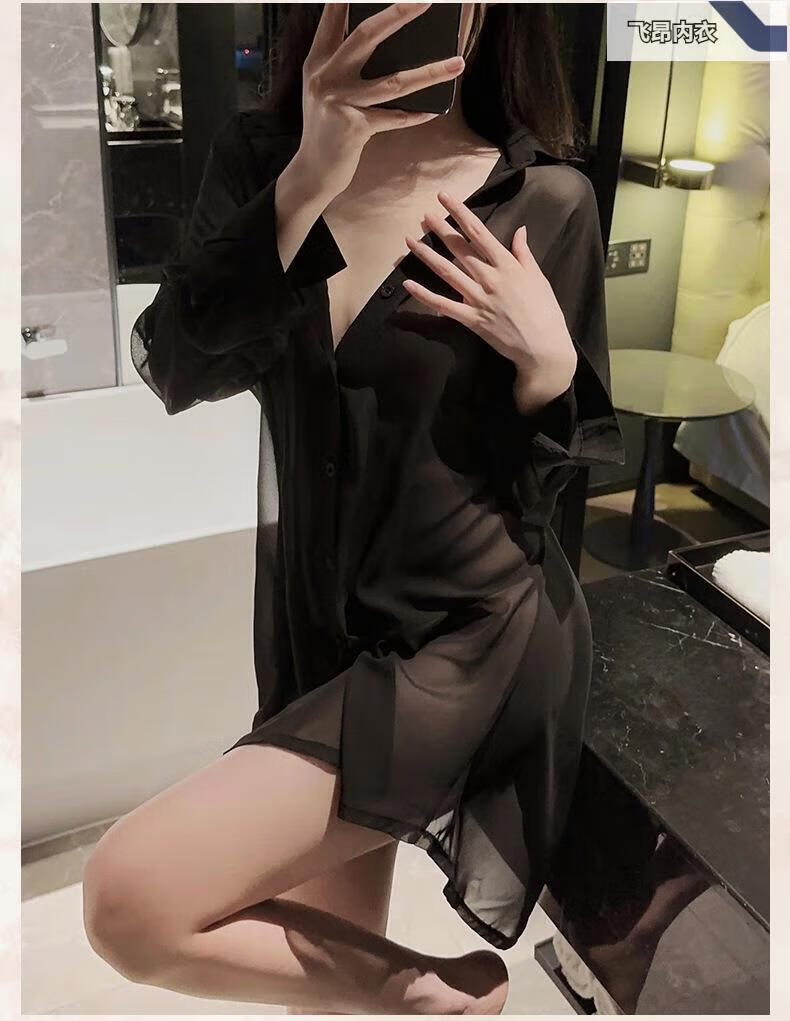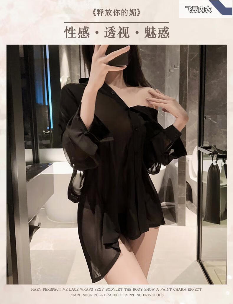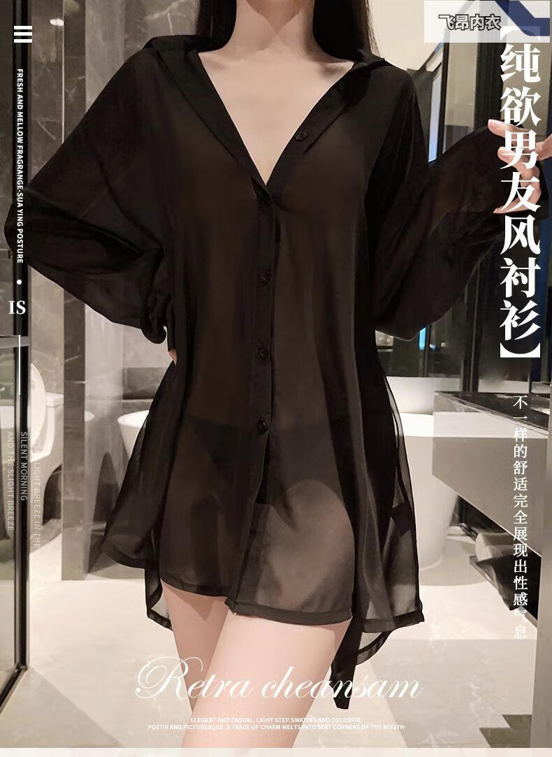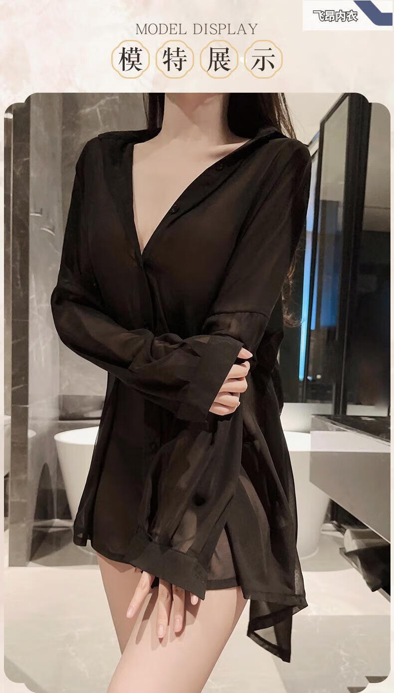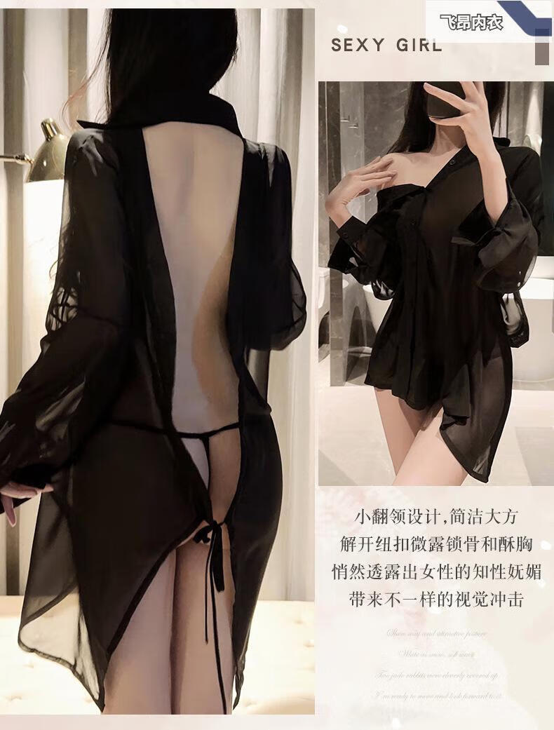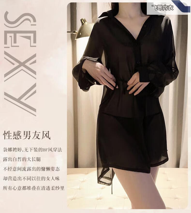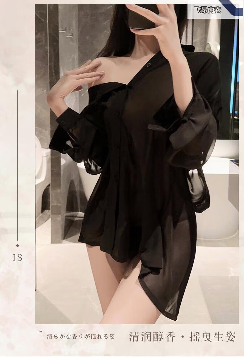 樱央内衣女性感诱惑大码露背衬衫男友风睡衣套装 黑色 M (80-130斤)