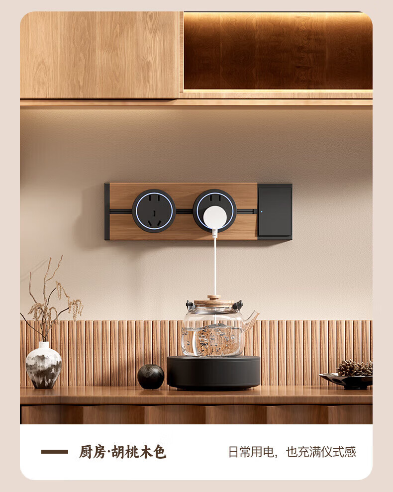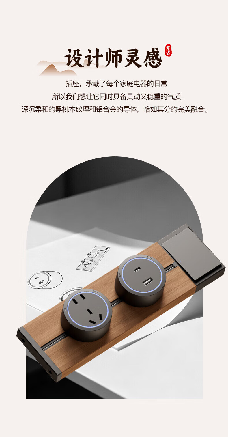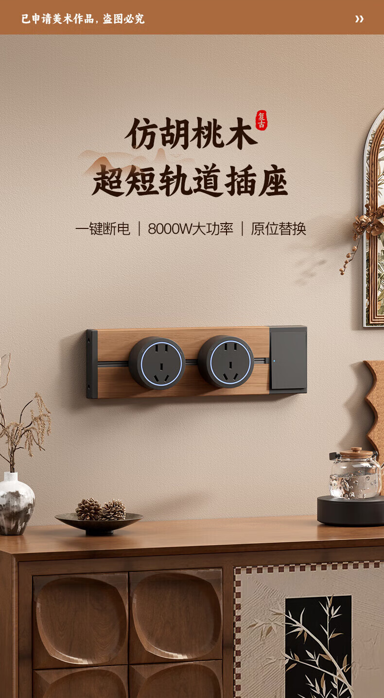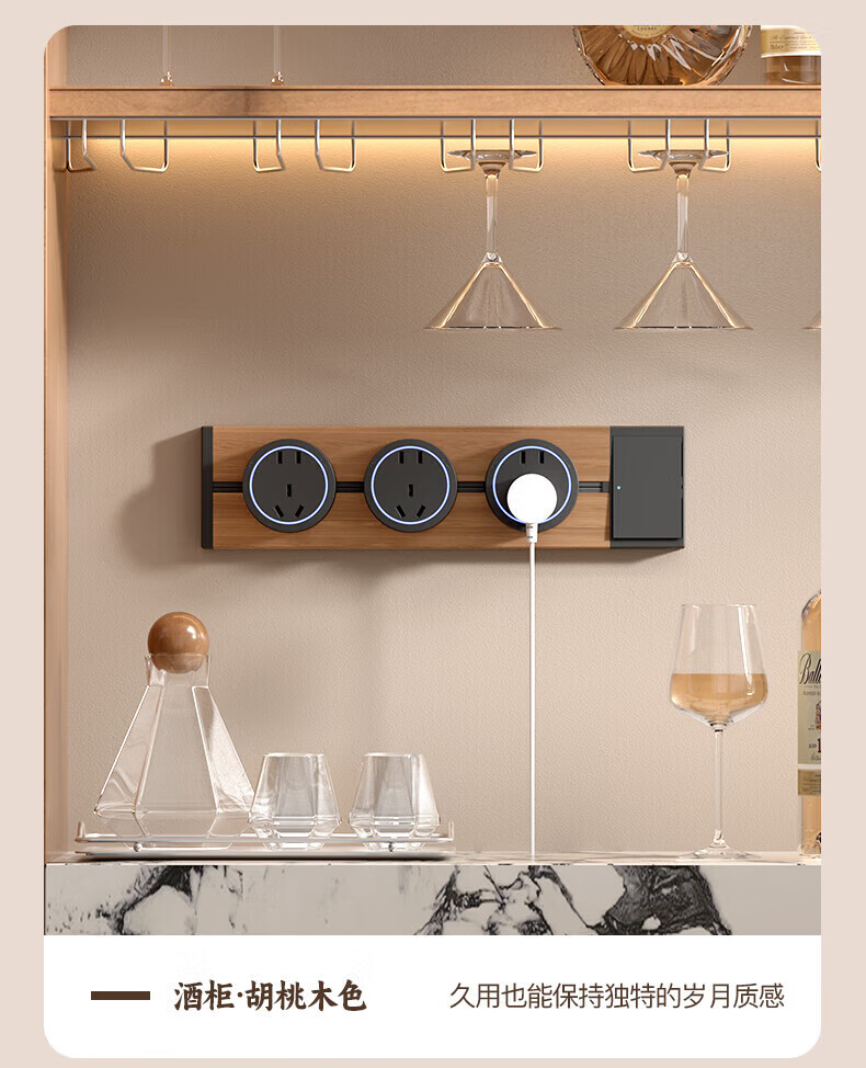 国际电工新中古风迷你轨道插座25cm黑胡桃木纹色复古超短可移动排插小尺寸 USB适配器(蓝灯)