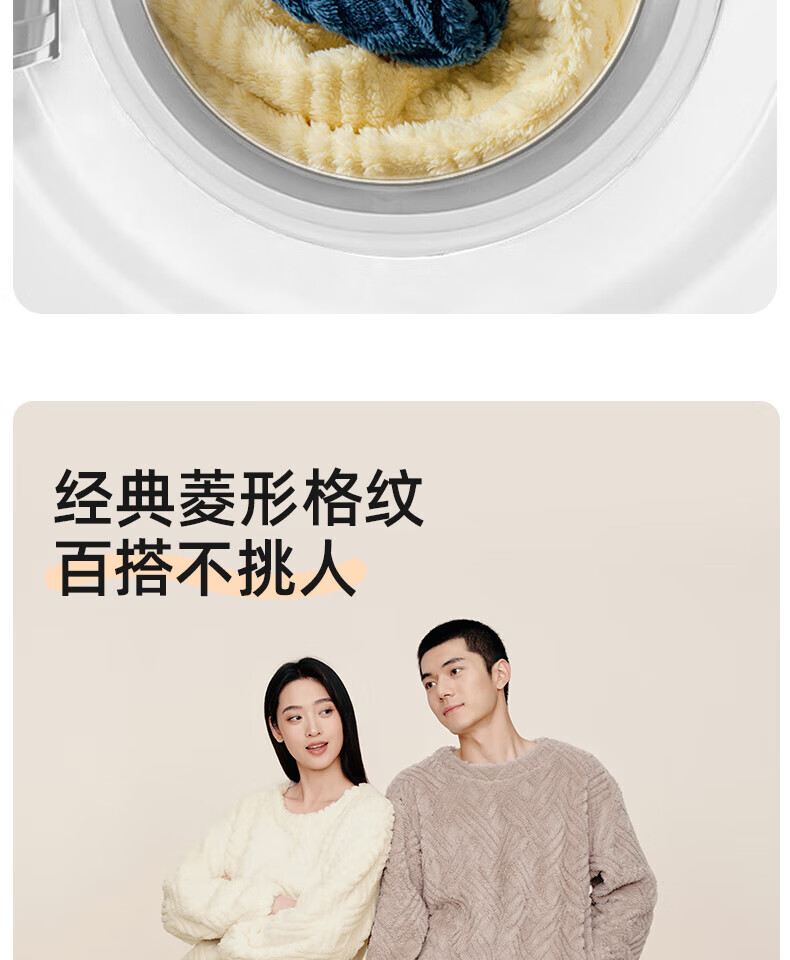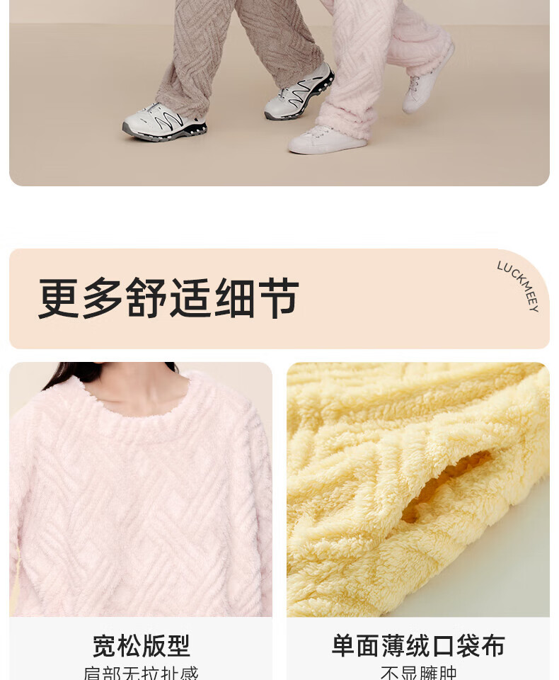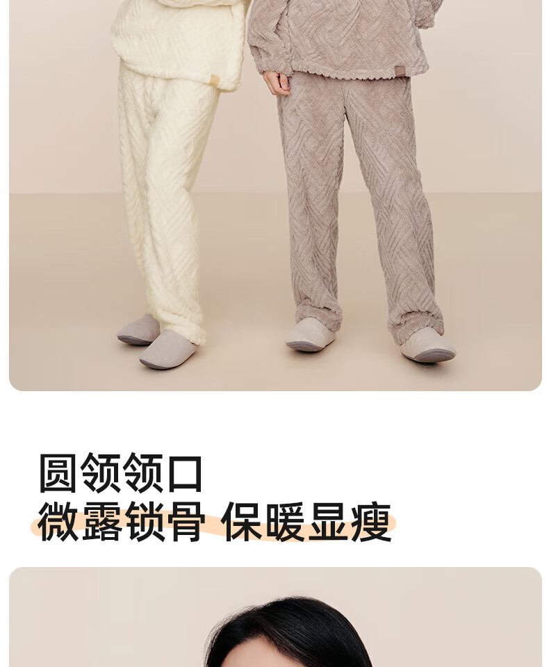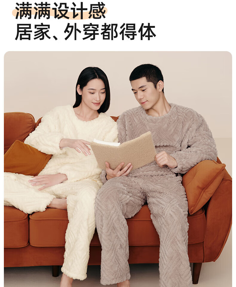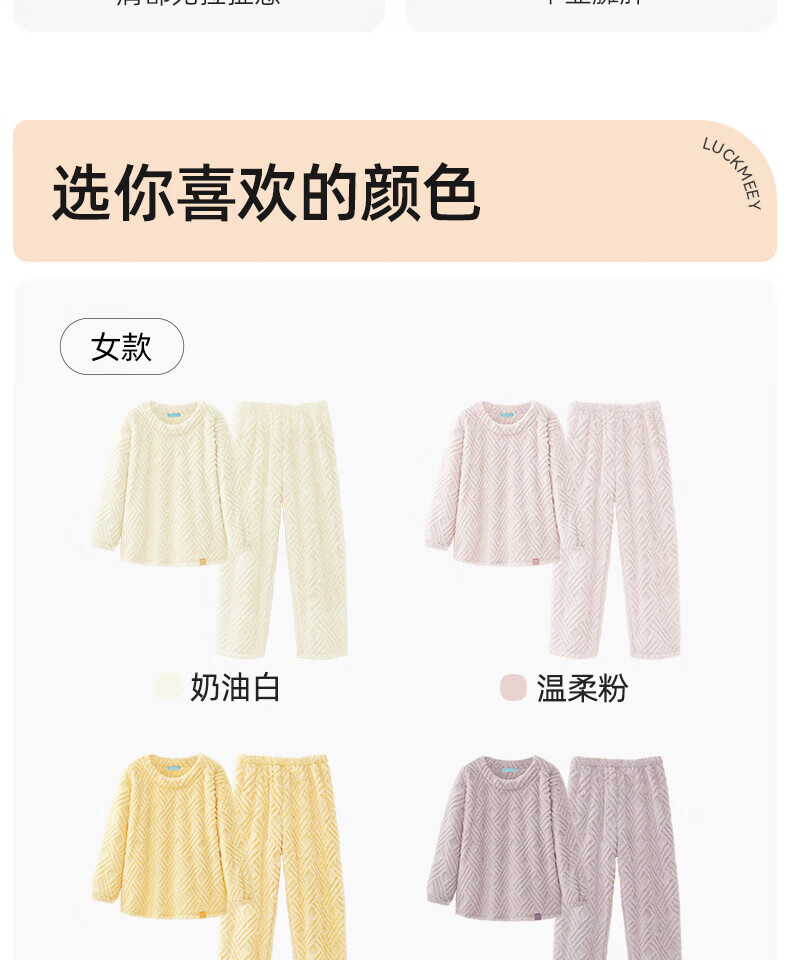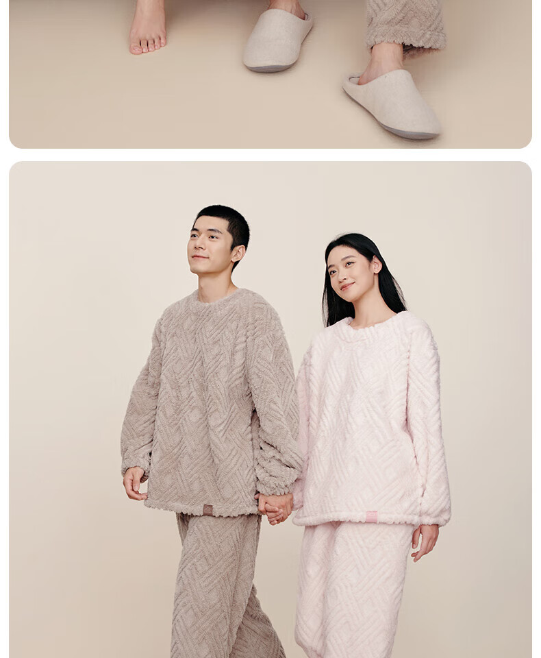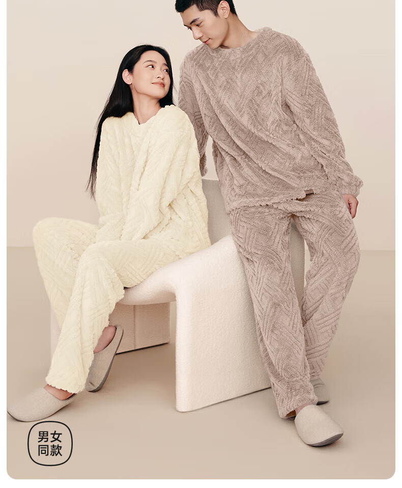 幸棉(LUCKMEEY)家居服女秋冬菱格麻花长毛绒睡衣情侣套装外穿保暖家居服男圆领 奶油白(女款) L (女100-130斤/男100-130斤)