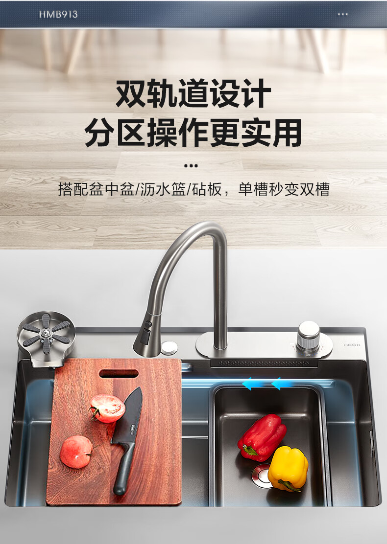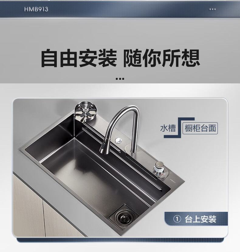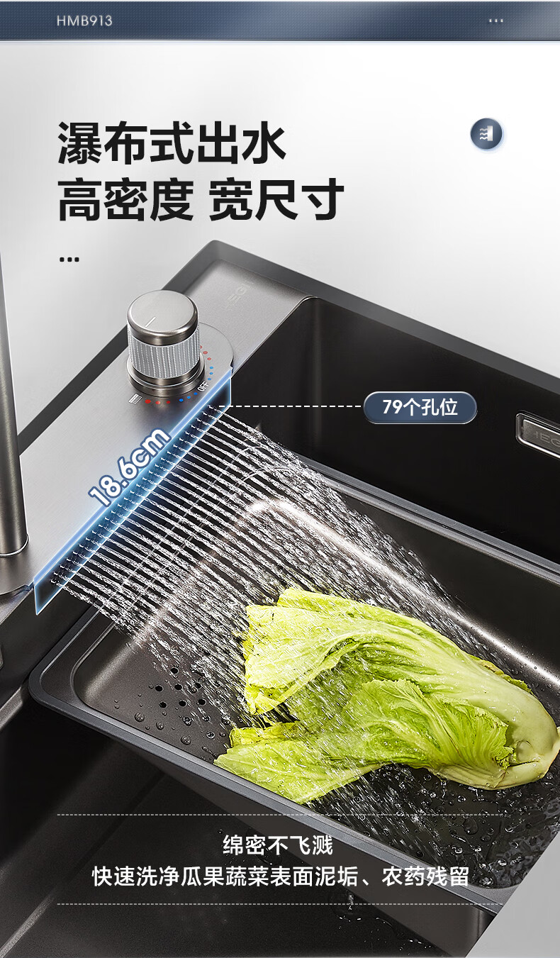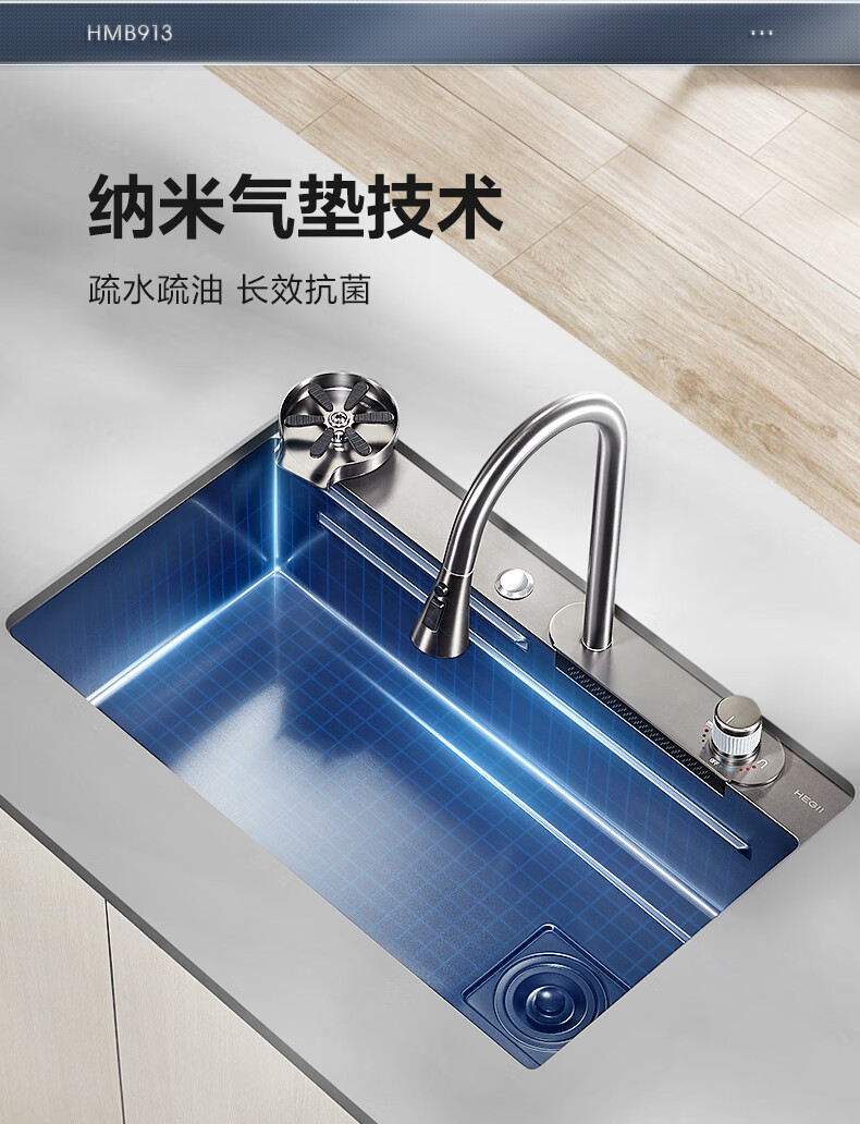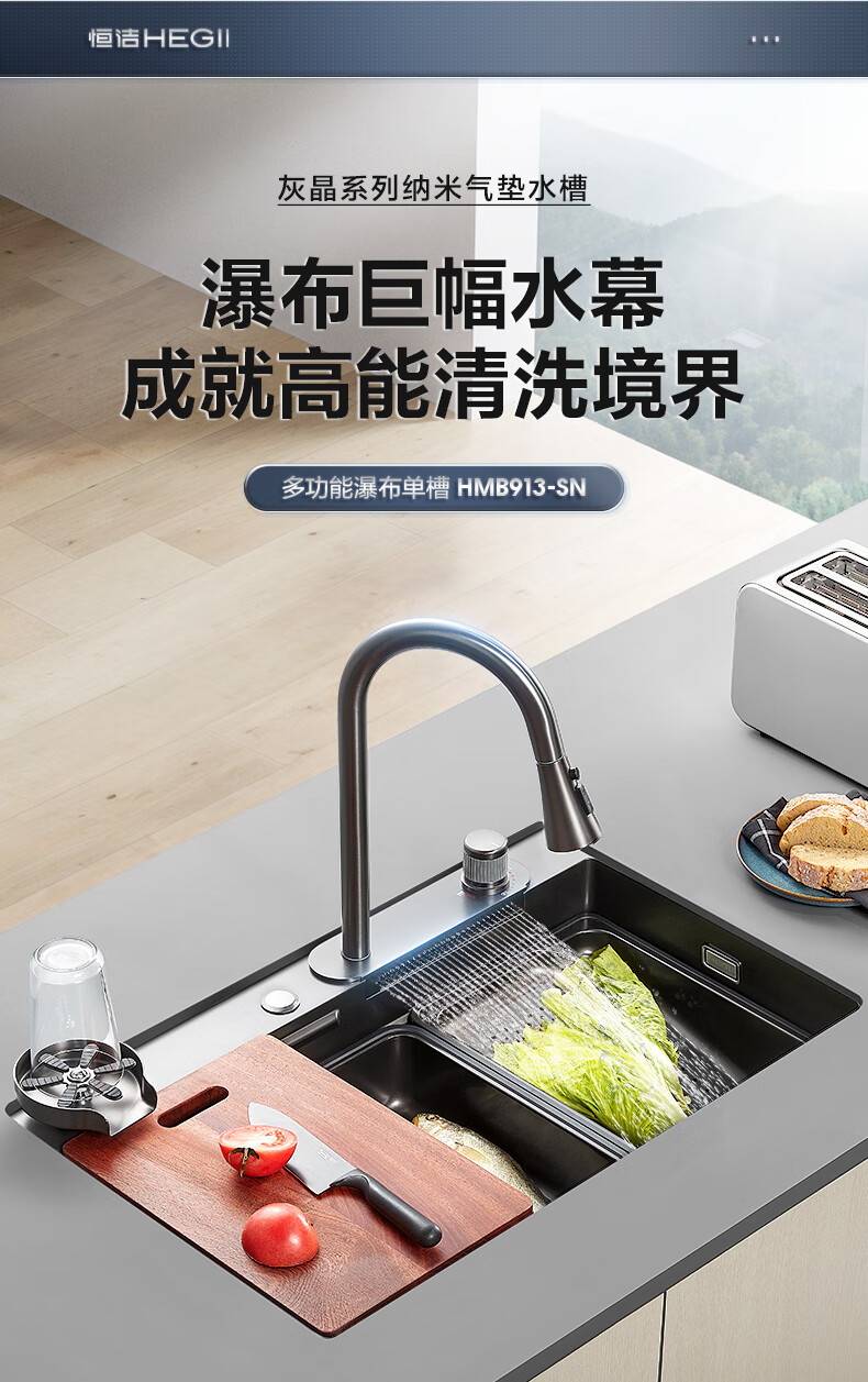 恒洁(HEGII)水槽大单槽 不锈钢纳米涂层飞雨瀑布洗碗洗菜盆厨房水槽HMB913-SN