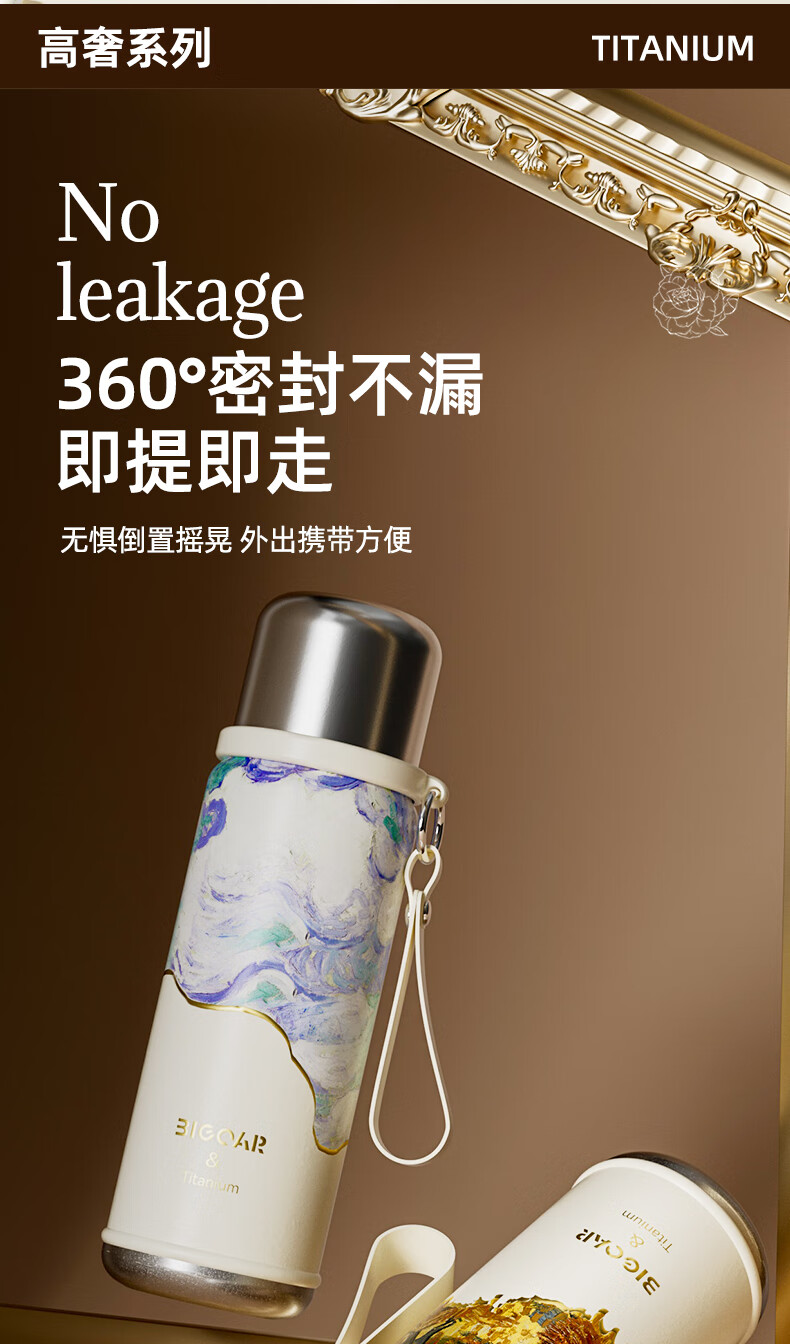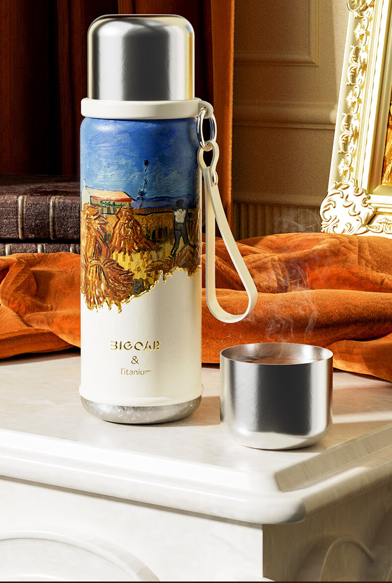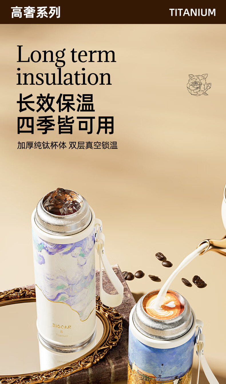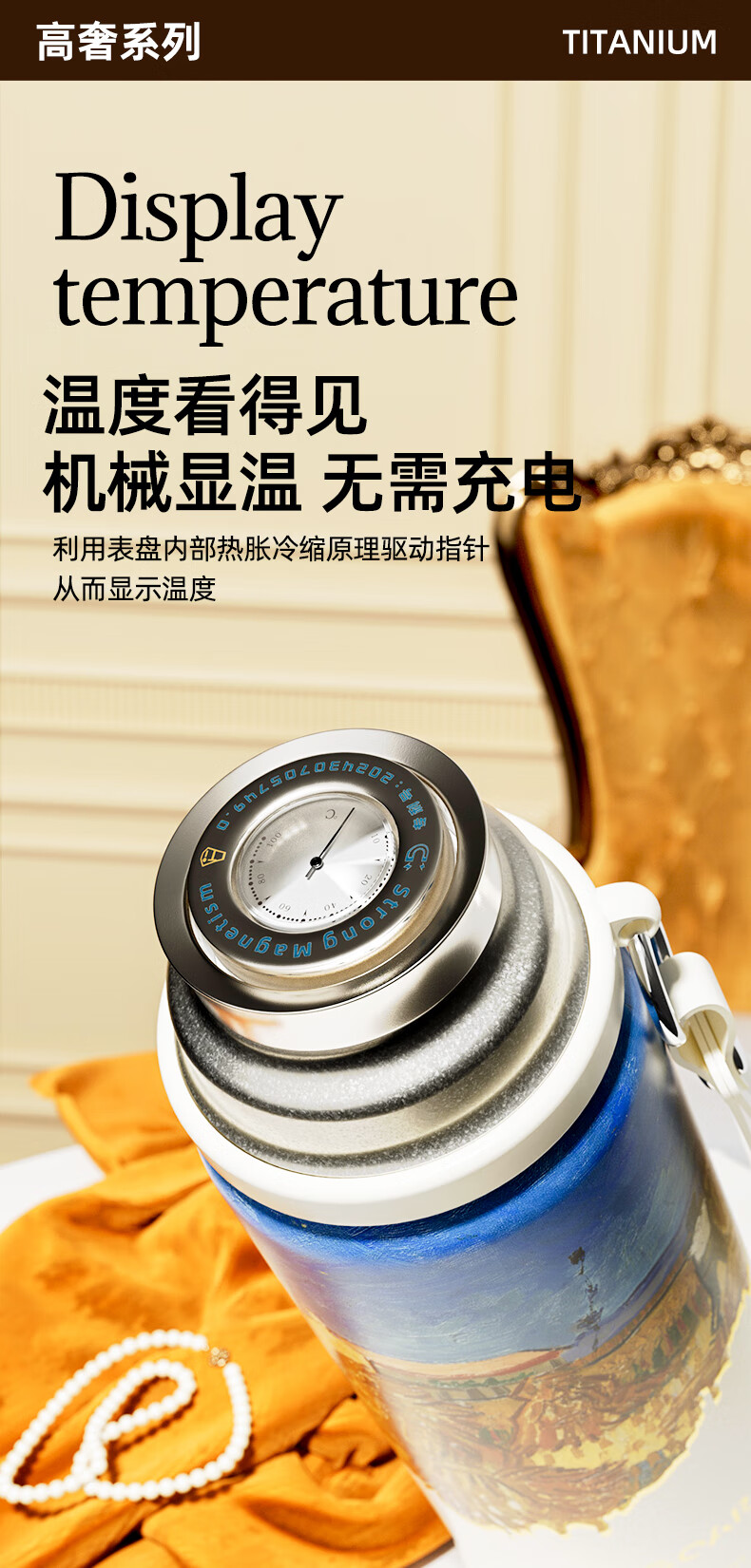 大卡纯钛保温杯大容量商务闷茶杯送礼男女高颜值便携智能温显办公水杯 梵高云朵650ml【智能显温+礼盒】