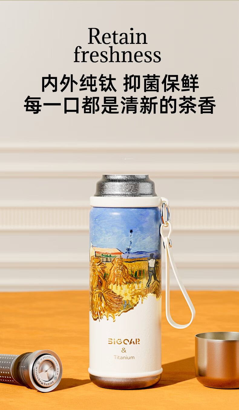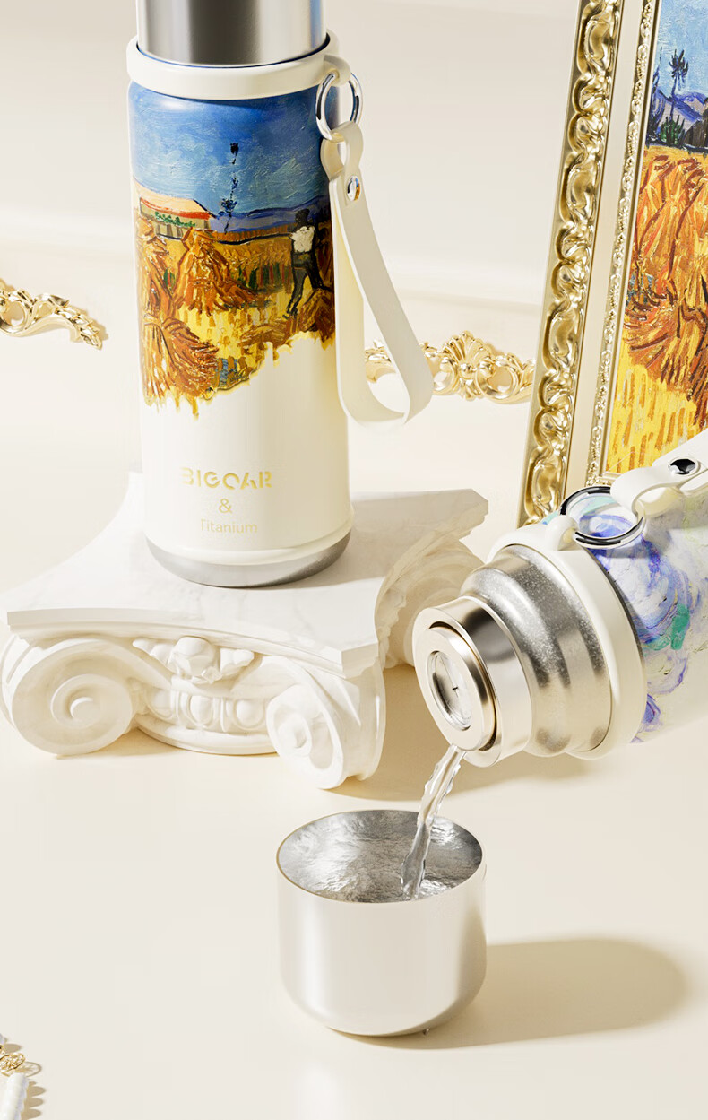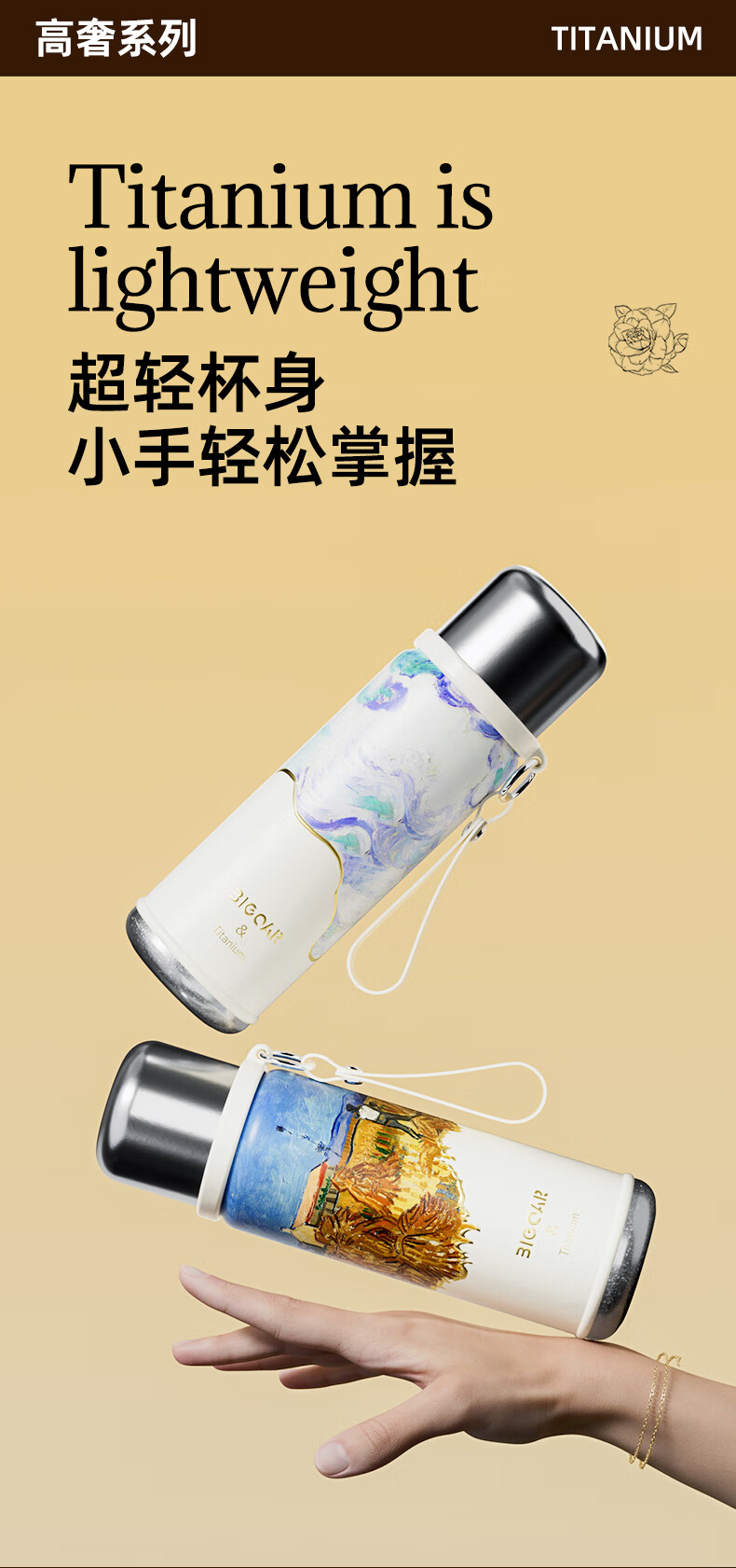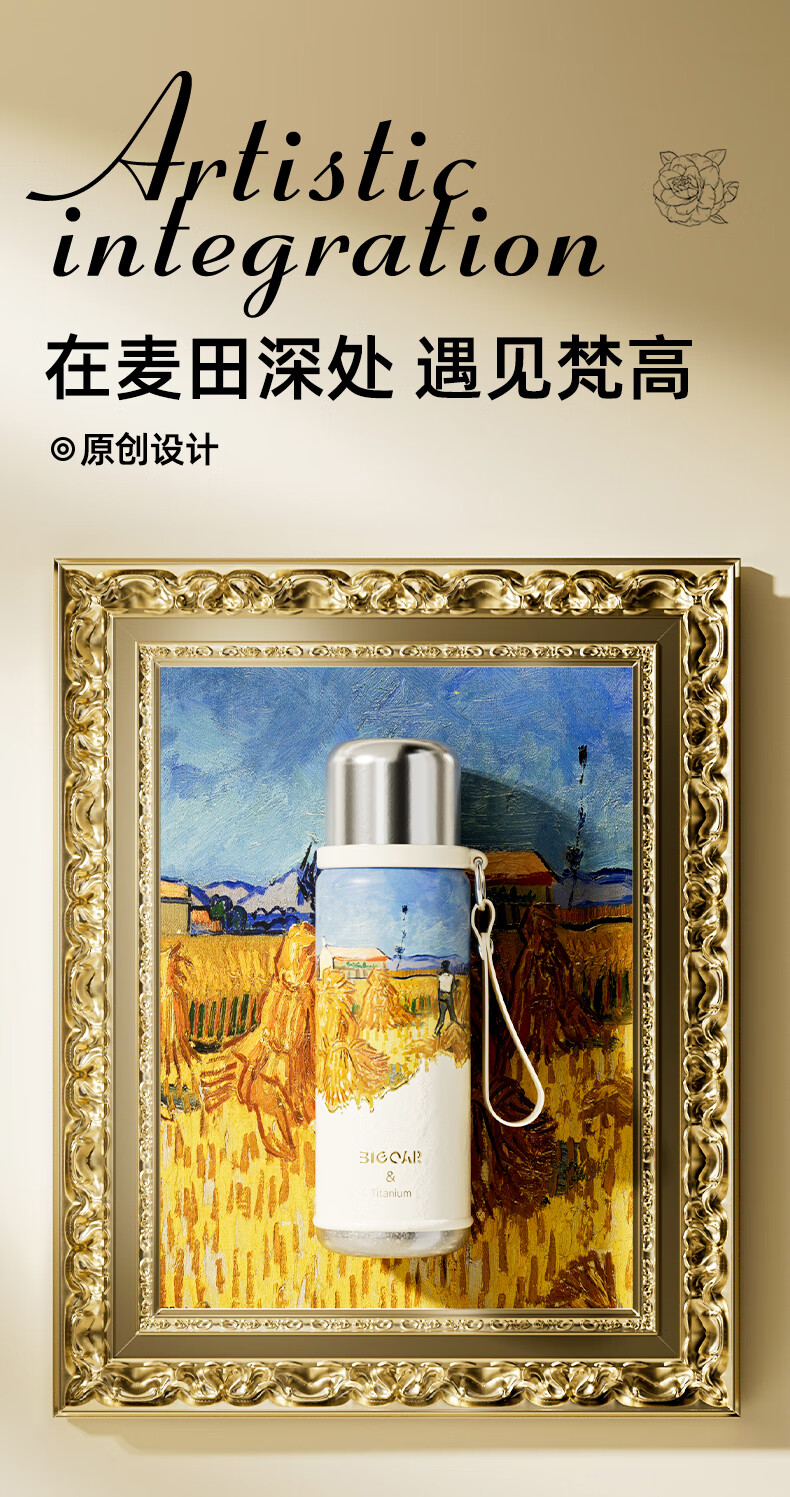 大卡纯钛保温杯大容量商务闷茶杯送礼男女高颜值便携智能温显办公水杯 梵高云朵650ml【智能显温+礼盒】